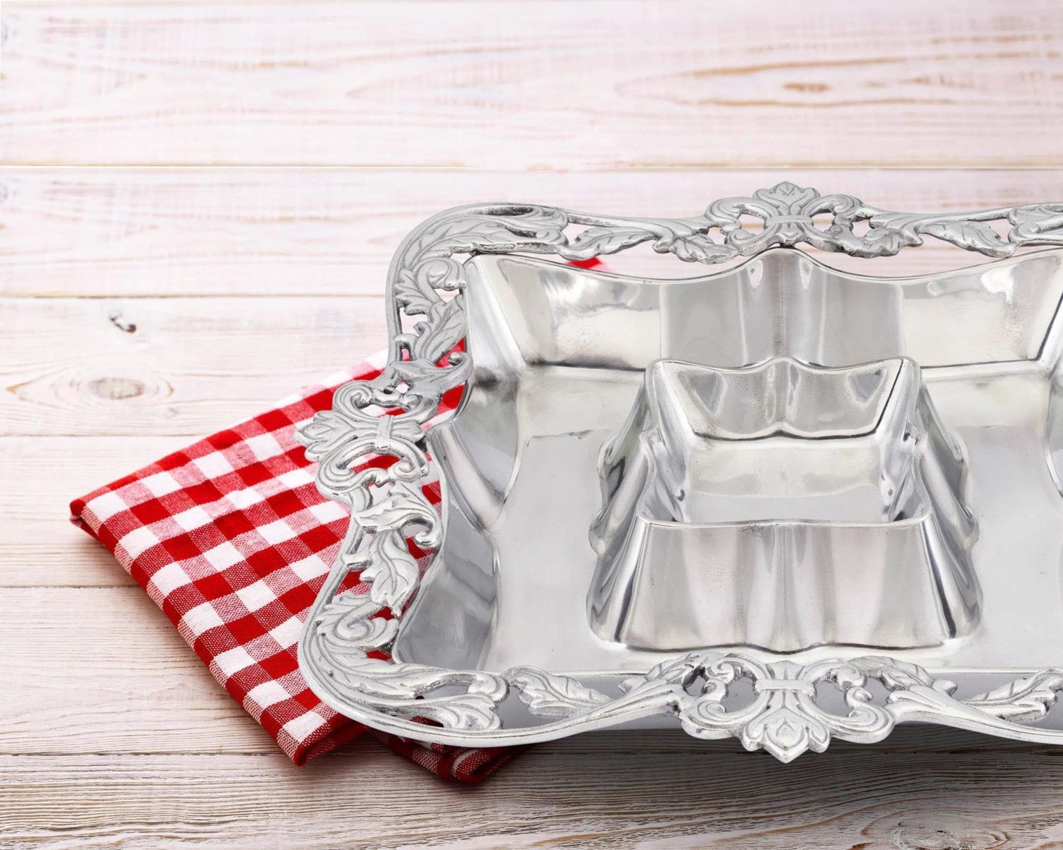 Fleur-de-lis symbols rest on each side of this piece as flourishing acanthus leaves connect them within an openwork border. The sauce bowl mirrors the shape of this design, while the entire handmade, aluminum tray displays a brilliant luster.