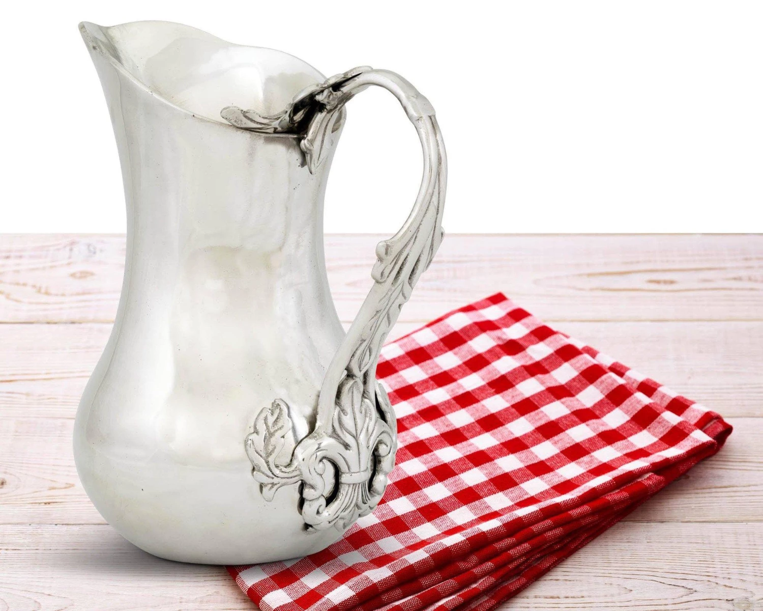 Fleur-de-lis symbols adorn the piece’s handle at each attachment point, while acanthus leaves accent these elegant emblems. Intricate flourishes run along other parts of the handle to further distinguish the handmade, aluminum pitcher’s smooth body.