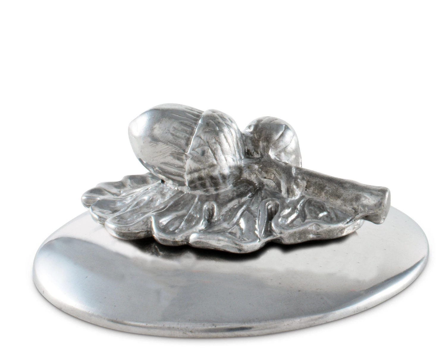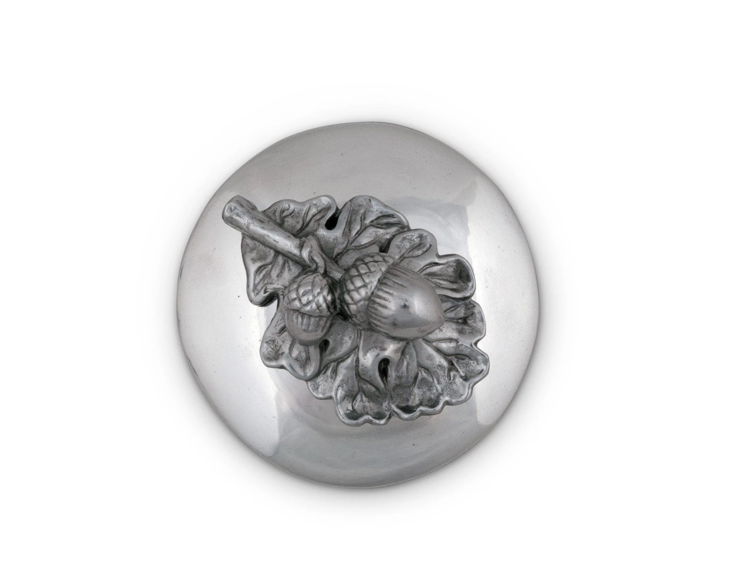 A detailed still-life of an acorn upon a bed of oak leaves provides finial / handle for this lovely, hand-crafted forest theme napkin weight. Anchored by a 3.5-inch aluminum disk to provide ample cover and weight to keep a stack of napkins orderly even when enjoying a breezy al fresco gathering.