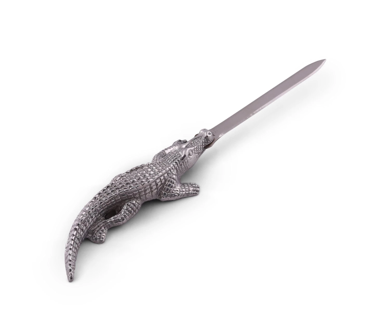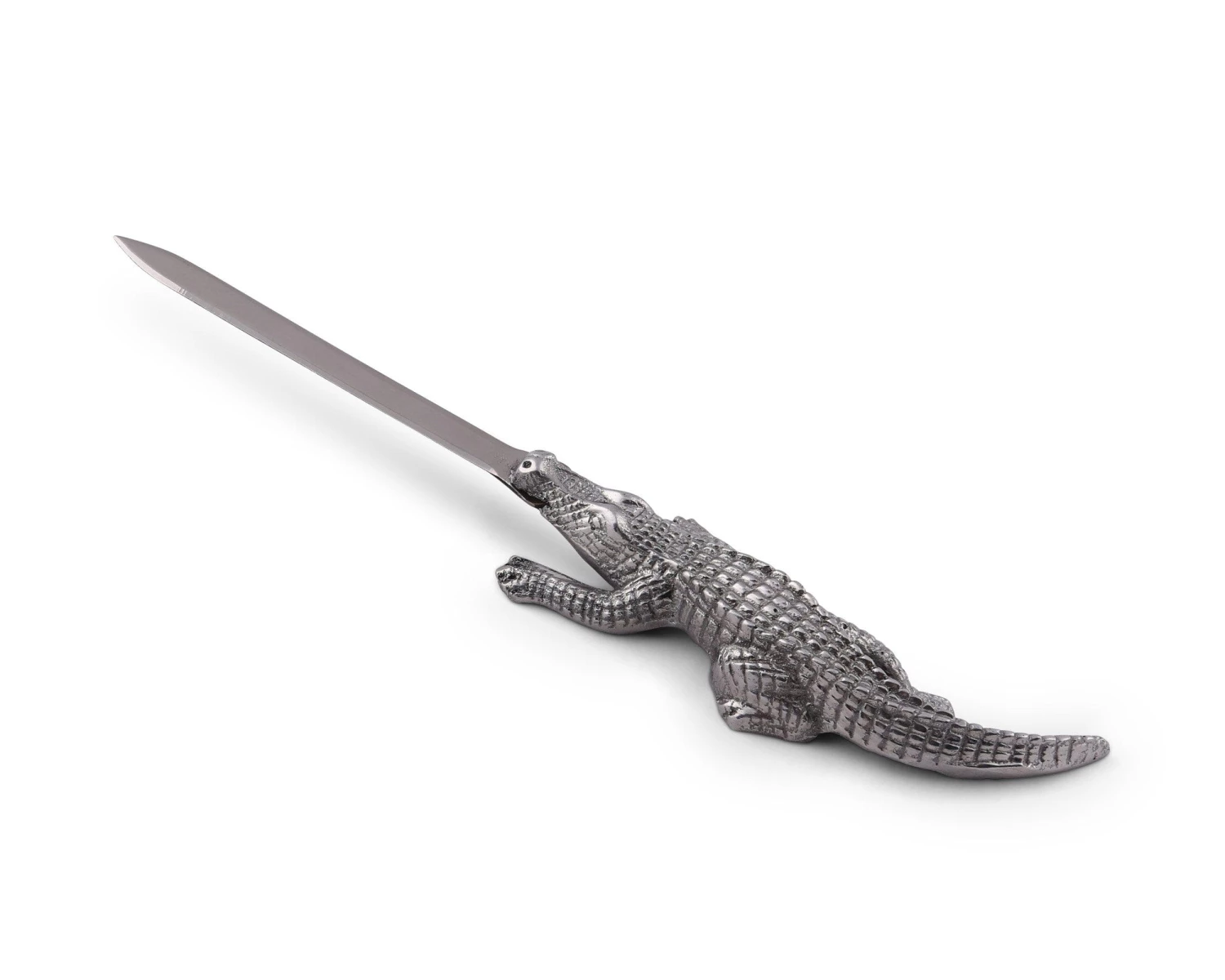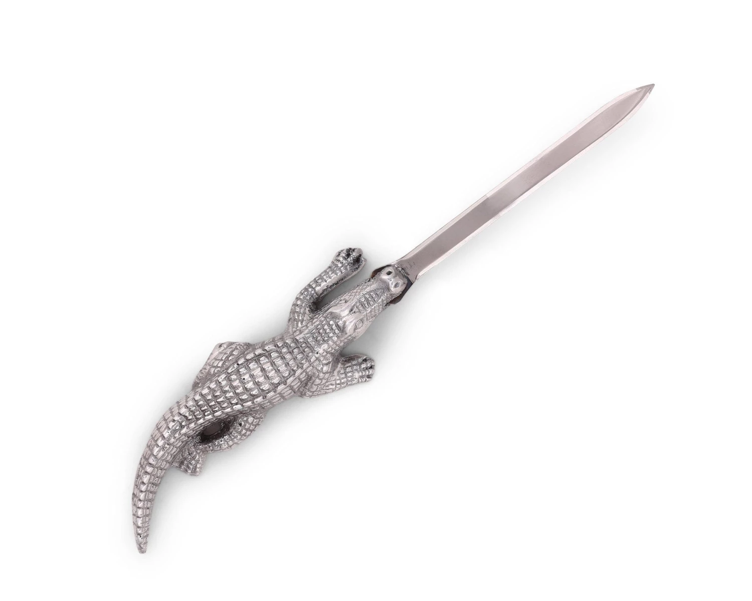 Quickly slice through glued envelopes with this Arthur Court letter opener, which features a sleek blade held within the strong jaws of an alligator. No paper fold is safe thanks to the stainless steel blade that cuts paper but not fingers. The length of the blade makes it easy to cleanly open small and large letters, packages and other correspondence. This studious alligator’s mouth firmly holds the blade as you sort through daily mail piles. The sand-casted aluminum alligator handle has sharp detailed scales along its body, legs and swishing tail, and it fits firmly in hand to tackle any envelope. Place this alligator letter opener on a home office desk or foyer table to add a bit of wild adventure to the decor and startle guests.
