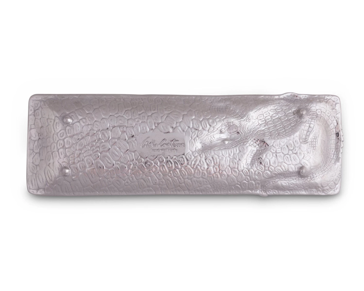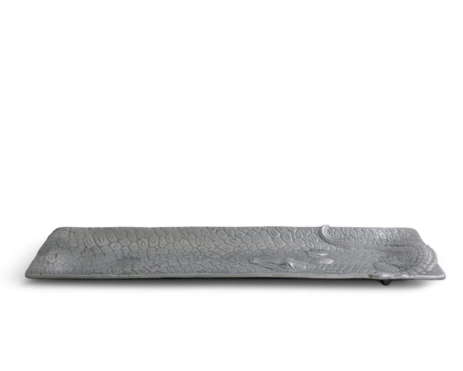 A large, alluring alligator waits in anticipation for the food to arrive on the left side of this dish, its long tail swishing along the edge. Handcrafted in sand-cast alulminum, this tray makes a great gift at a nice price!