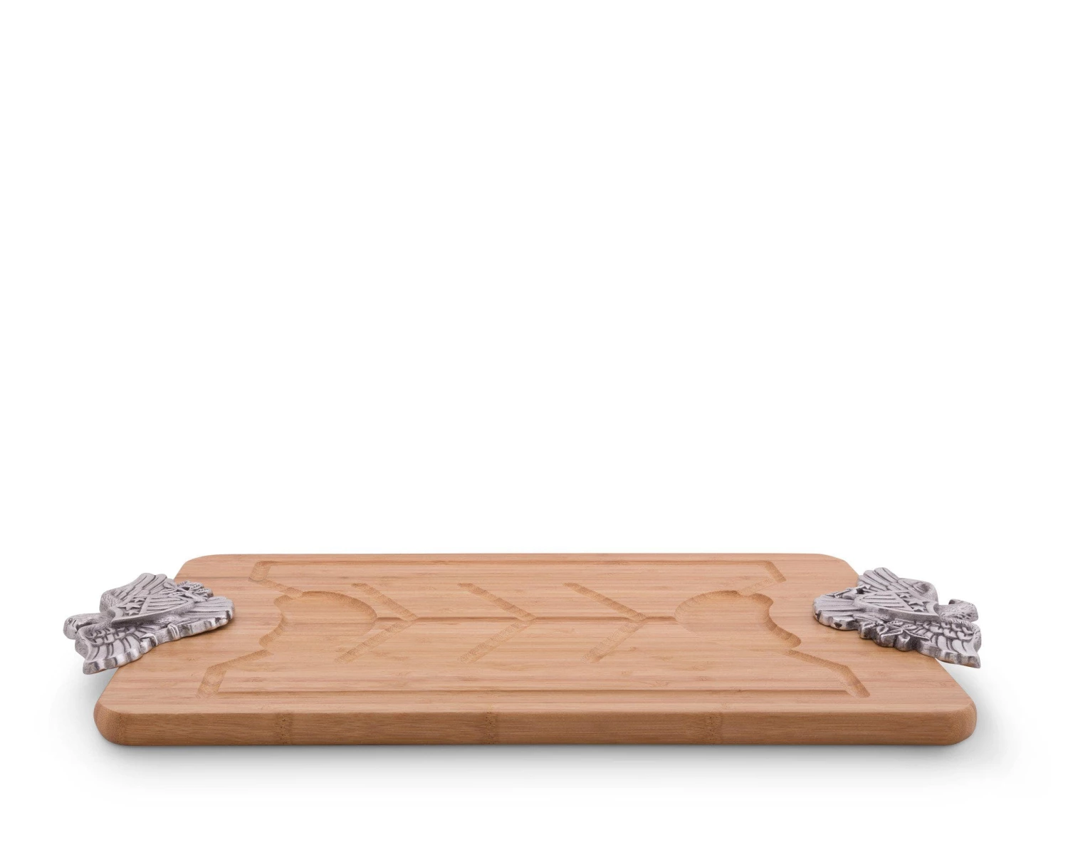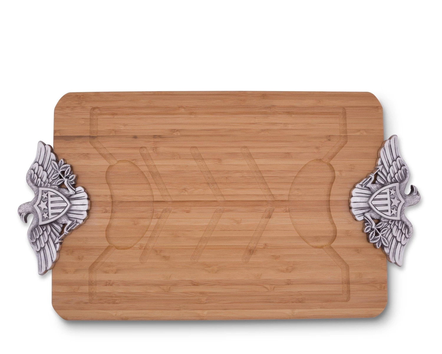 Carve and serve an all-American feast of ribs, turkey, beef, pork or venison roasts on Arthur Court’s generously sized, Acacia hardwood carving board. Aluminum handles have a detailed version of the Bald Eagle holding arrows and olive branches found on the Great Shield of the United States.