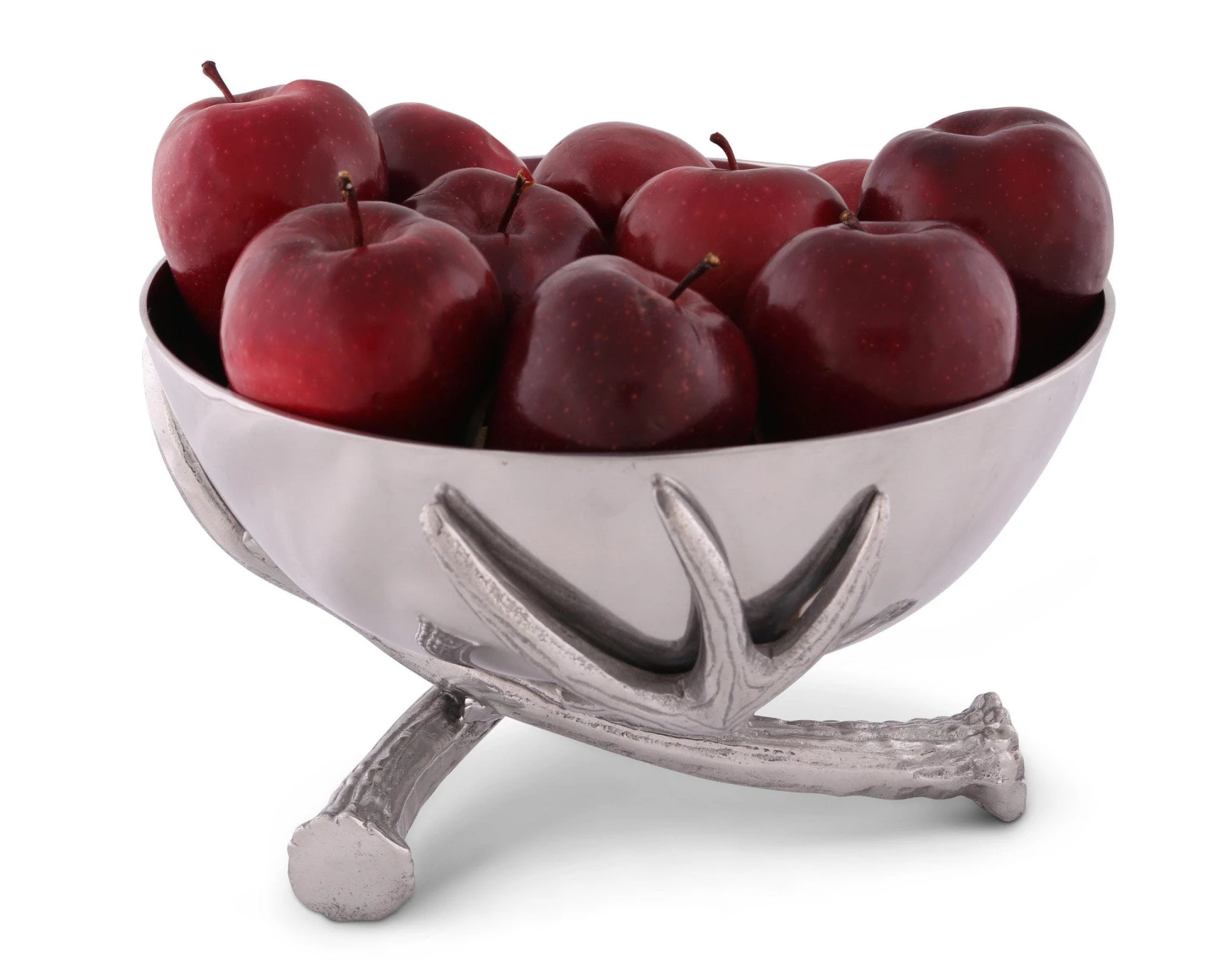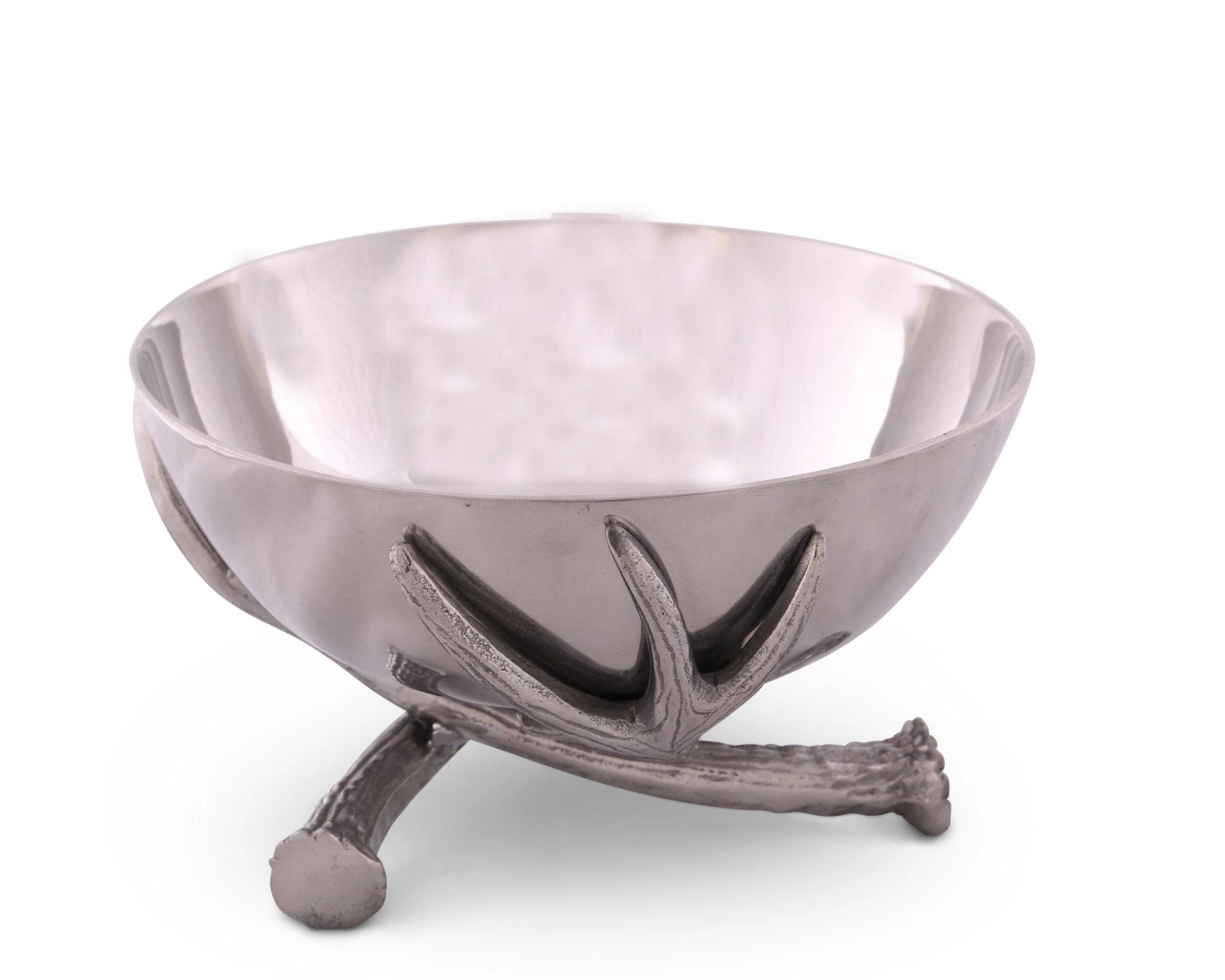 The three-tiered base features antlers crossing on top of each other to support the gleaming bowl. Handcrafted in sand-cast aluminum, this piece’s unique design and realistic detail won’t go unnoticed.