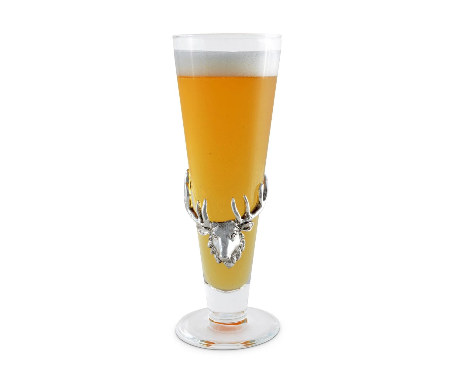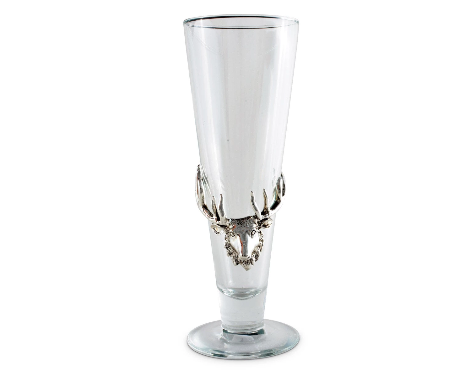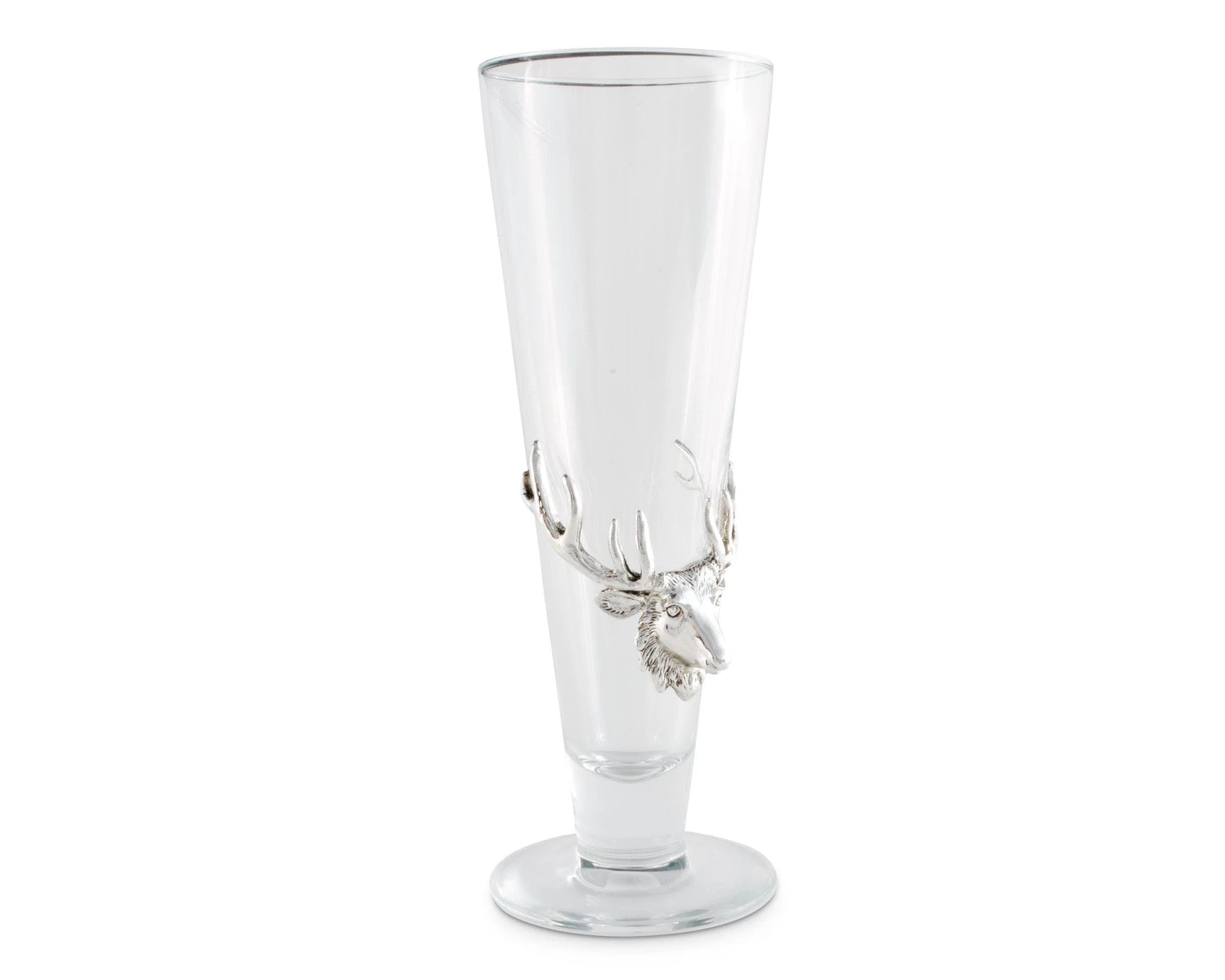 Showcase your beer in the best possible light with this aesthetically pleasing antler-embellished pilsner glass, which includes a glass tray to lend flair to your service. A high-shine silver-tone sand-cast aluminum elk buck head plaque adorns the front, bringing lodge-style beauty to your rustic entertainment space. The cone-shaped design supports beverage clarity, while the wide 3-inch-diameter top promotes improved head retention and easy pouring. The sturdy base keeps this 9.25-inch glass stable during pouring, serving and sipping. Rely on the narrow bottom to help prevent fizz for your drinking enjoyment, and depend on the fluting to waft the rich aroma up with each tip of the glass. Great for pilsners, pale lagers and Kolsch-style brews, this 14-ounce clear glass makes a great gift for beer enthusiasts and comes in a gift box for a chic presentation.