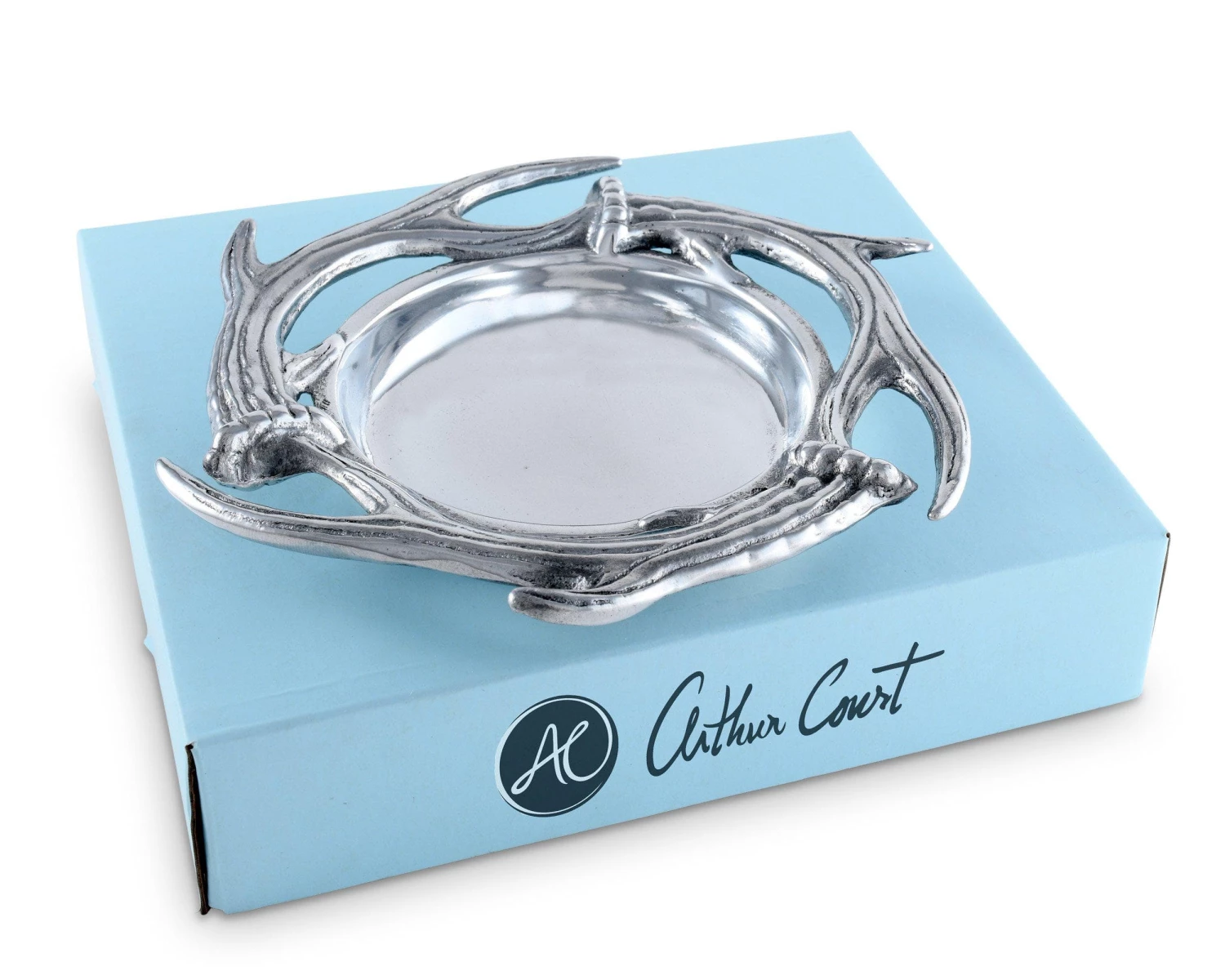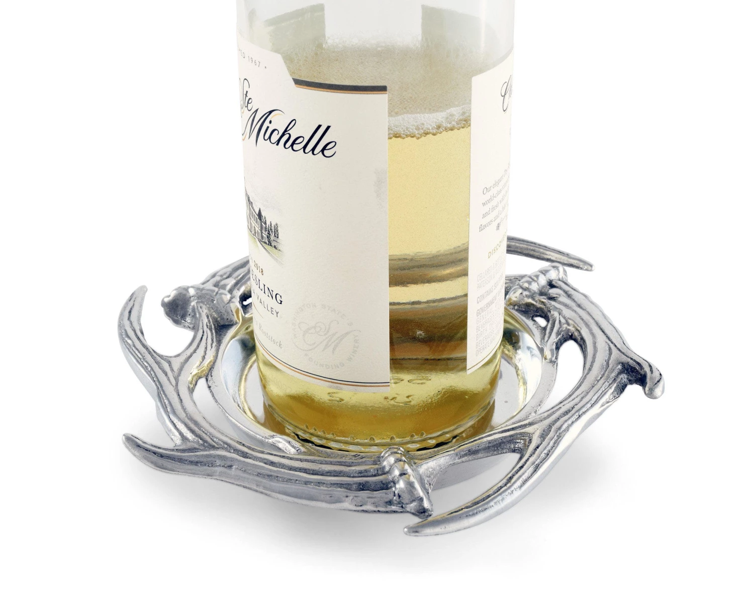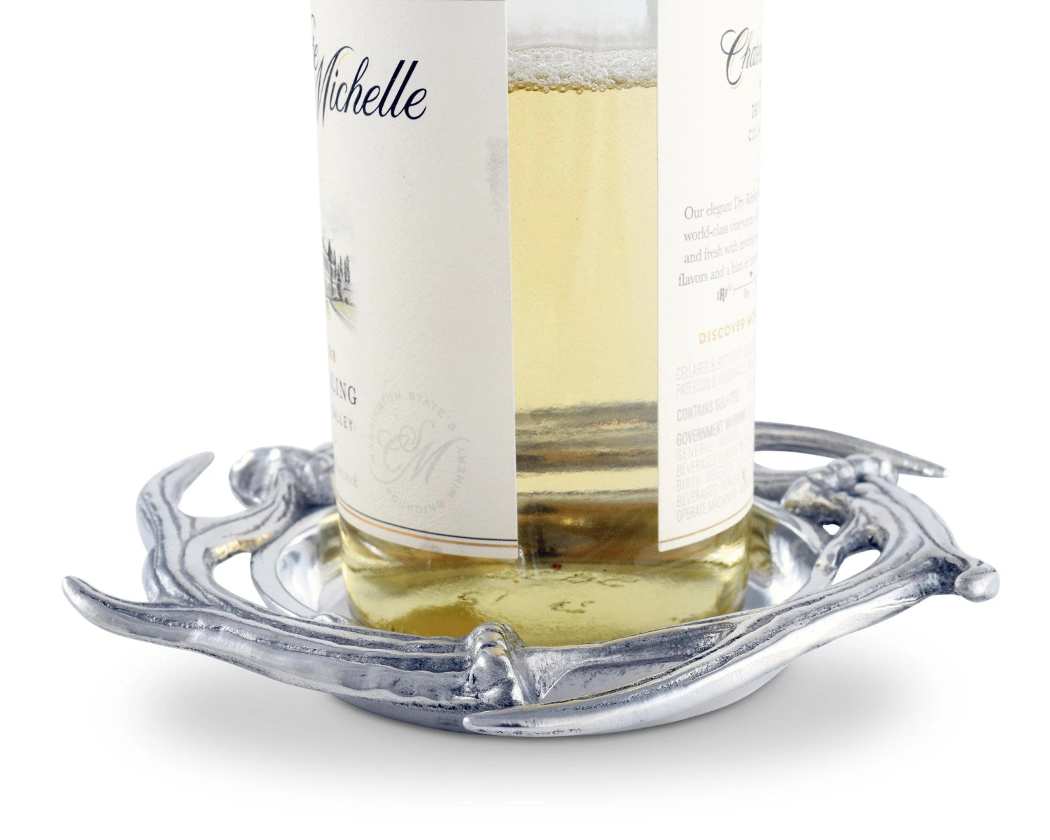 Re-energize the standard surface protector with the rustic design of Arthur Court’s Antler Wine Coaster.
