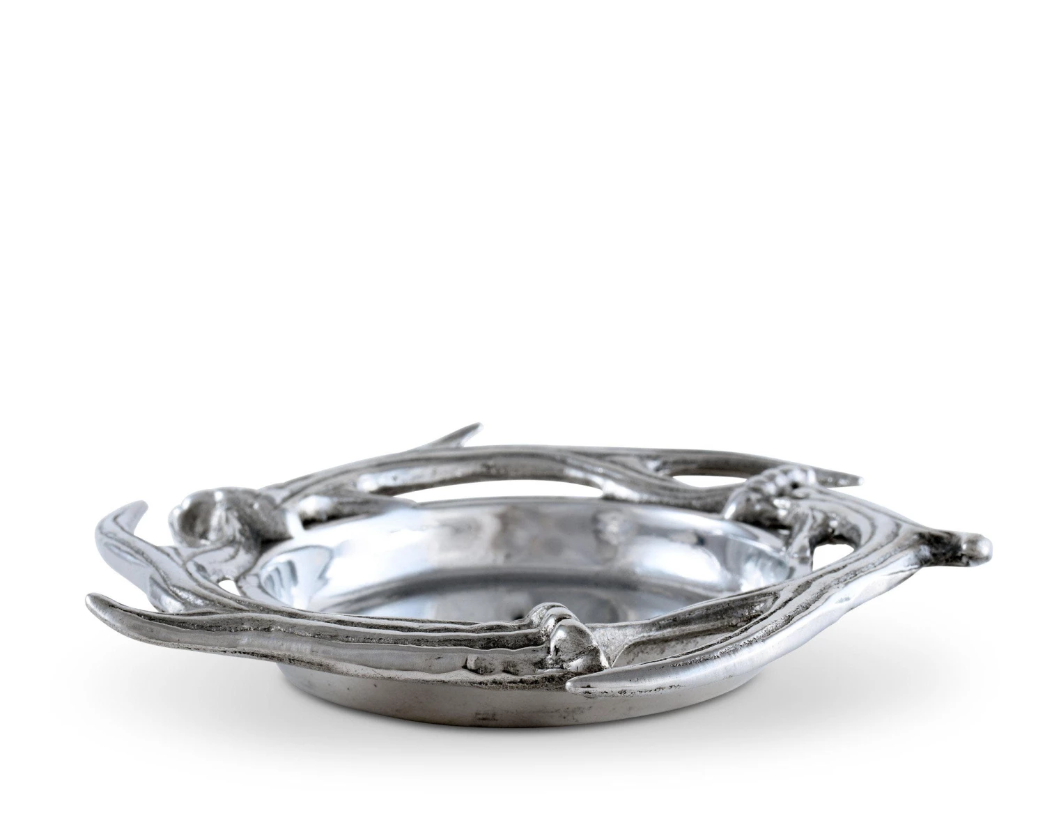 Antlers encircle the coaster as point and burr connect in a flowing, sophisticated symmetry. The exquisite, realistic detail within the antlers contrasts beautifully with the gleaming interior of this handmade, aluminum coaster.