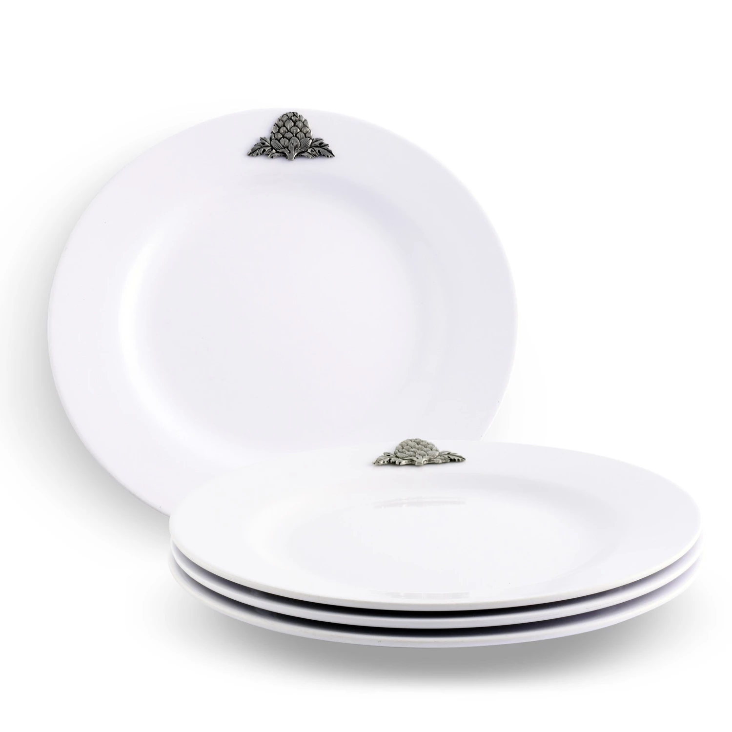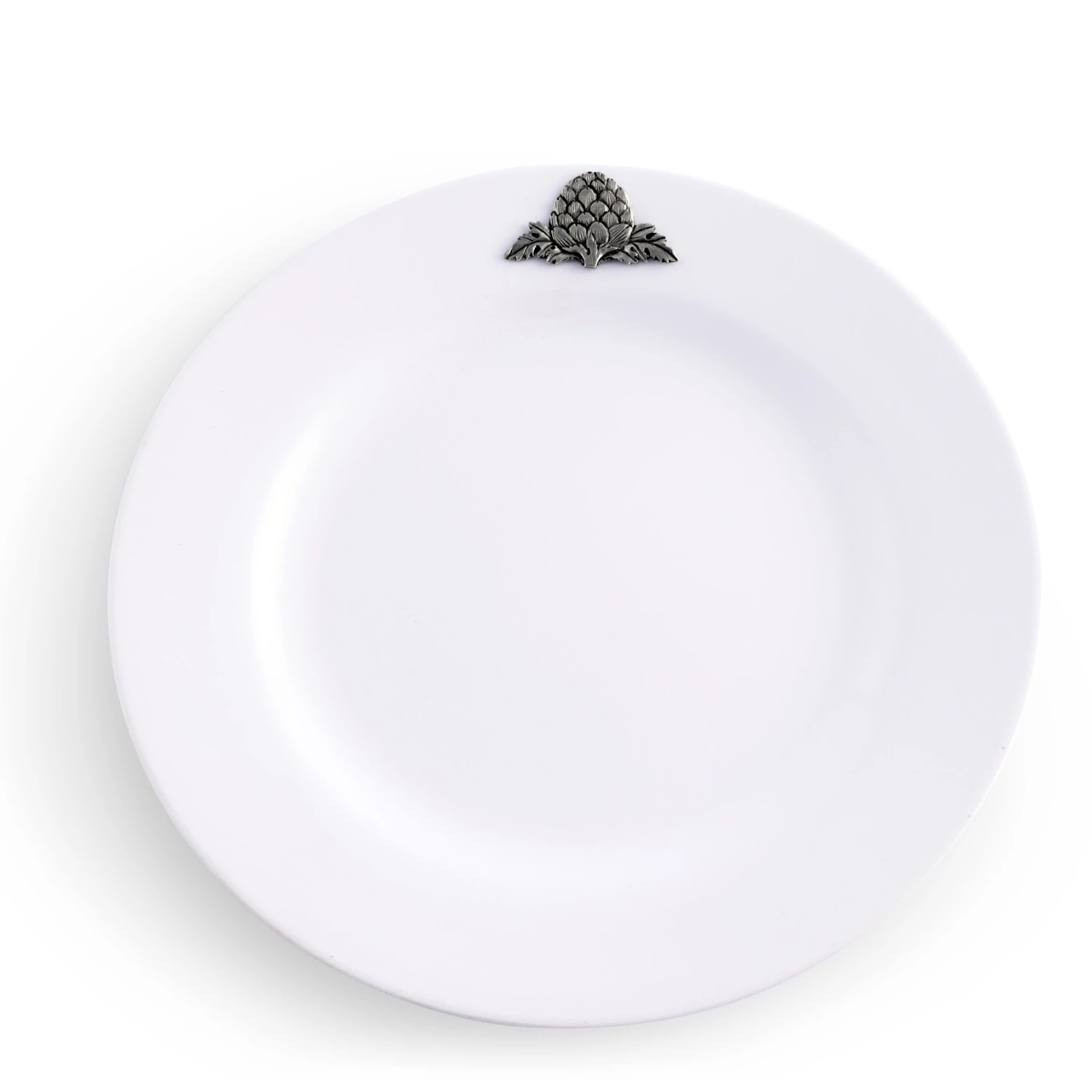 It is said that the best color for presenting food is white – and Arthur Court agree! White dishes make food look more elegant and appetizing. Our pure white Melamine resin is durable, fire and heat resistant and virtually unbreakable the perfect plate for outdoor dining. In true Arthur Court style, a detailed pewter metal Artichoke is attached to rim to create classic dinnerware that will stand up to outdoor use but formal enough for indoor dining.