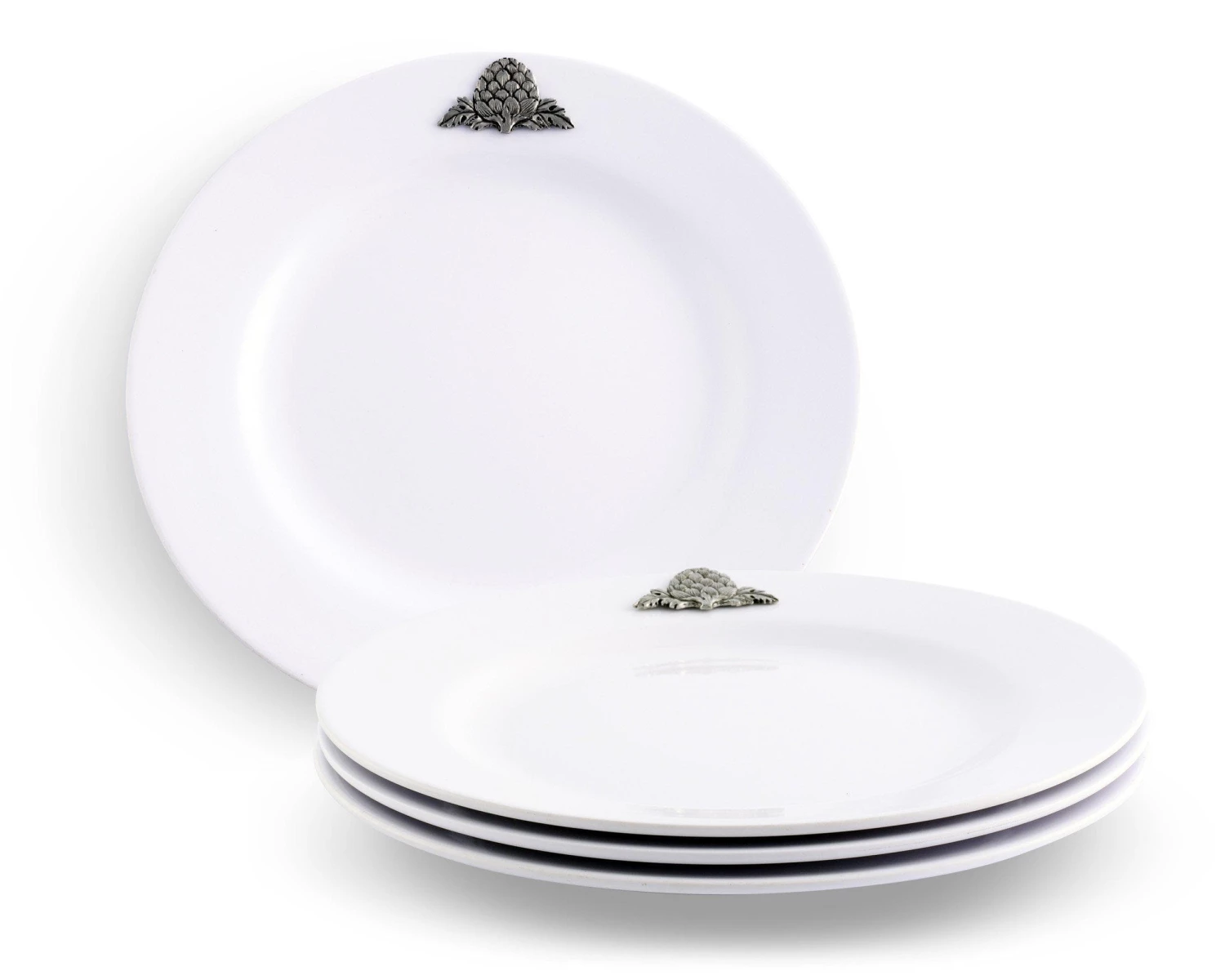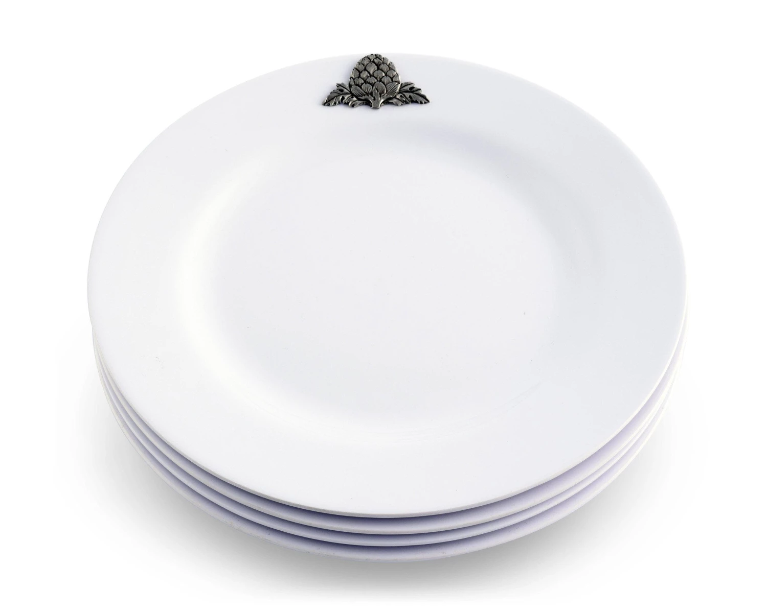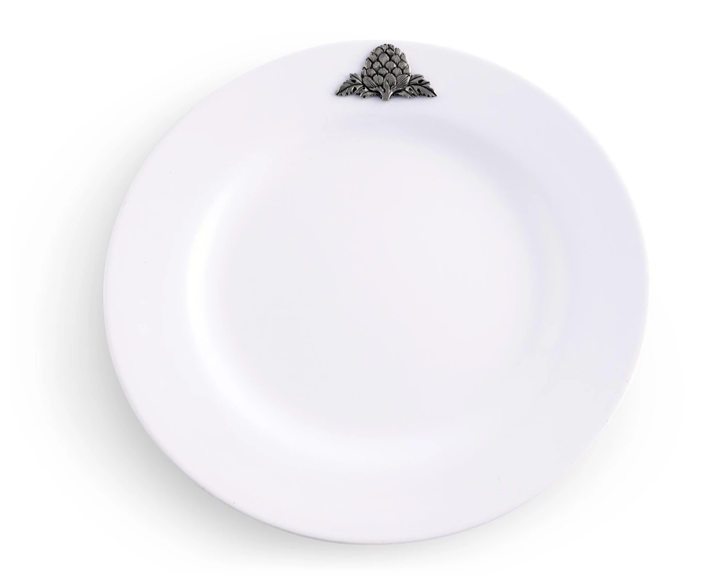 It is said that the best color for presenting food is white – and Arthur Court agree! White dishes make food look more elegant and appetizing. Our pure white Melamine resin is durable, fire and heat resistant and virtually unbreakable the perfect plate for outdoor dining. In true Arthur Court style, a detailed pewter metal Artichoke is attached to rim to create classic dinnerware that will stand up to outdoor use but formal enough for indoor dining.