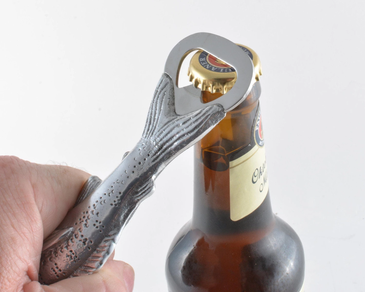 The marlin’s intricate tail forks and runs along each side of the opener’s neck. Detailed fins give the handmade, aluminum piece a distinct texture, while the fish’s long, recognizable bill offers lifelike appeal.
