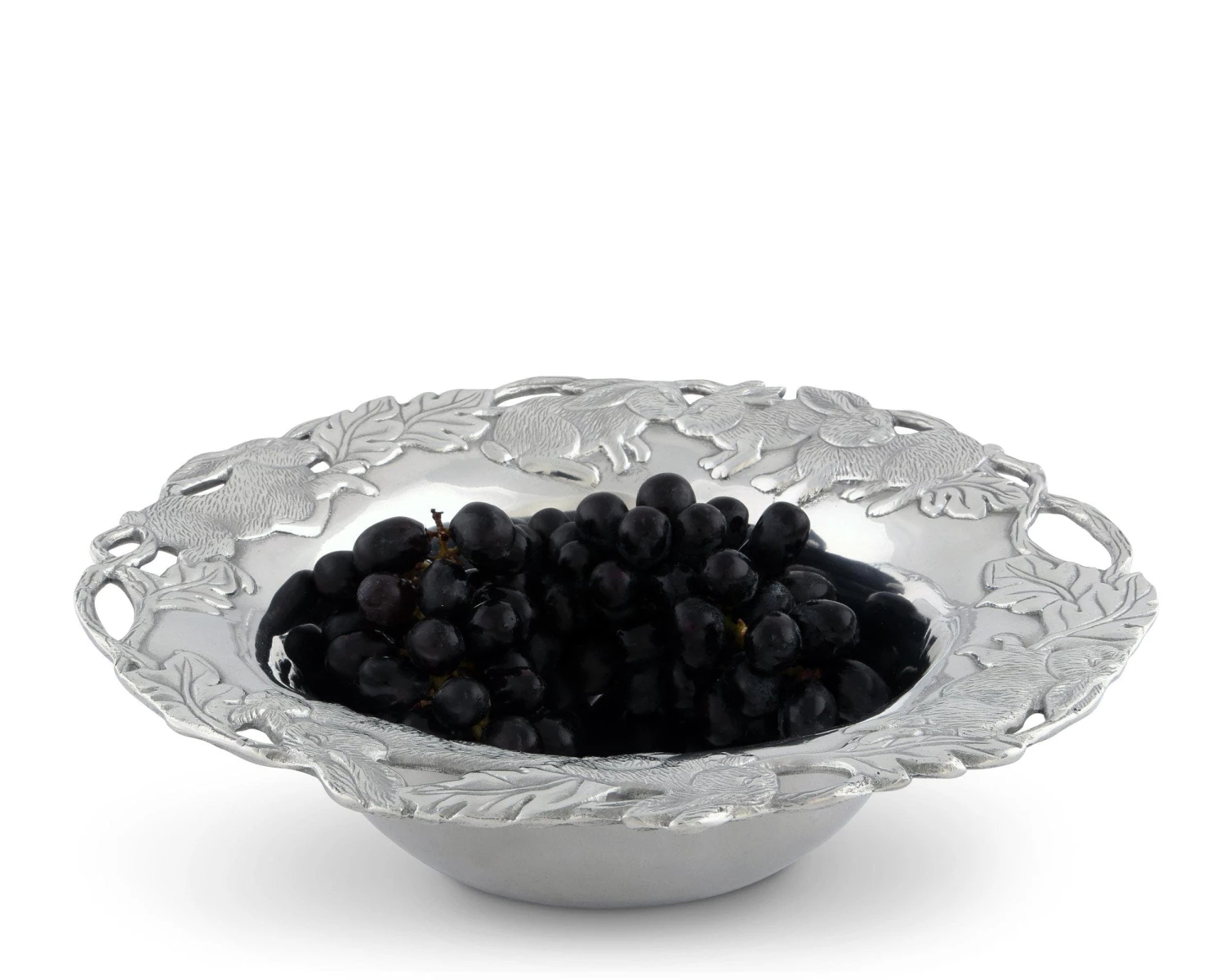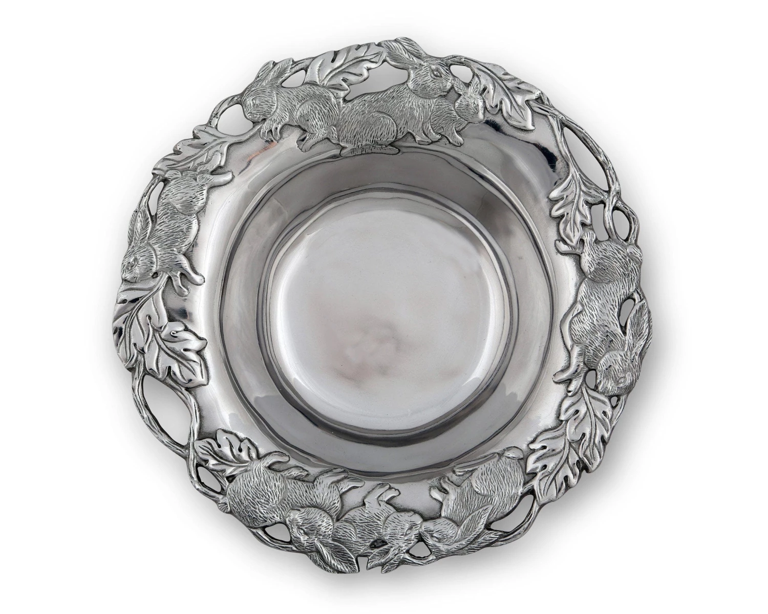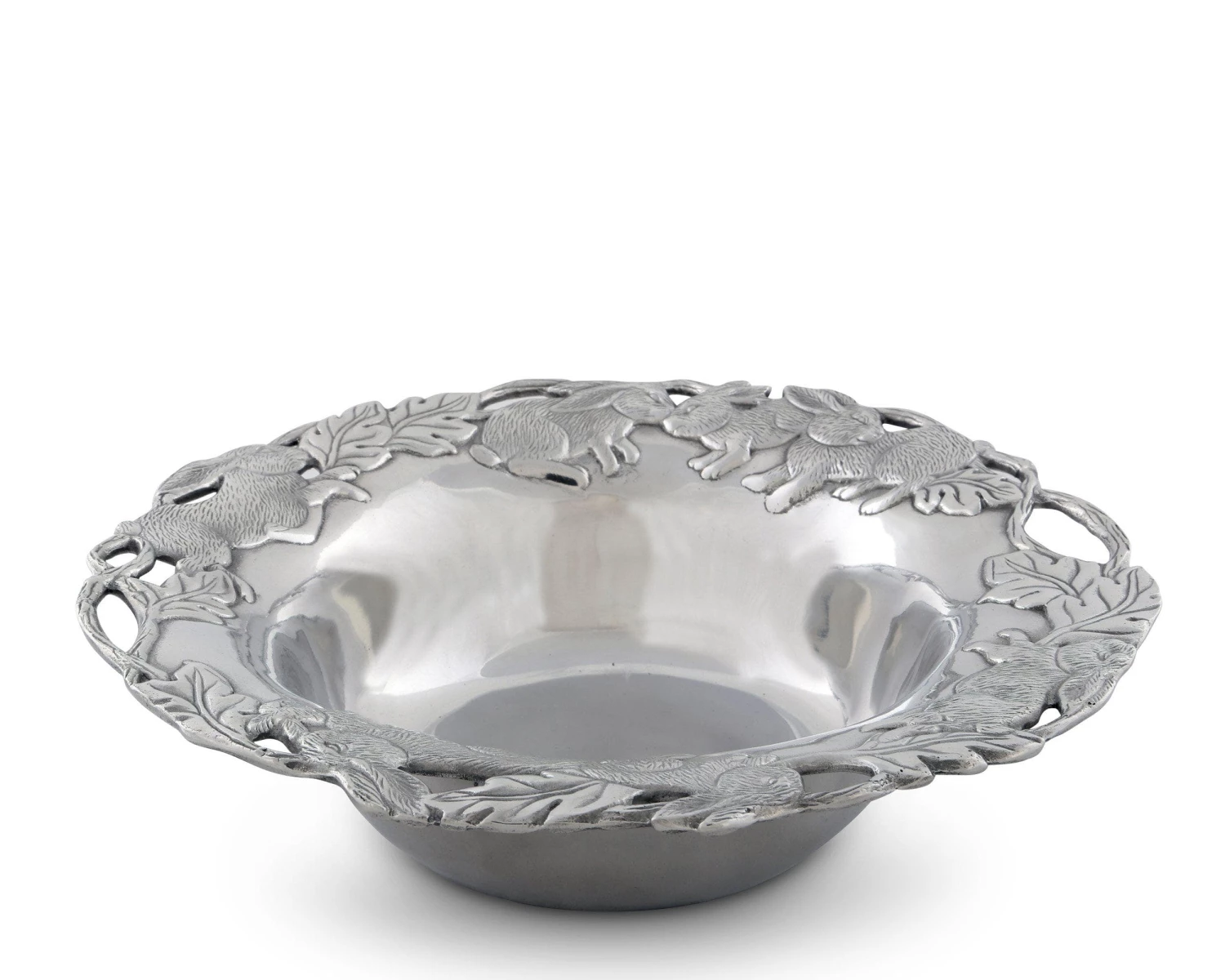 Sand-cast to lustrous perfection, this aluminum bowl glistens to the point where it seems to swirl; a pattern which the surrounding rabbits seem to follow. These detailed animals run among veiny leaves near the edge as vines create an openwork border around them.