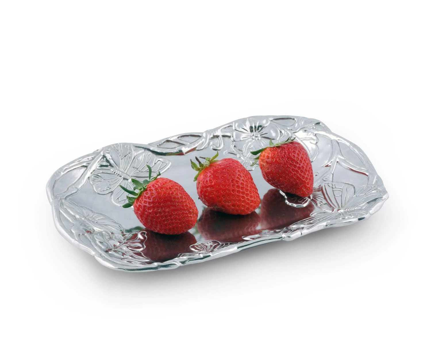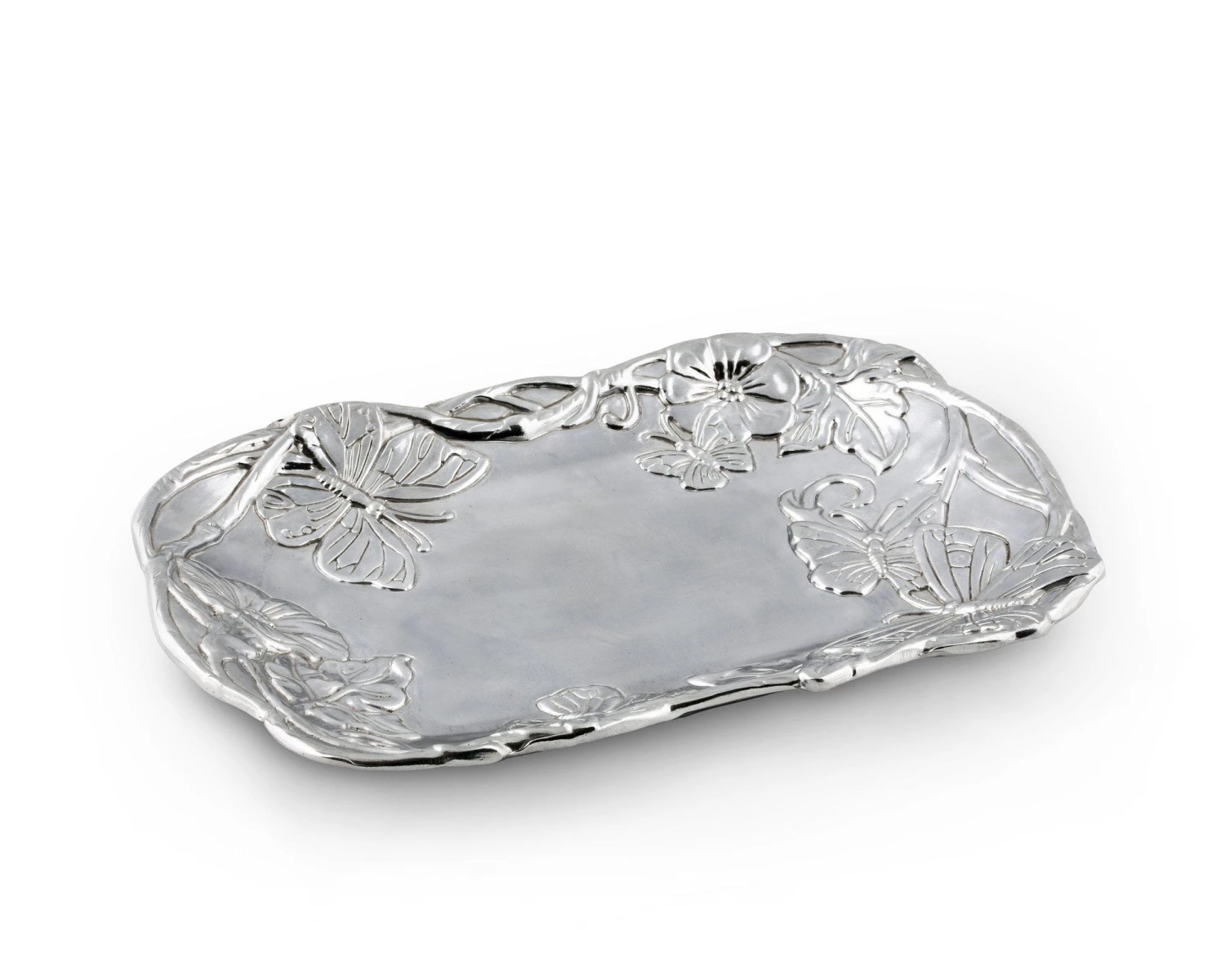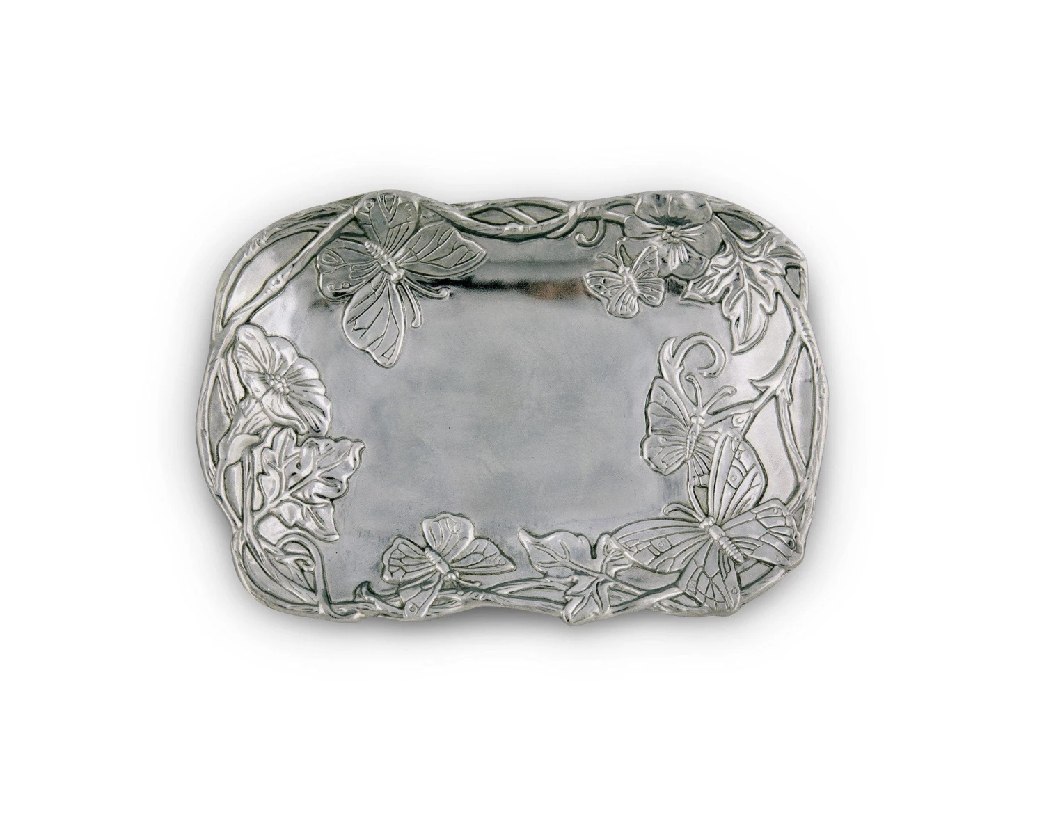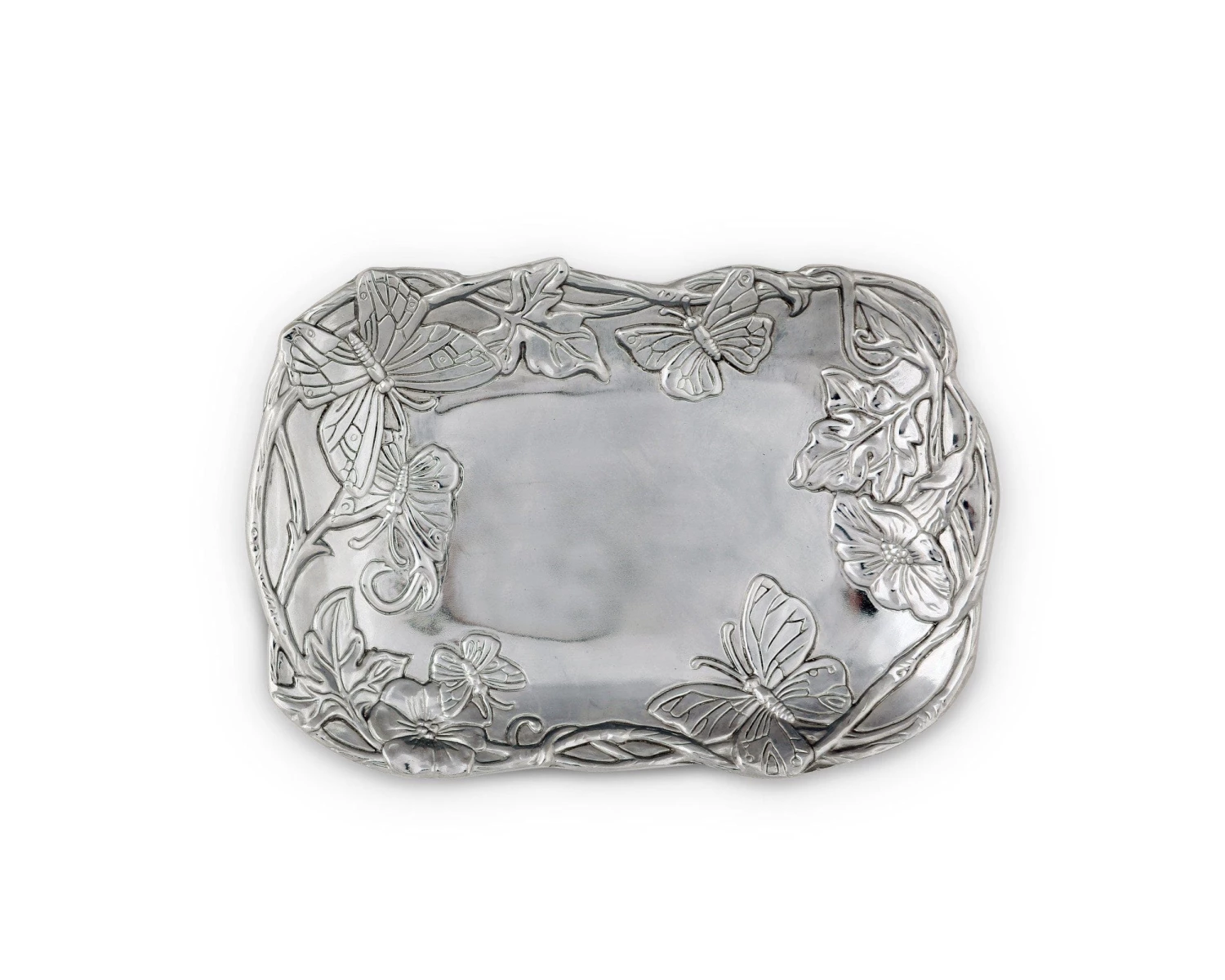 Majestic butterflies and veiny leaves cover the sides of this piece as twisting vines create its textured rim. The unblemished interior of this handmade, aluminum dish gleams against the detailed designs surrounding it.