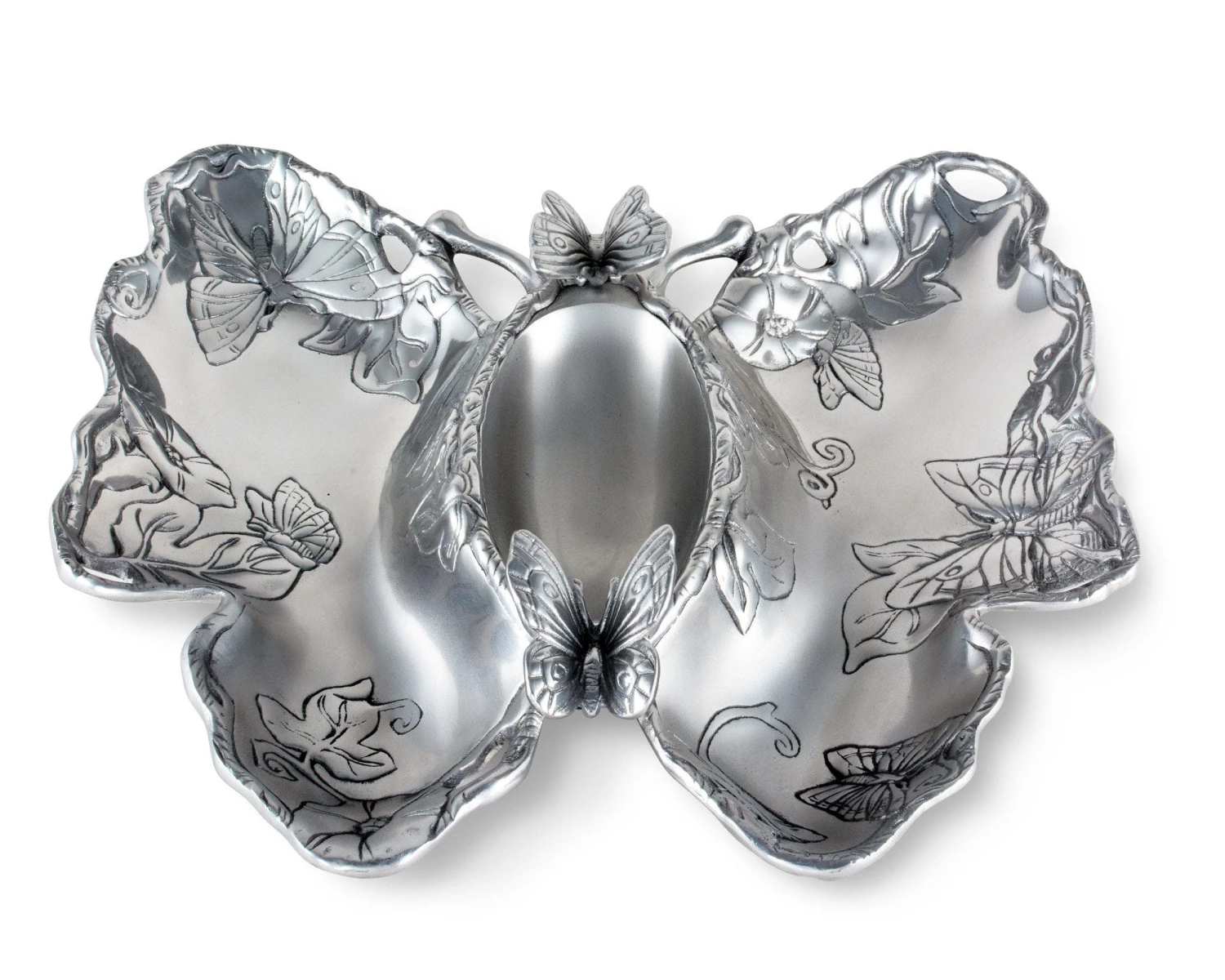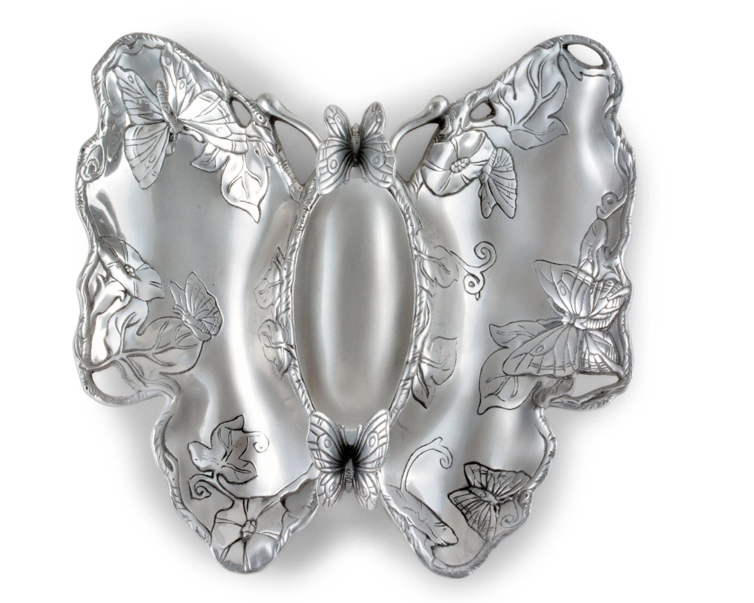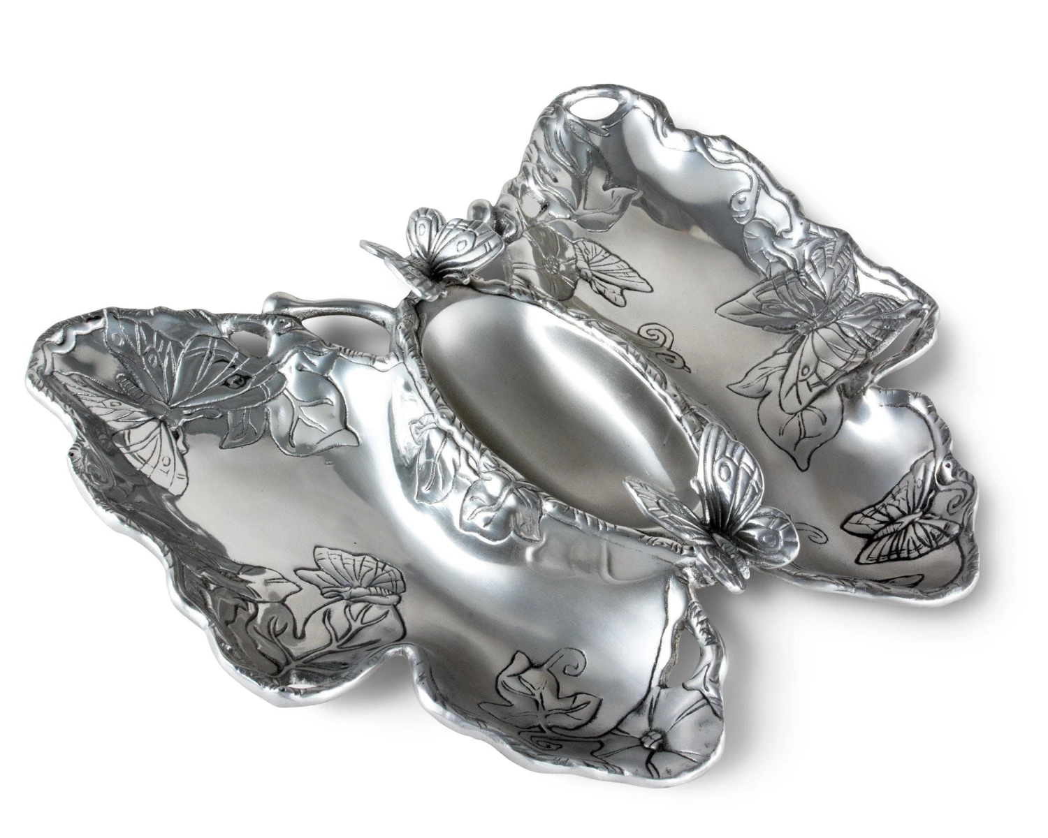 Great for entertaining, this Arthur Court Butterfly Chip and Dip Tray is both beautiful and functional, featuring an elegant butterfly silhouette with a built-in well in the center to house your favorite dip.
