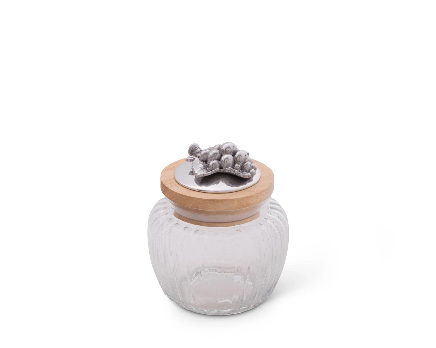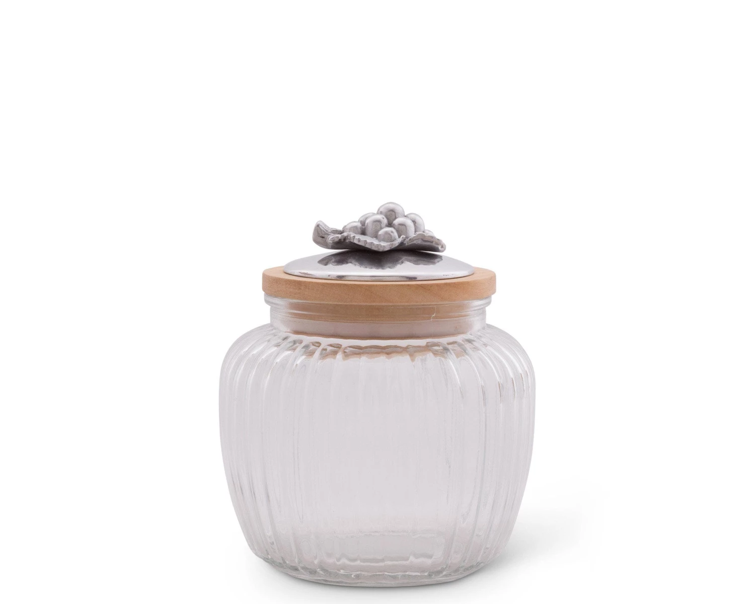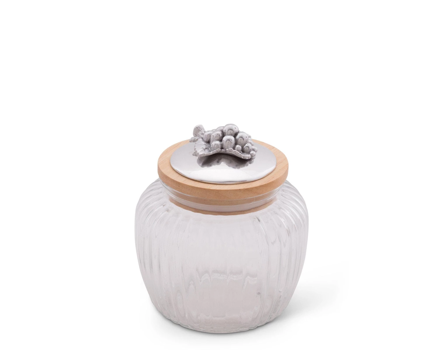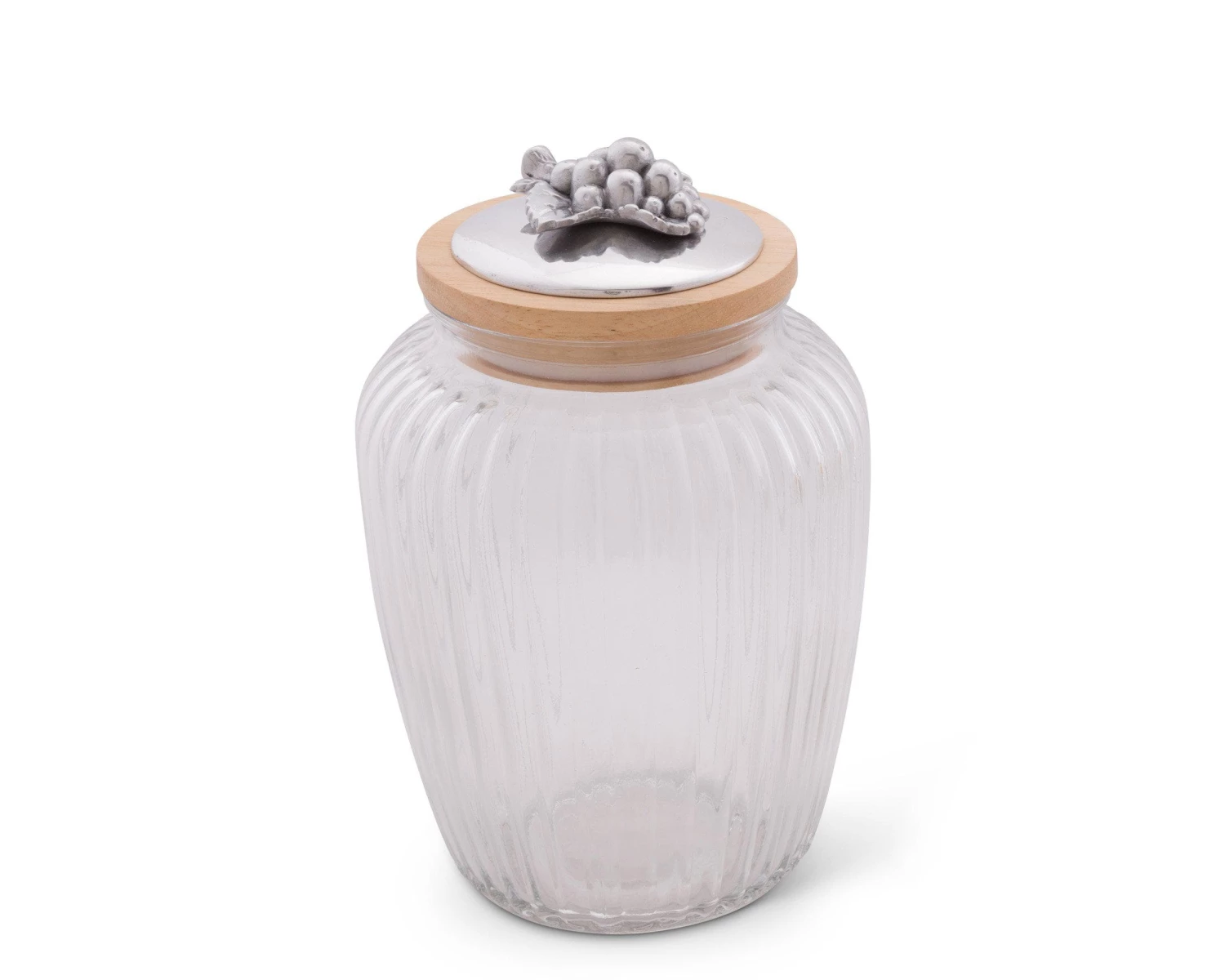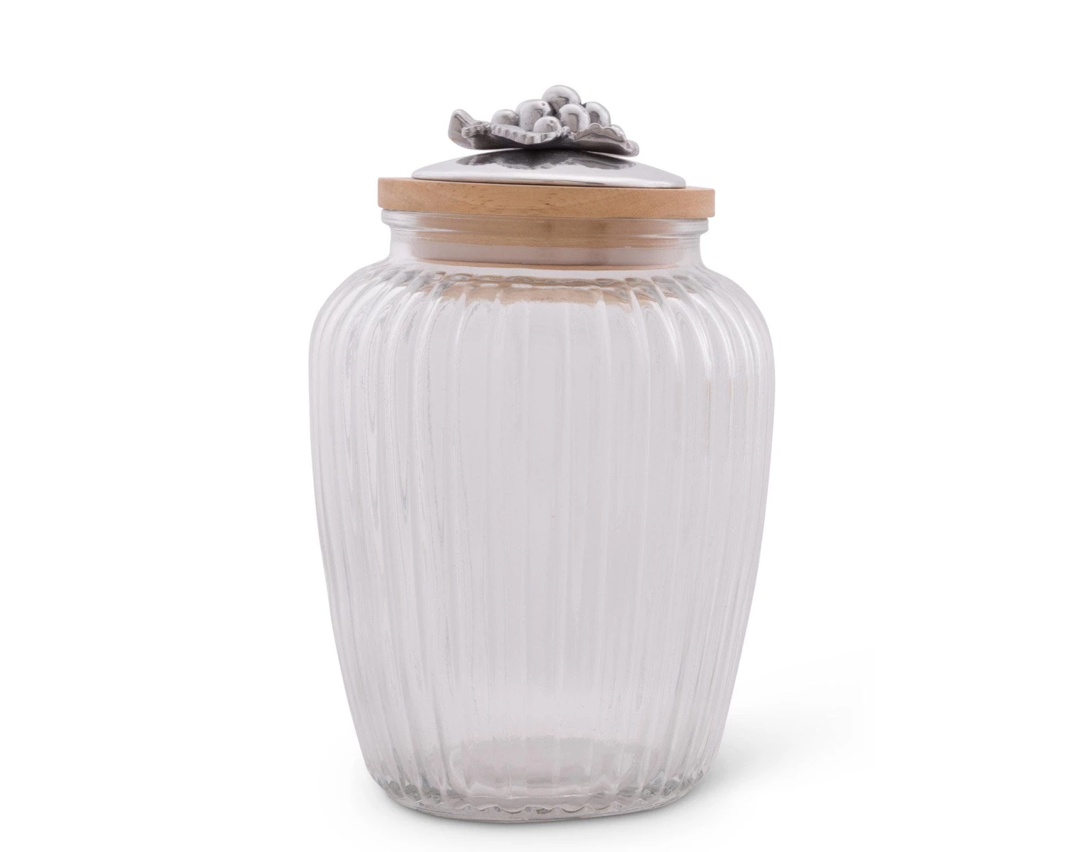 Uniquely shaped, stripe patterned glass canister with a natural, elegant and environmentally sustainable Acacia wood lid. Detailed metal art in aluminum, a grape cluster knob tops the jar with a premium silicone sealing ring. Airtight seal maintains perfect environment for keeping dry goods fresh.