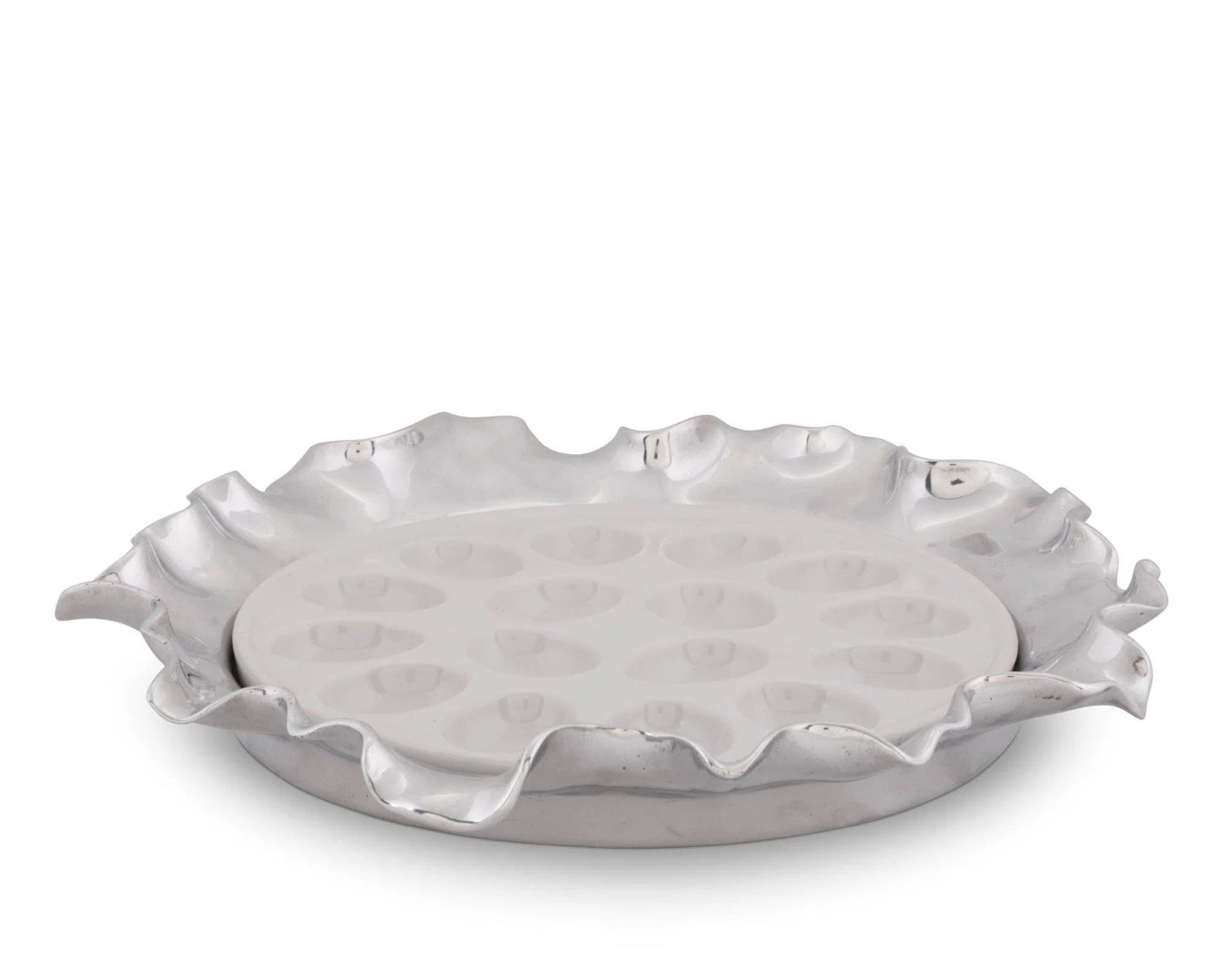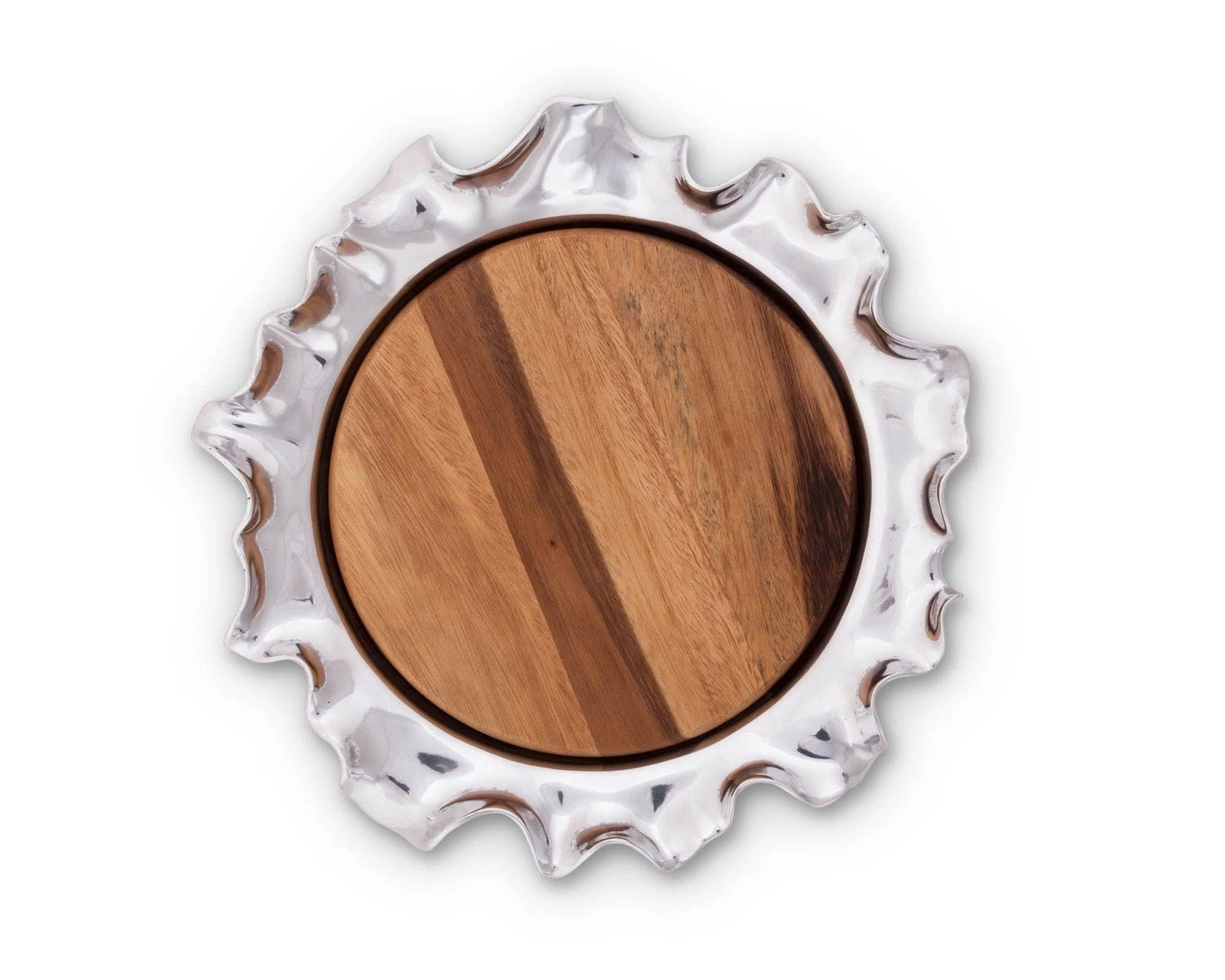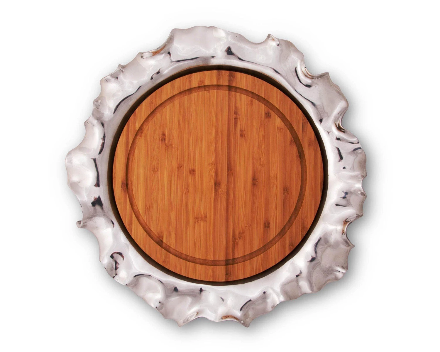 Entertain with stylish flair by serving party hors d’oeuvres on this popular Arthur Court Carmel cheese stand. The large 10-inch-diameter removable board, made of high-quality bamboo hardwood, performs multiple duties, letting you beautifully display, cut and pass around cheeses, small desserts, tasty bits of meat and other appetizing food items. Bamboo is a naturally water-resistant, durable wood, making this piece a fine cutting board and serving tray in one. The 13-inch-wide stand is handcrafted from aluminum alloy that retains its lustrous shine and requires no polishing or maintenance other than handwashing with gentle, non-acidic detergent. Fashioned to resemble the rolling hills and waves of California’s Carmel-by-the-Sea village, the curving edges of this cheese stand make a striking artistic impression on party guests.