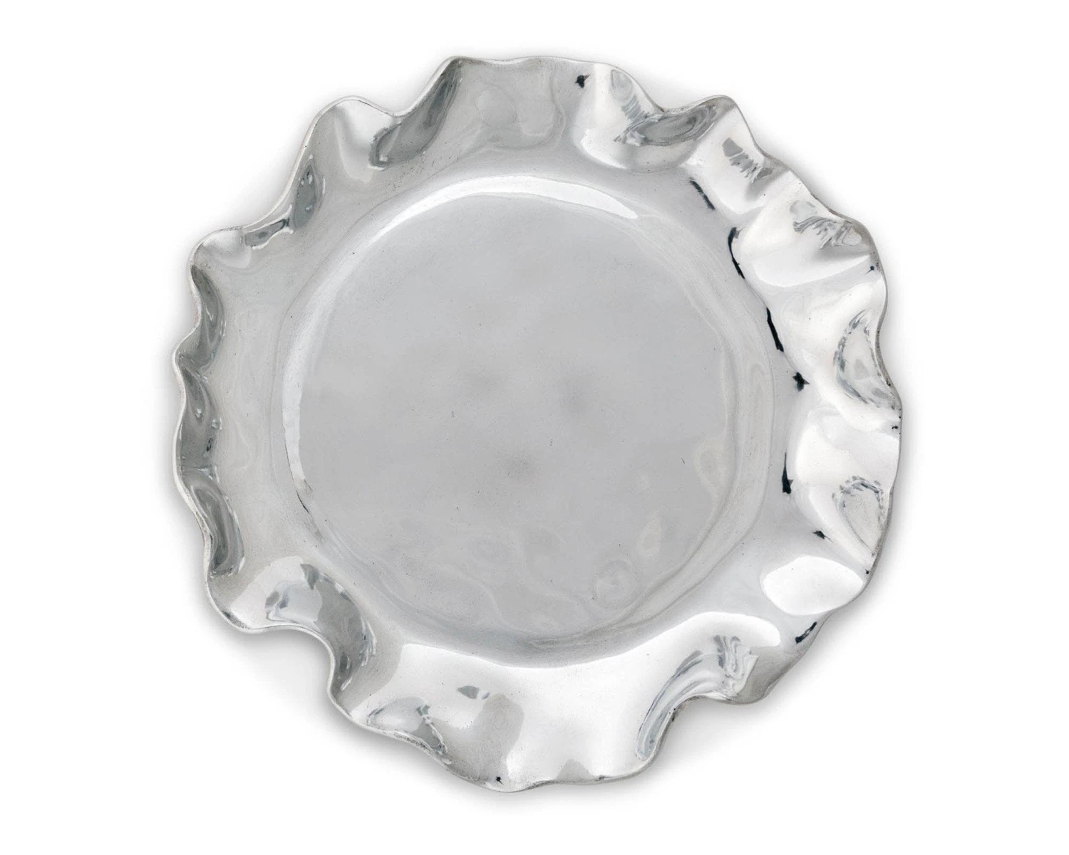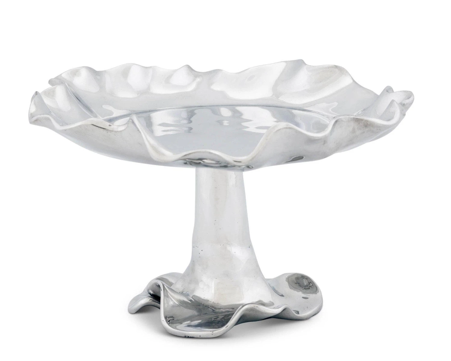 Add height and interest to an elegant table or buffet with this elevated tray from Arthur Court’s Carmel Collection. Inspired by the small village of Carmel-by-the-Sea at the edge of the Pacific Ocean, the gently scalloped edges of the serving tray and base echo the rolling waves at the seashore. Brightly polished aluminum makes even the plainest food stand out, and a sturdy tapered pedestal allows your dish to rest firmly in place. The tray measures 9 inches around and stands 5.5 inches tall, making it great for displaying a dainty collection of petit fours, a cluster of grapes and cubed cheese, or a homemade, fragrant pumpkin pie. The Carmel Collection includes serving trays and platters to complete your buffet. To care for your Carmel elevated tray, hand wash with hot, soapy water and polish with a chamois cloth.