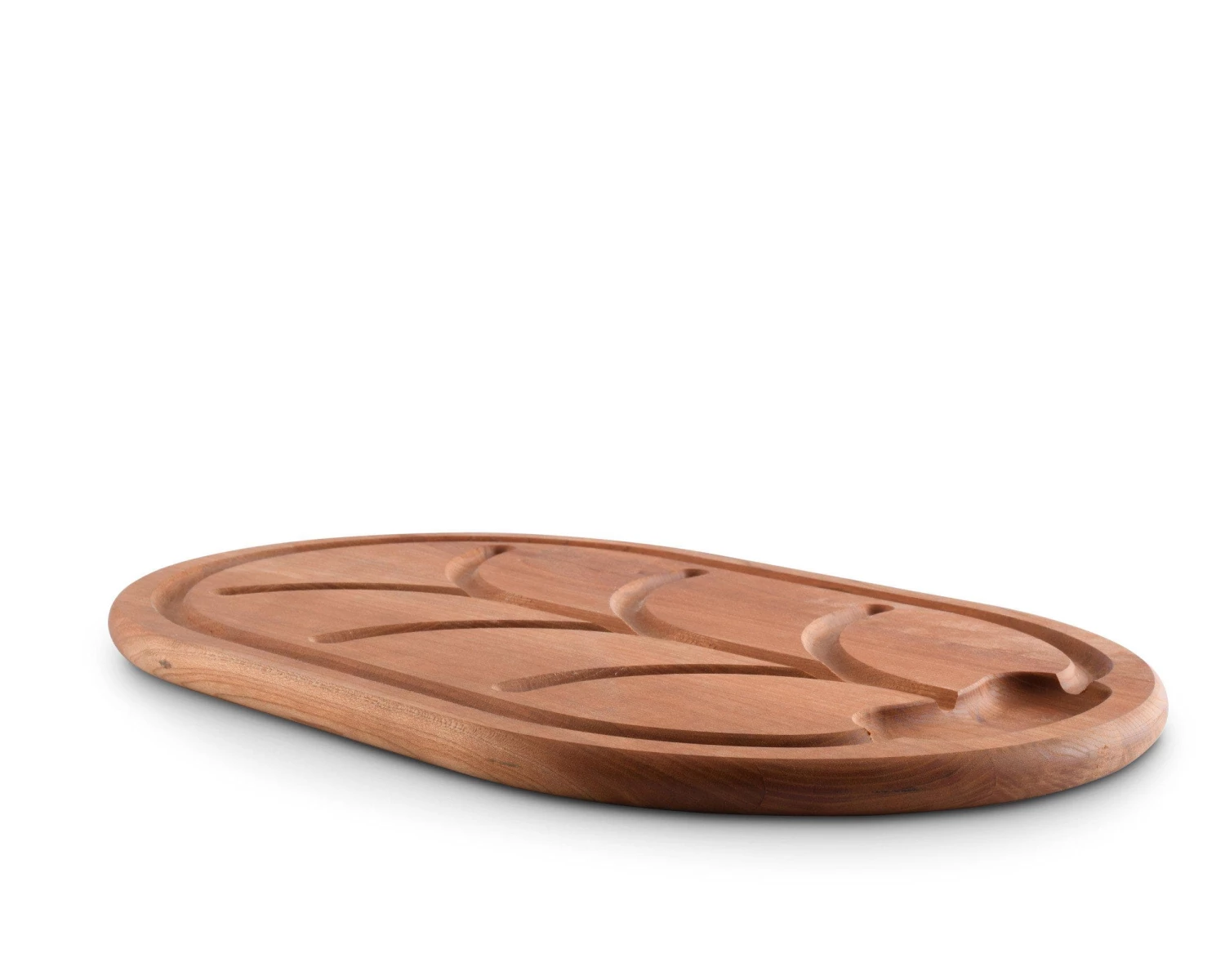 This two-sided carving/serving board is a piece of art as well as a multifunctional kitchen tool. It’s beautiful, solid maple is pressure-bonded with a high-strength, water-resistant adhesive to protect the wood from moisture, and it also has a natural oil finish. One side of the board has a well and tree / gravy groove to catch the precious juices. The other side has a flat for serving any type of food. To extend the life of the board, rub the wood with mineral oil now and again. –