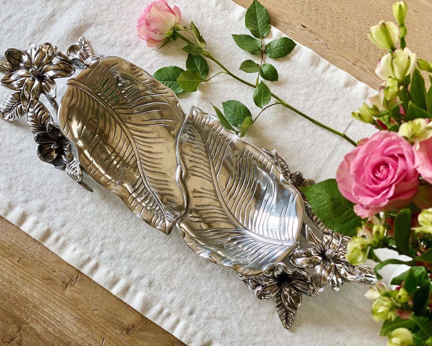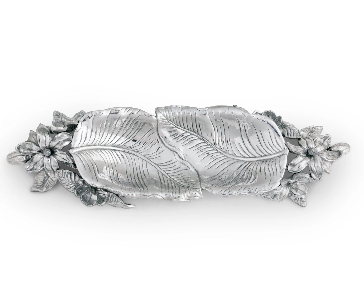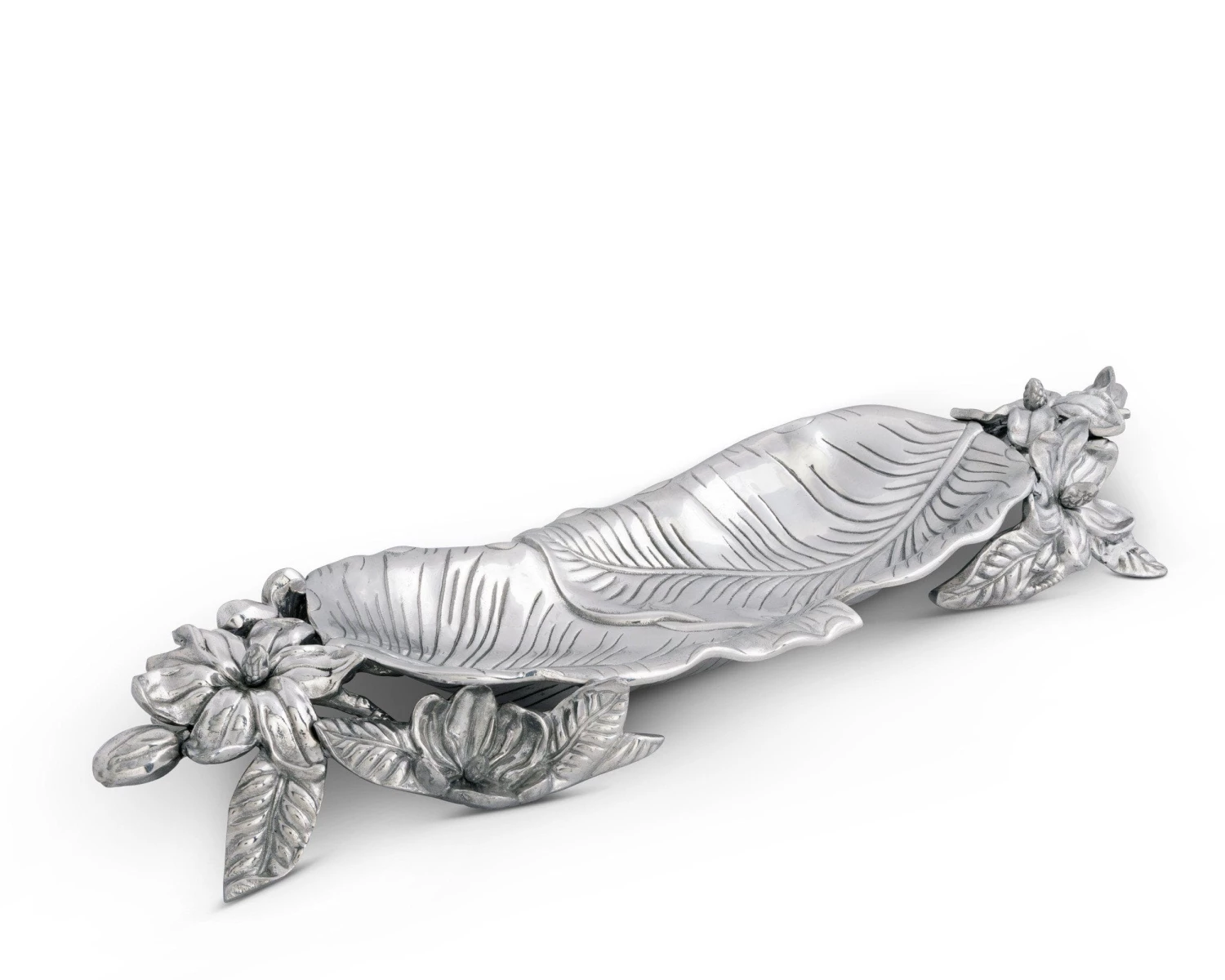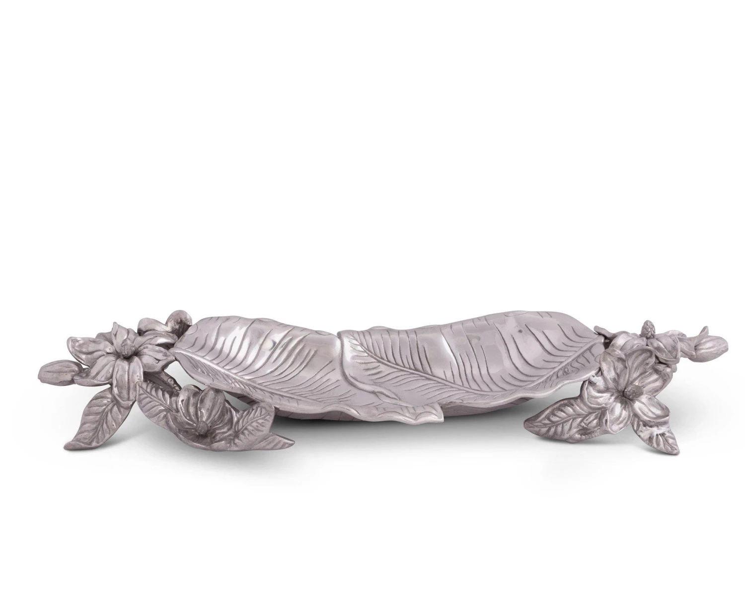An elegant arrangement of magnolias and plants form fashionable handles for this elevated dish, while large, overlapping leaves create the detailed basin. Arthur Court’s handcrafted, sand-cast aluminum reflects the remarkable definition within each of these designs.
