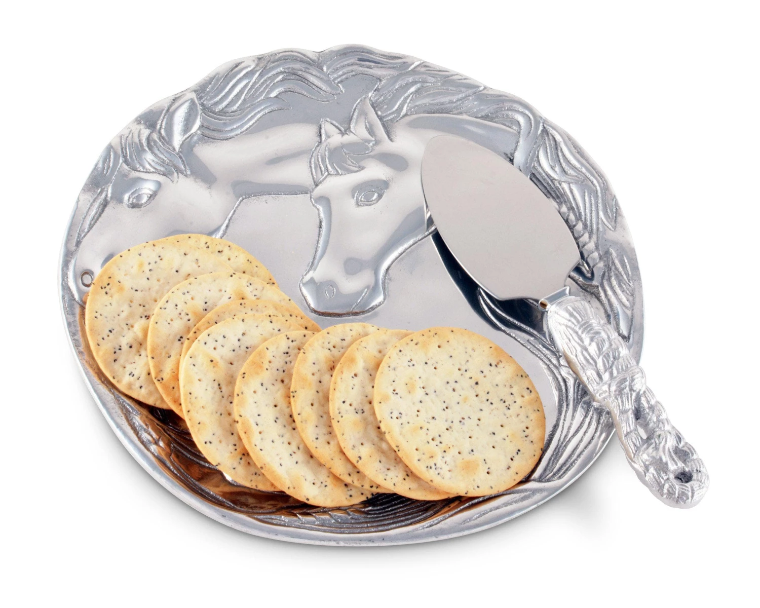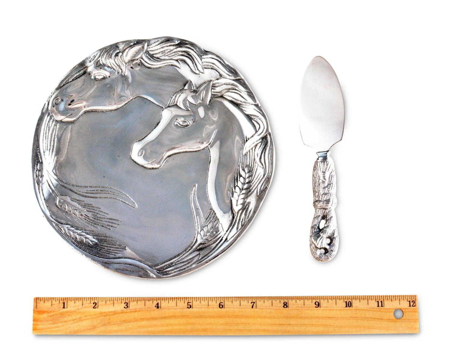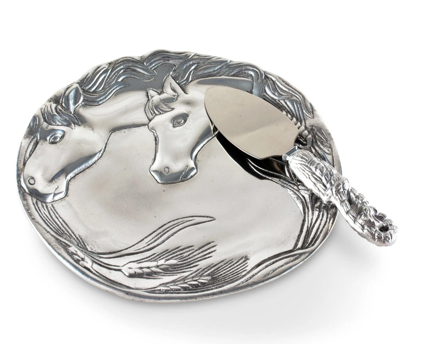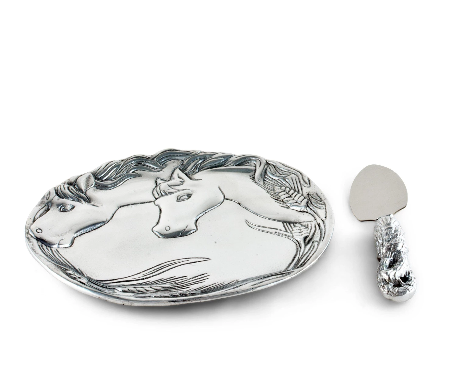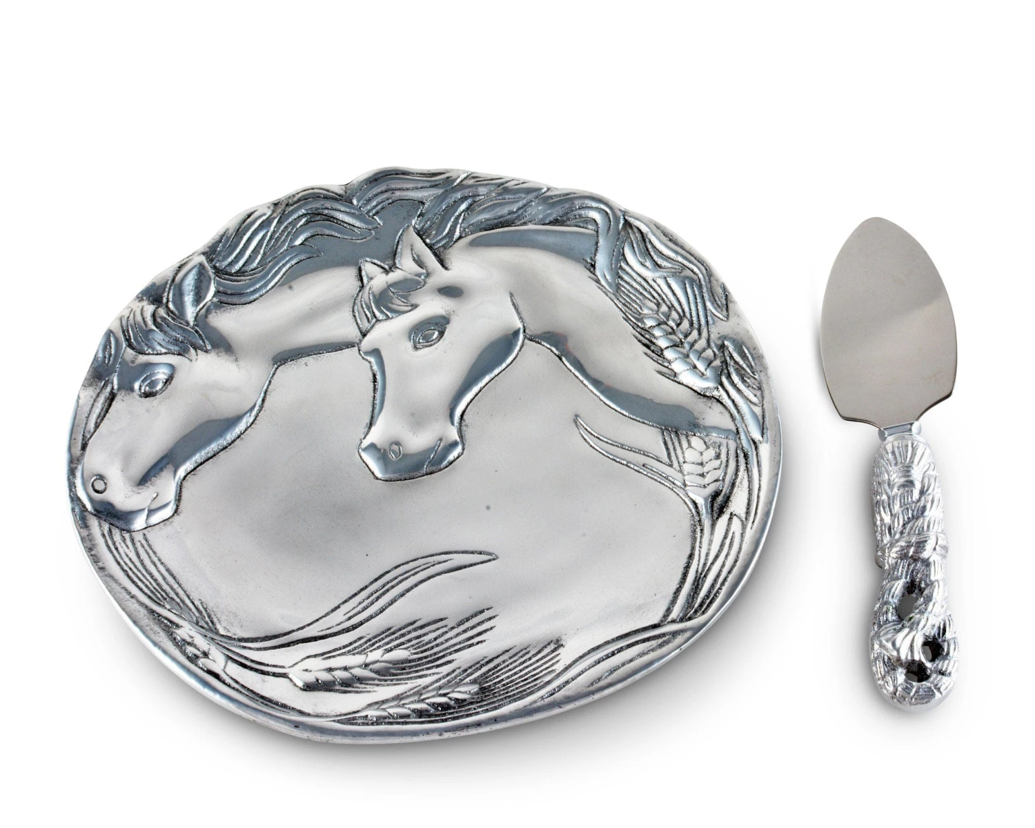 Arthur Court’s Horse Plate with Server is an unexpectedly artsy gift for your favorite equestrian, even if the horse lover is you. Sand-cast aluminum plate is an artwork of 2 detailed horse heads, finished with a wheat stalk border. Comes with triangle head server, the handle imagined as rope.