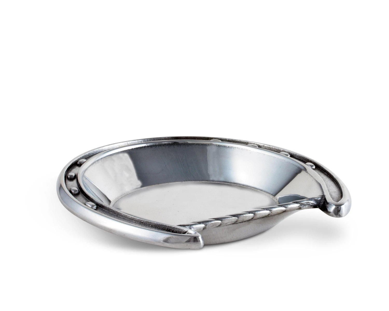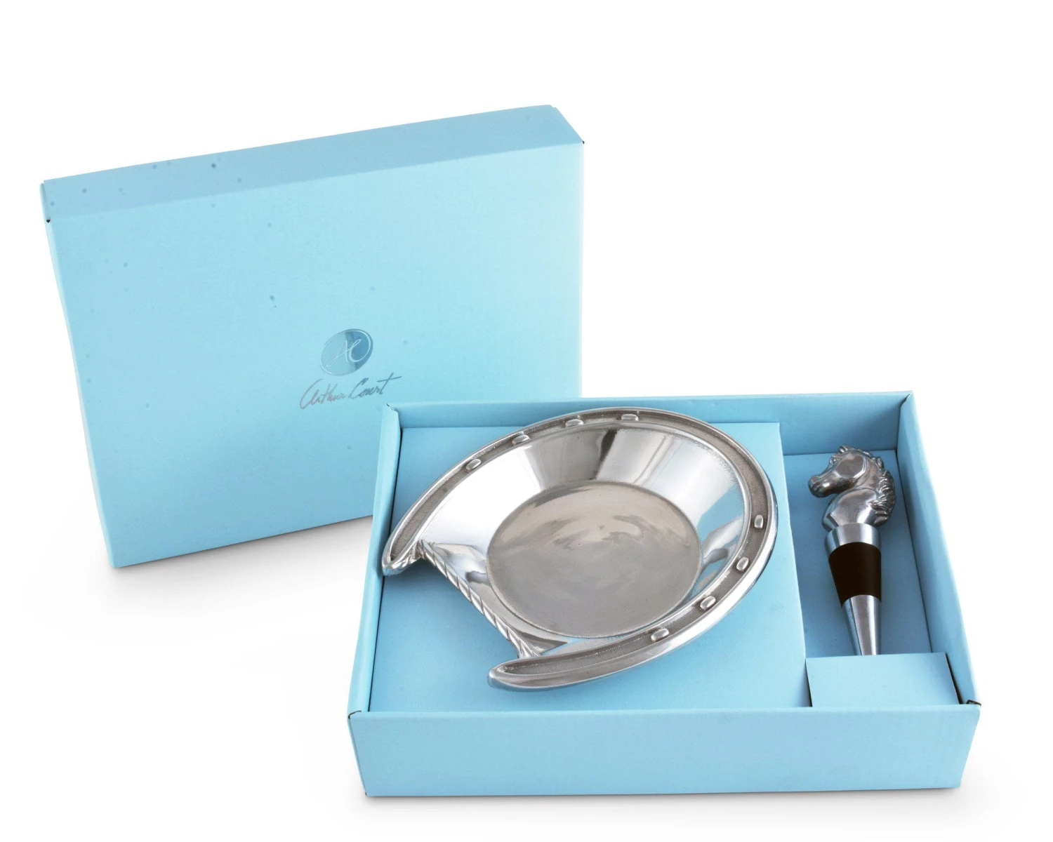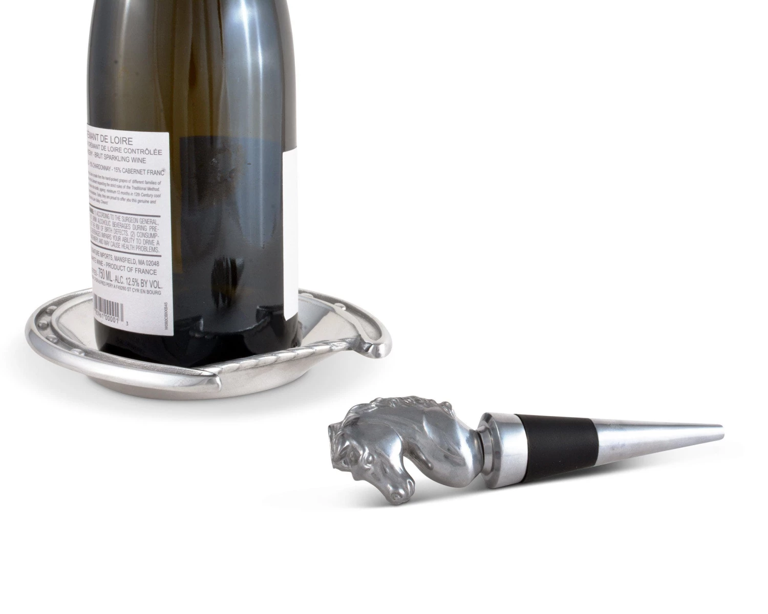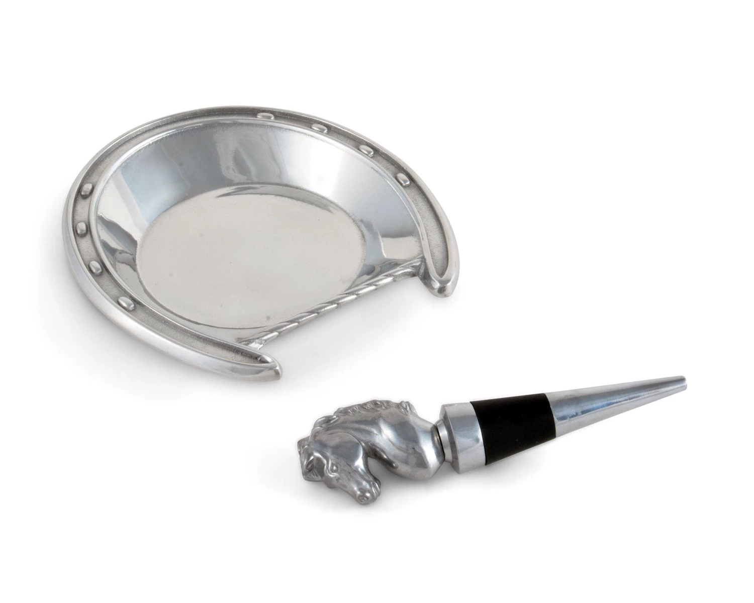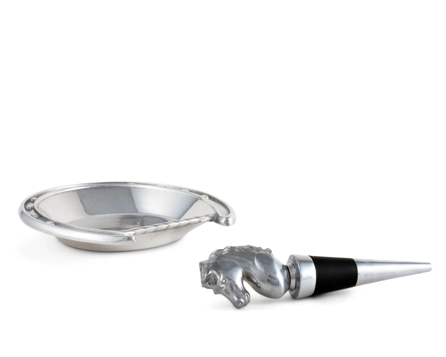 Gallup home to this horseshoe wine coaster and stopper set from Arthur Court. Keep wine bottles upright on uneven surfaces with the wide base of this quirky horseshoe coaster with realistic nail marks, and maintain the freshness of the bottle’s contents with the sleekly elegant equestrian stopper, crowned with a majestic horse head. Whether you’re riding out for a romantic getaway or a day at the track, tuck this compact, portable set beside your wine tote for fancy al fresco dining anywhere. If you already love the Arthur Court Equestrian Collection, this horseshoe wine coaster and stopper set doesn’t disappoint as the latest edition. Handcrafted from sand-cast aluminum for high shine, this set is a shoe-in for whimsical barware that keeps wine at peak flavor for any event.
