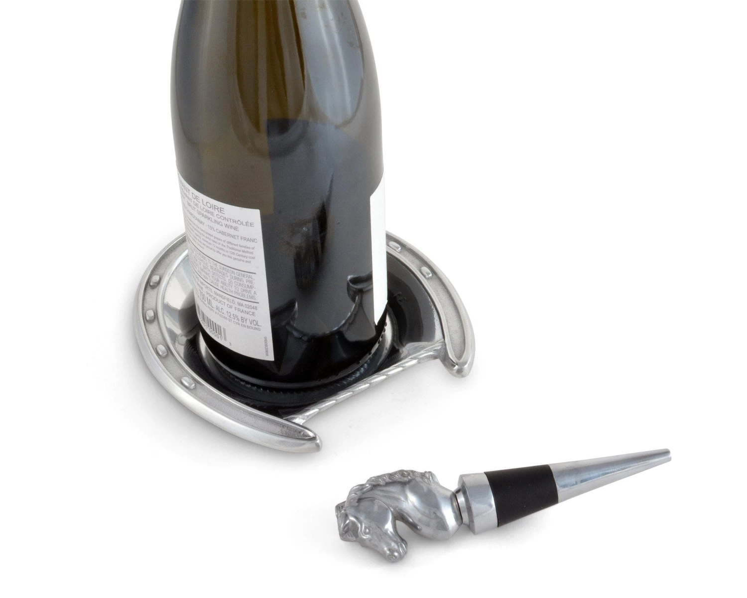 A brilliantly-defined horseshoe displays realistic nail markings in its design, while a stoic horse head adorns the top of this stopper. The set was handcrafted in sand-cast aluminum.