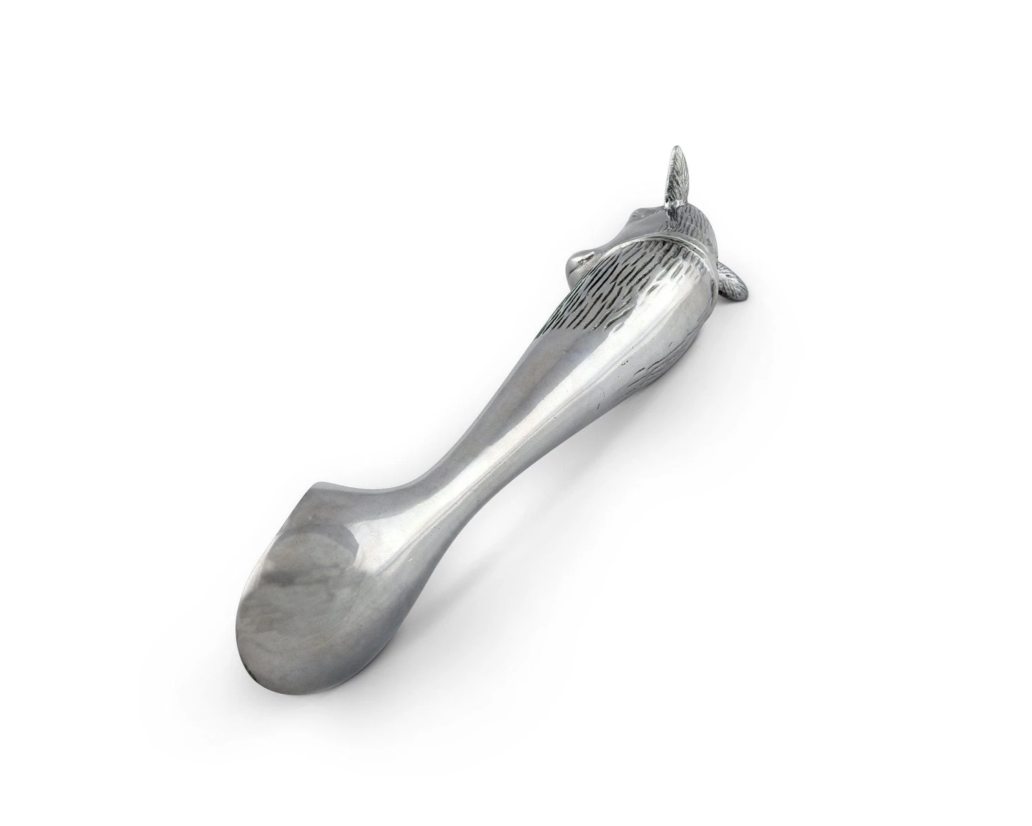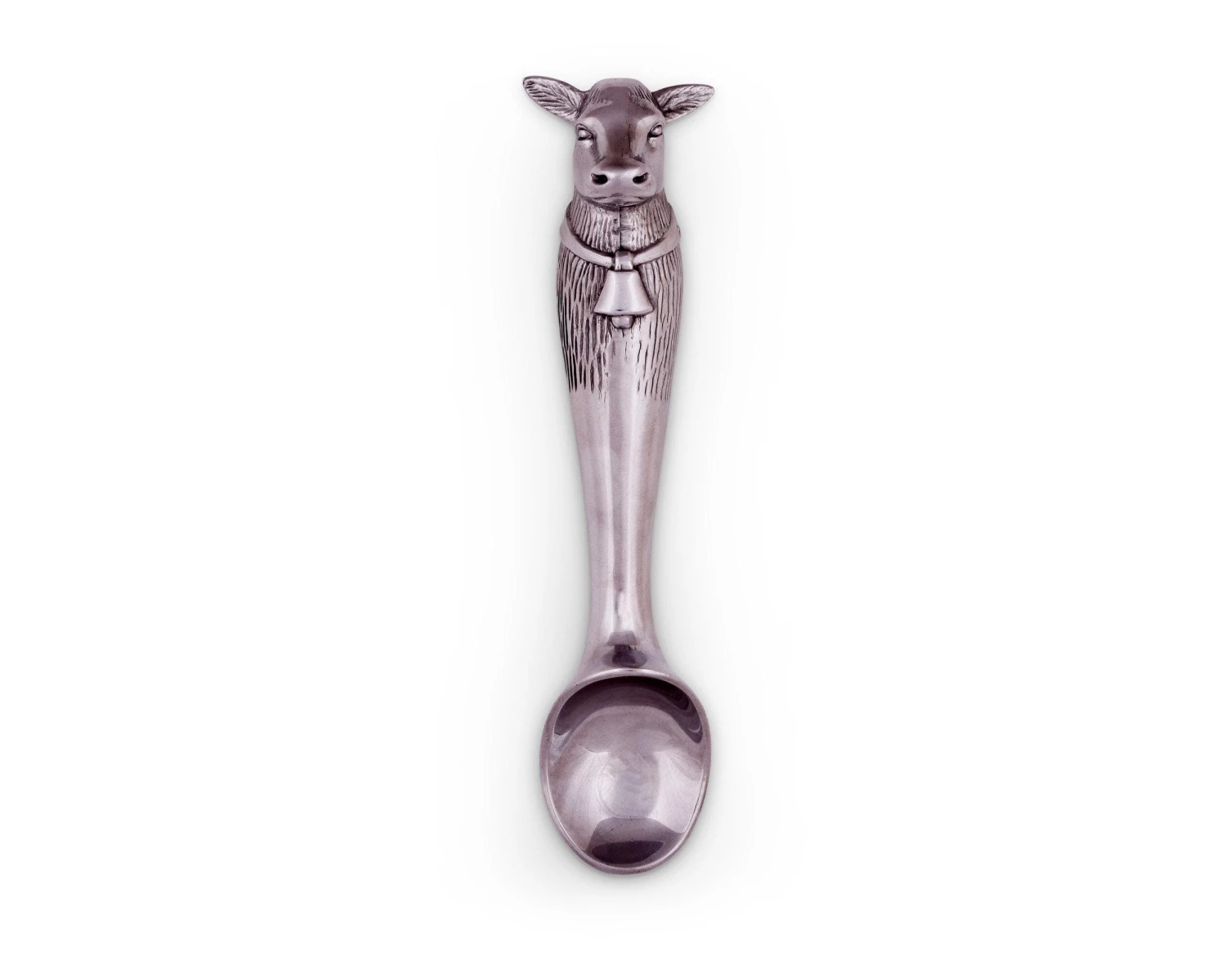 A cow head adorns the end of this piece as its big ears and muzzle jut out in realistic fashion. A distinguished bell hangs off a large band that stretches across the animal’s torso, which is covered in intricate lines.The smooth bowl and neck of this handmade, aluminum scoop gleams against the textured designs on the handle.
