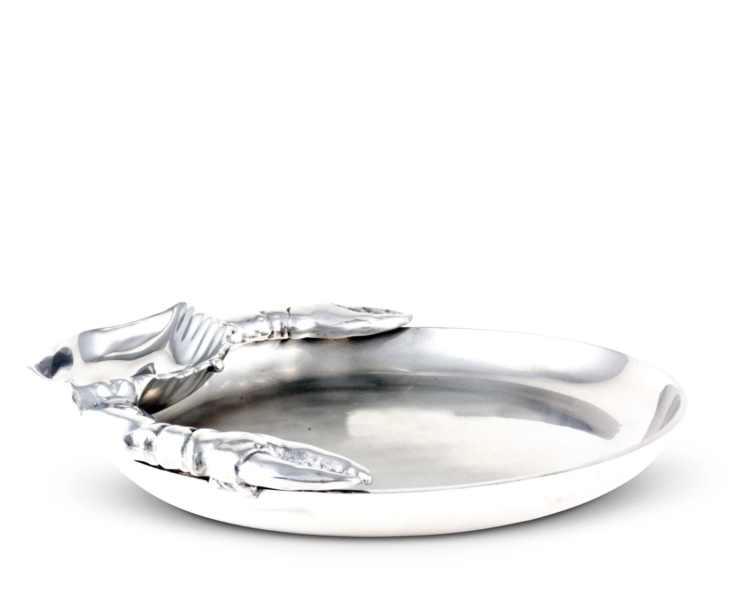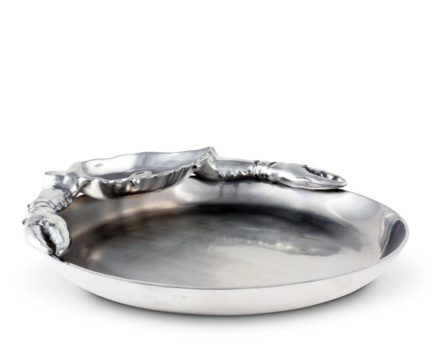 As if lounging in a hot tub, an intricate crustacean hangs its eight legs over the side and rests its claws on the rim of this dish. The smooth interior of this handmade, aluminum piece displays a brilliant luster against the crab’s textured body.
