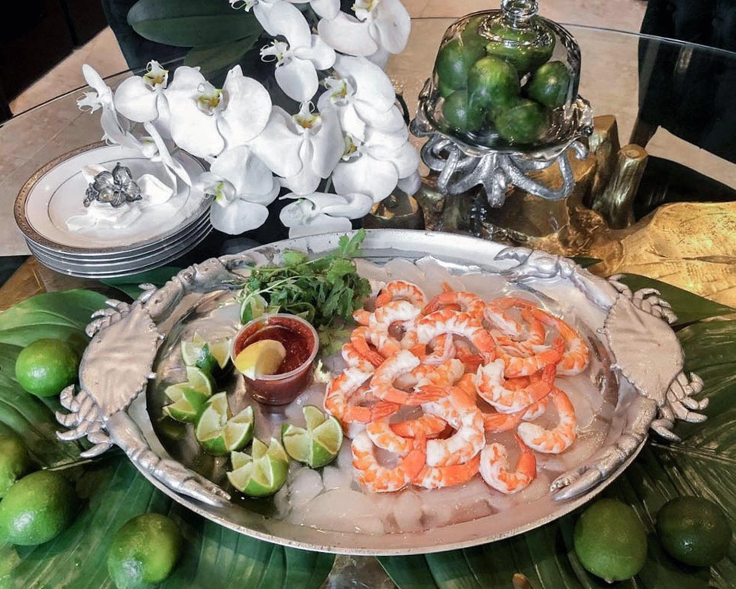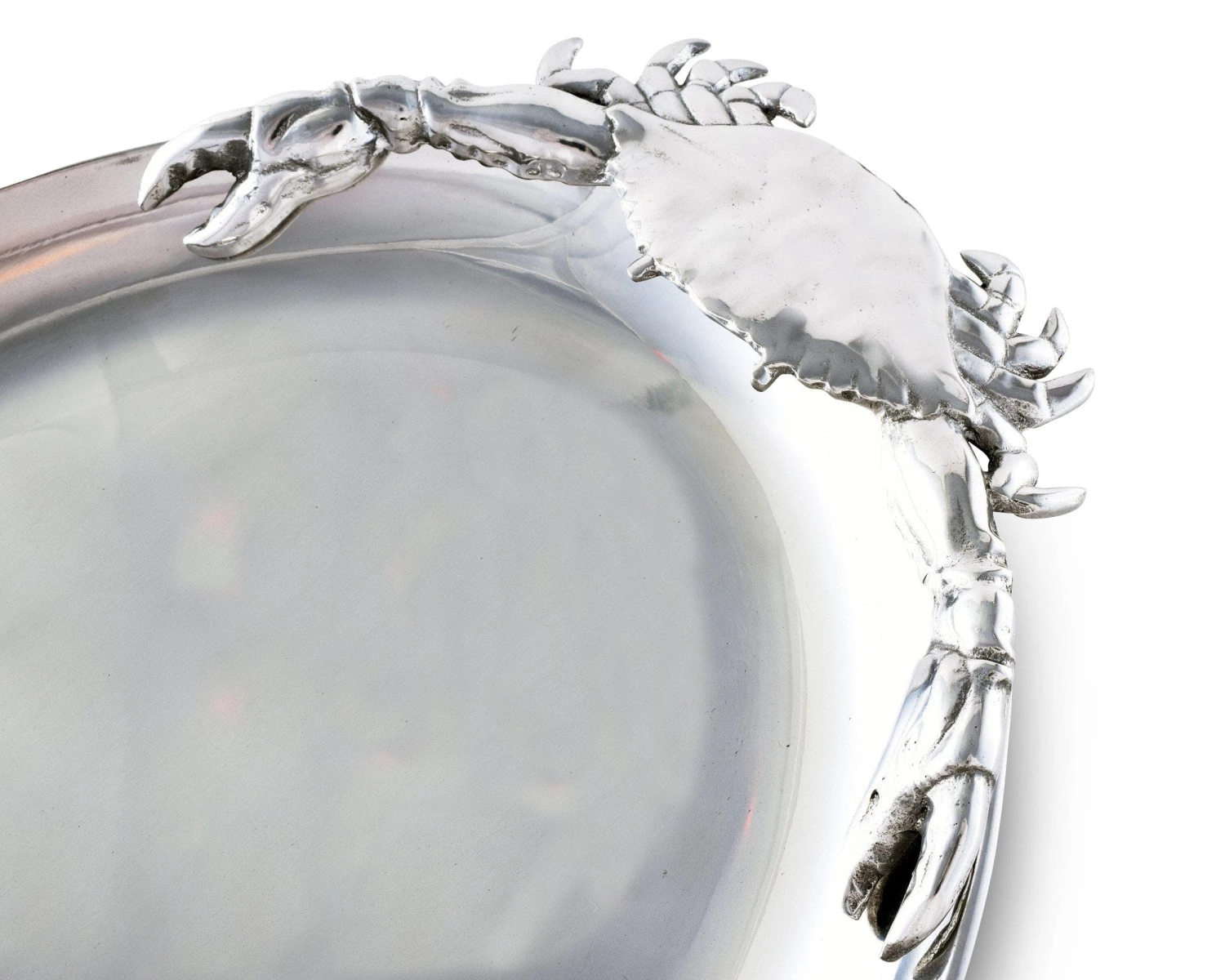 Exquisite crustaceans rest on either side of this lustrous piece as they wait for an unsuspecting finger. The handmade, aluminum platter glistens on its own, but is the perfect accent to any colorful meal.