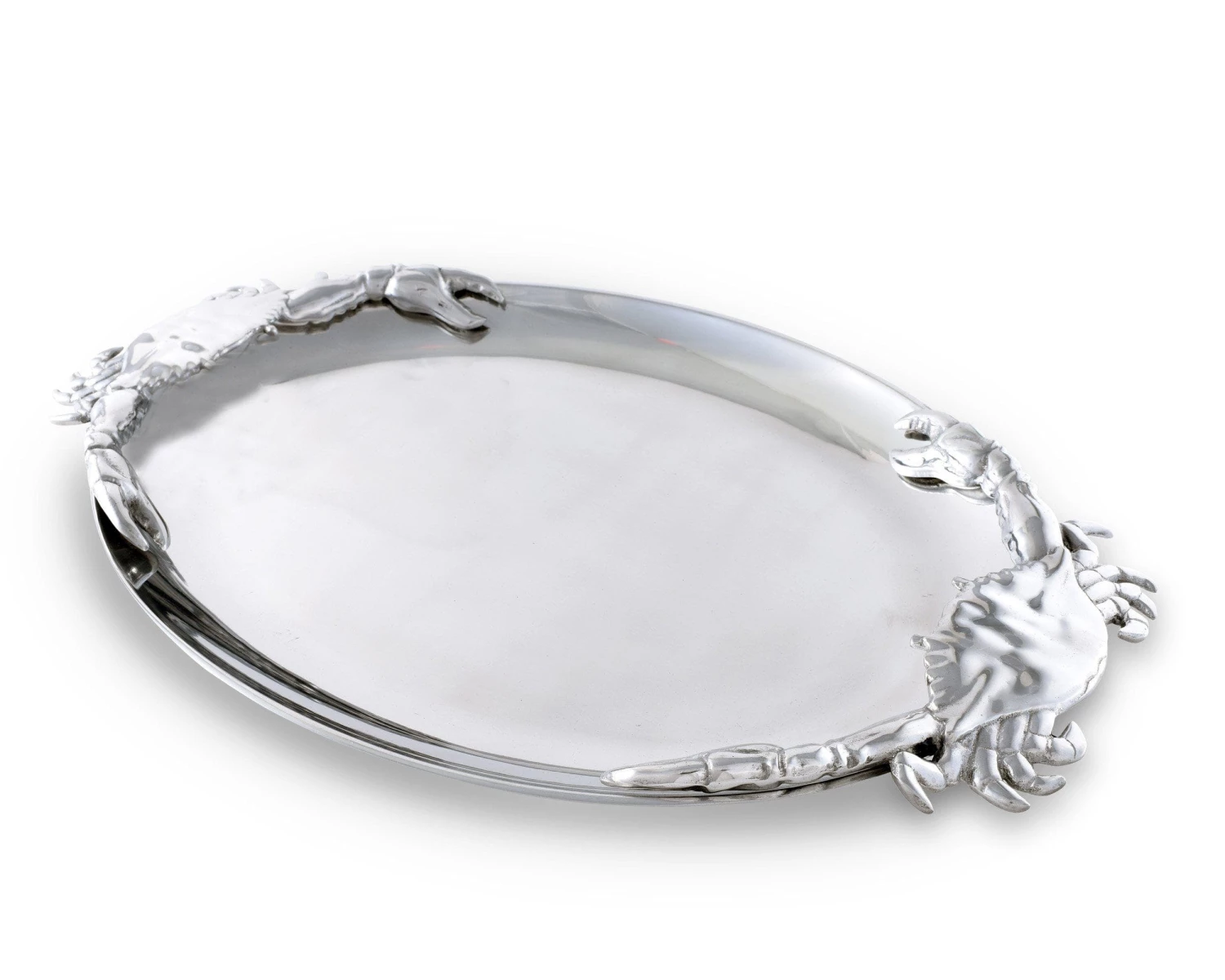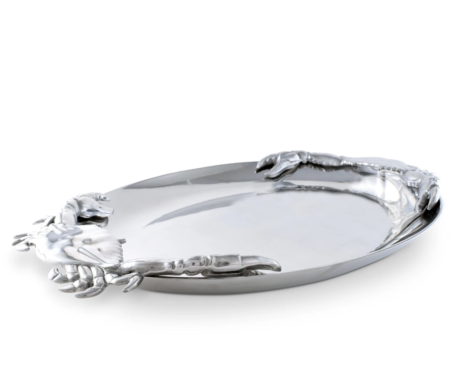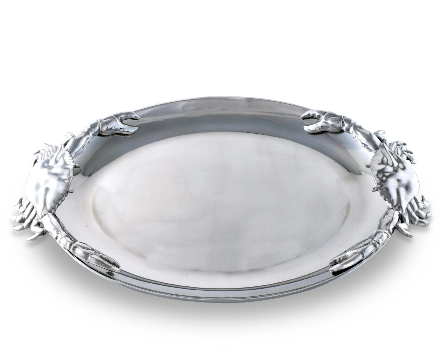 Guard your go-to dish with the help of this Crab Oval Platter from Arthur Court. Exquisite crustaceans rest on either side of this lustrous piece as they wait for an unsuspecting finger. The handmade, aluminum platter glistens on its own, but is the perfect accent to any colorful meal.