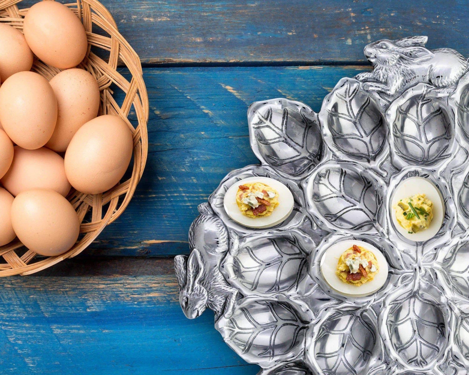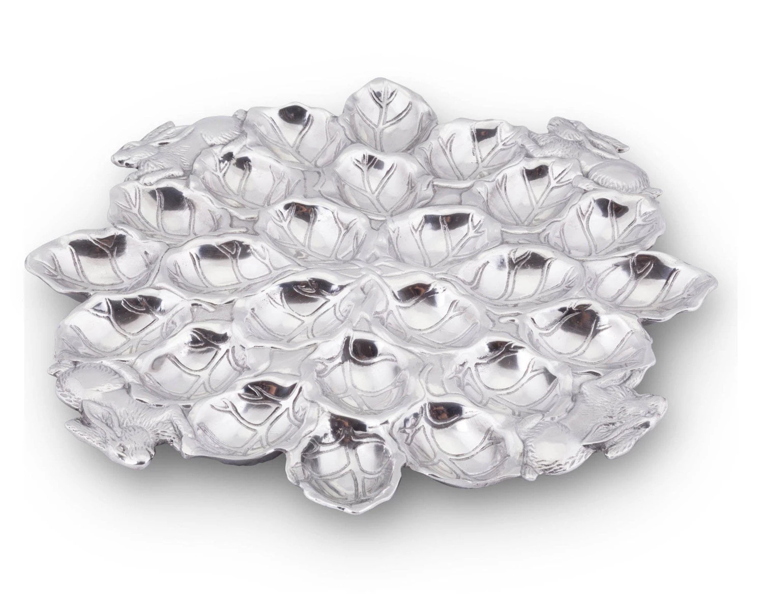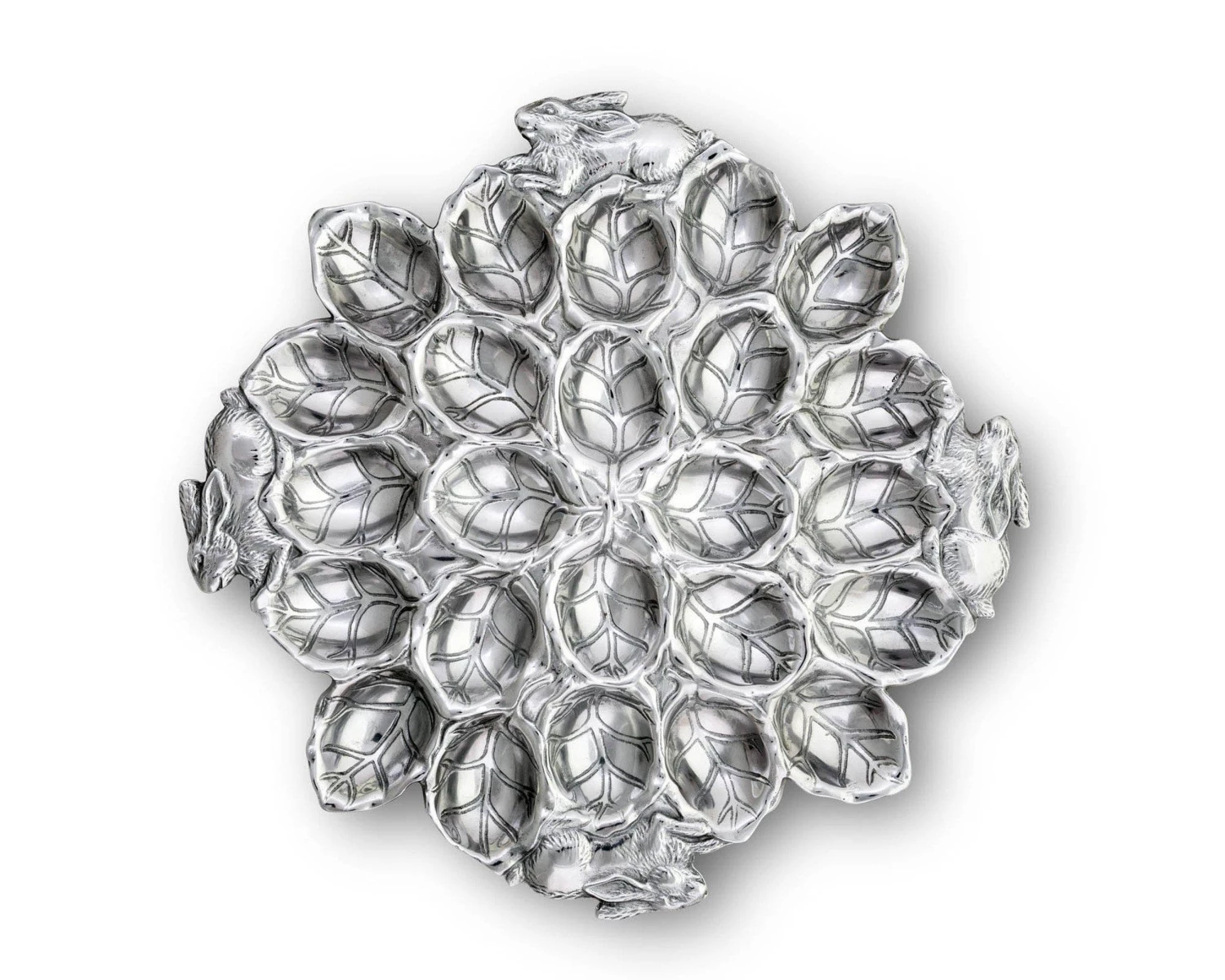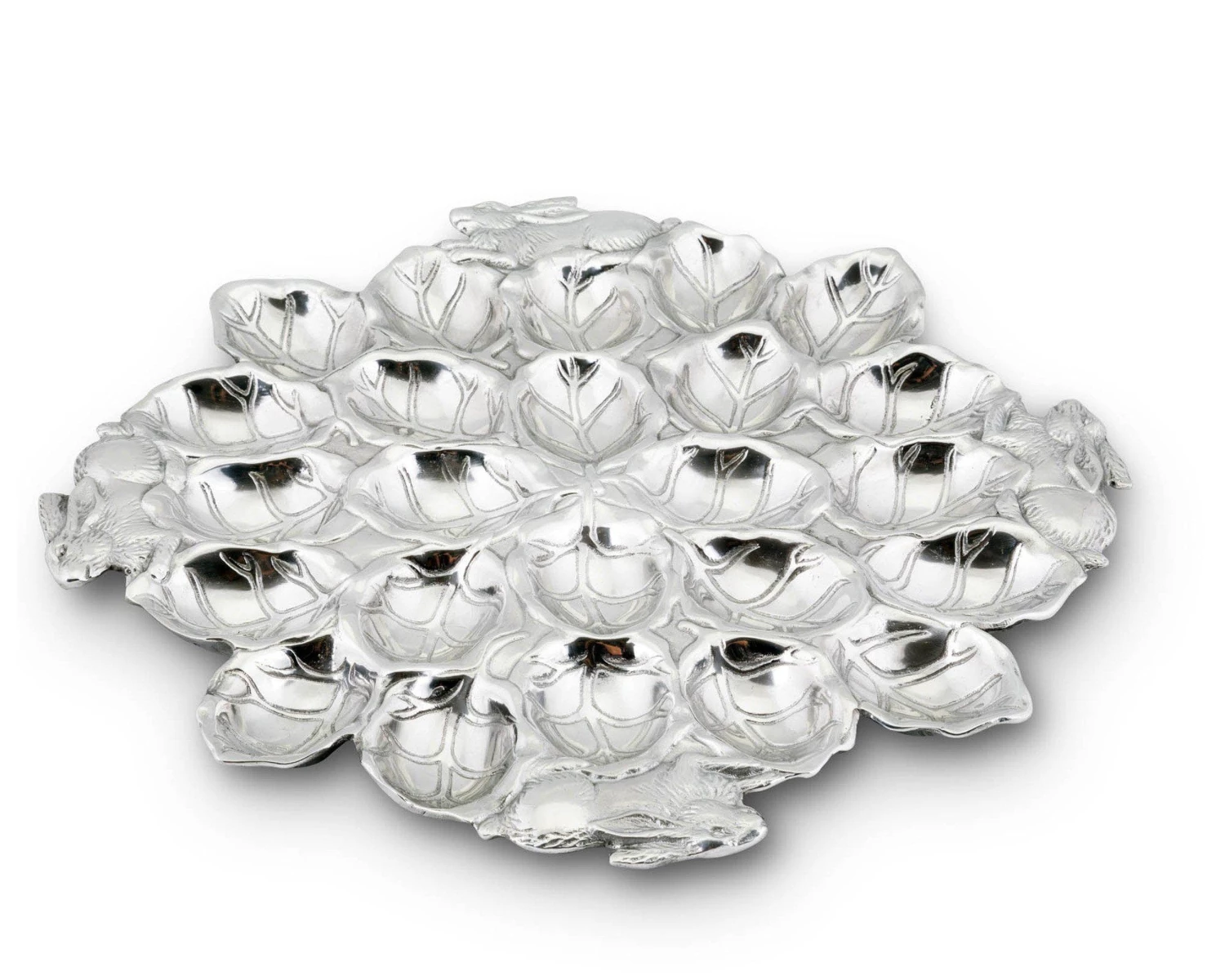 Beautiful rabbits nestle among the eggs on each side of this piece, while intricate veins run around and through the leafy-patterned holders. Handcrafted in aluminum, this design exhibits a brilliant luster against brightly-colored foods. Holds 24 Deviled Eggs.