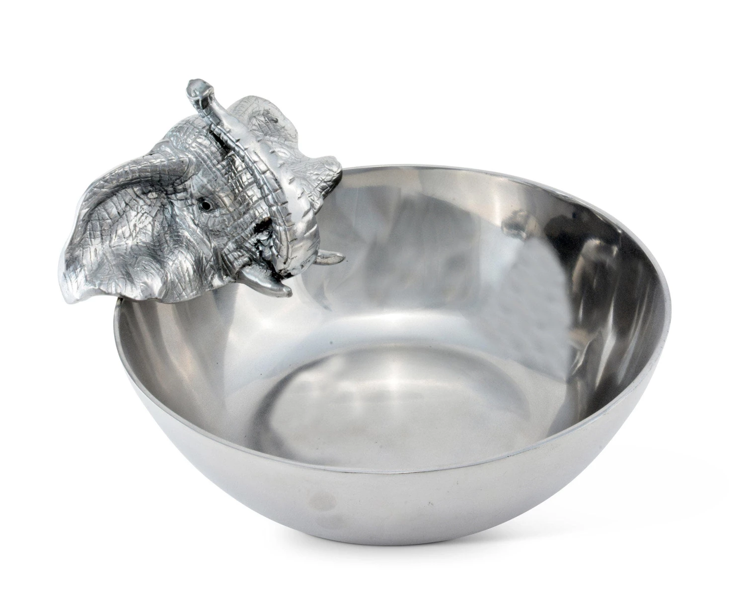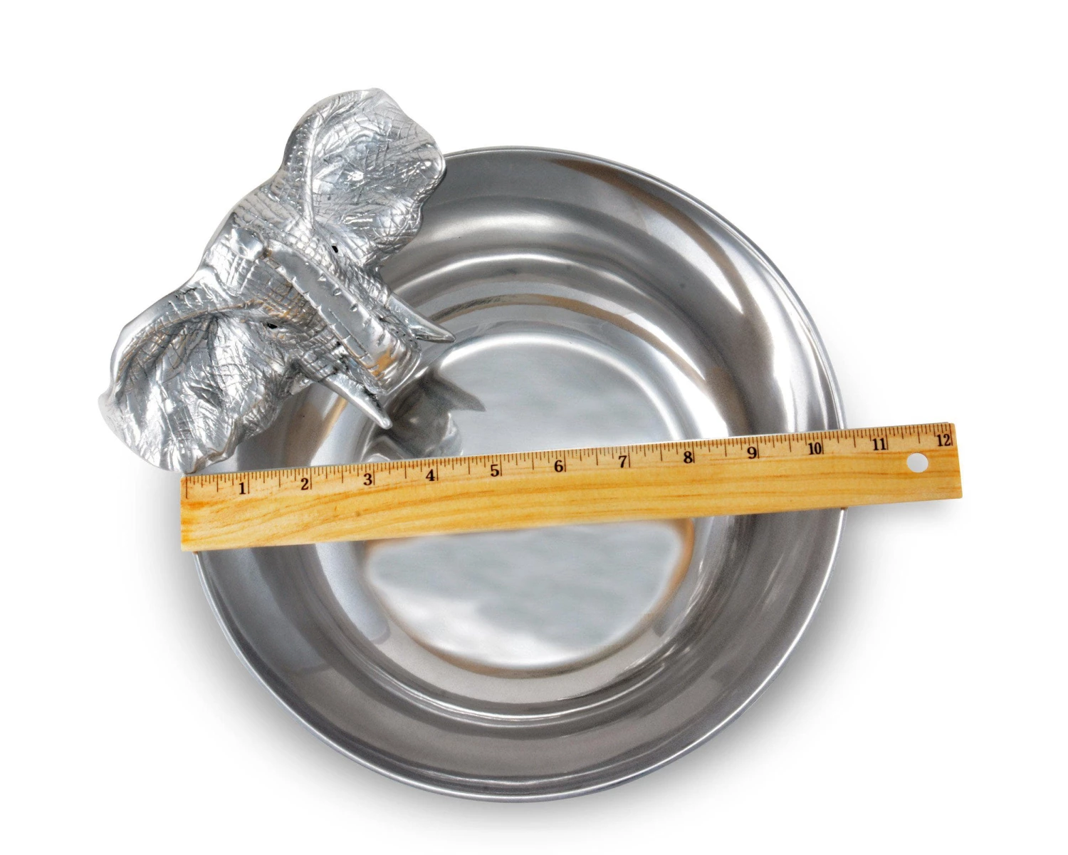 An elephant hangs its head over the side of this piece and waits to pounce on the delectable greens with its trunk. The animal’s realistic detail and lustrous, aluminum finish stand out beautifully against colorful vegetables.