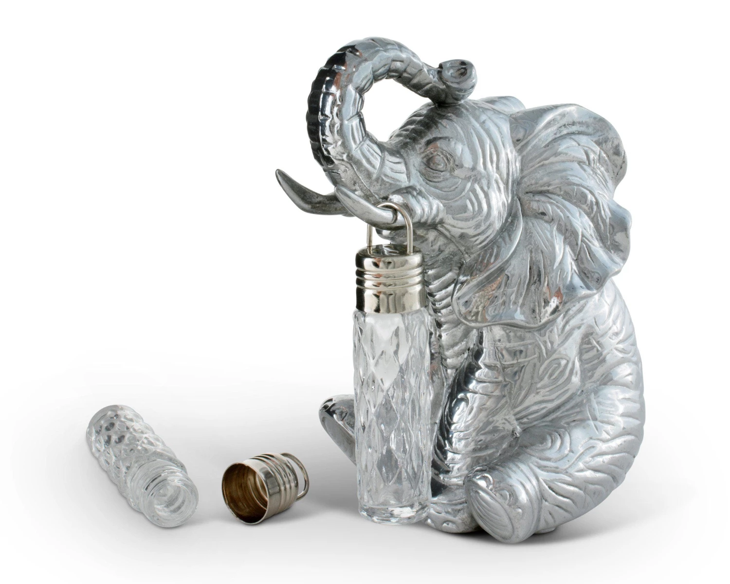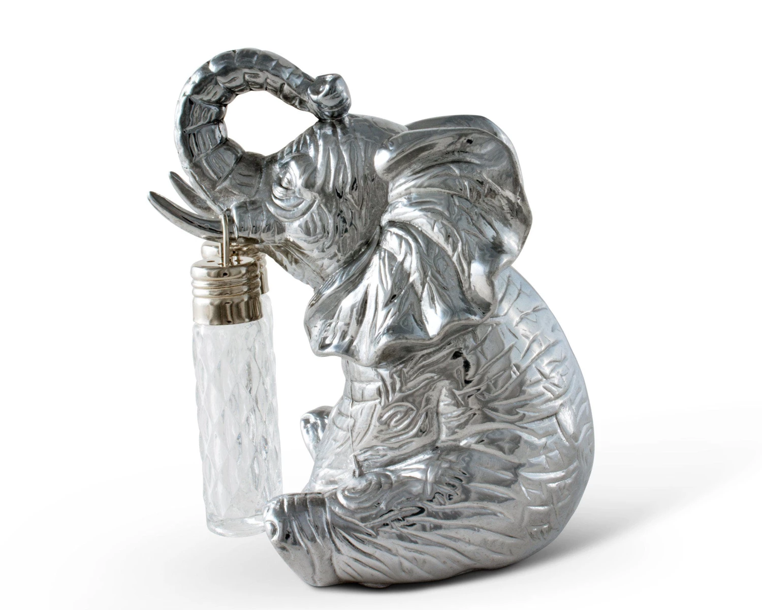 A plump elephant postures up off its backside to hang the removable dispensers from its tusks. Handcrafted in sand-cast aluminum, the statuette displays incredible detail in its textured skin and lifelike features.