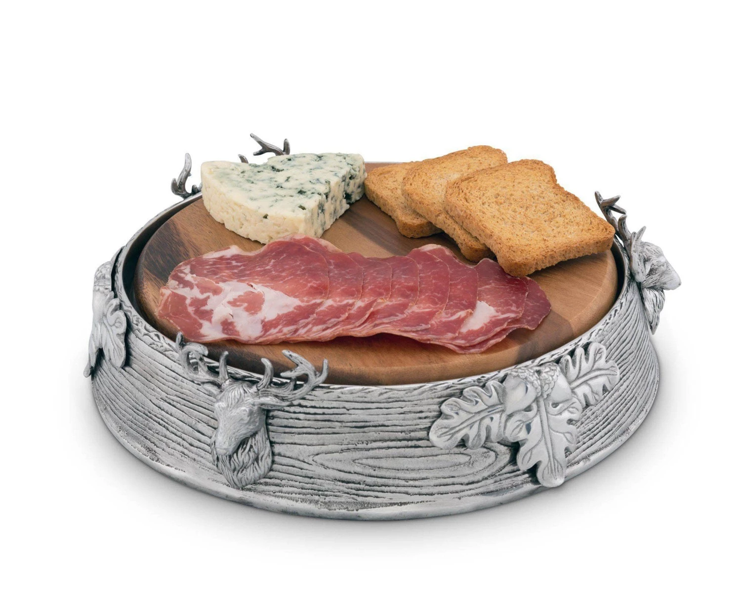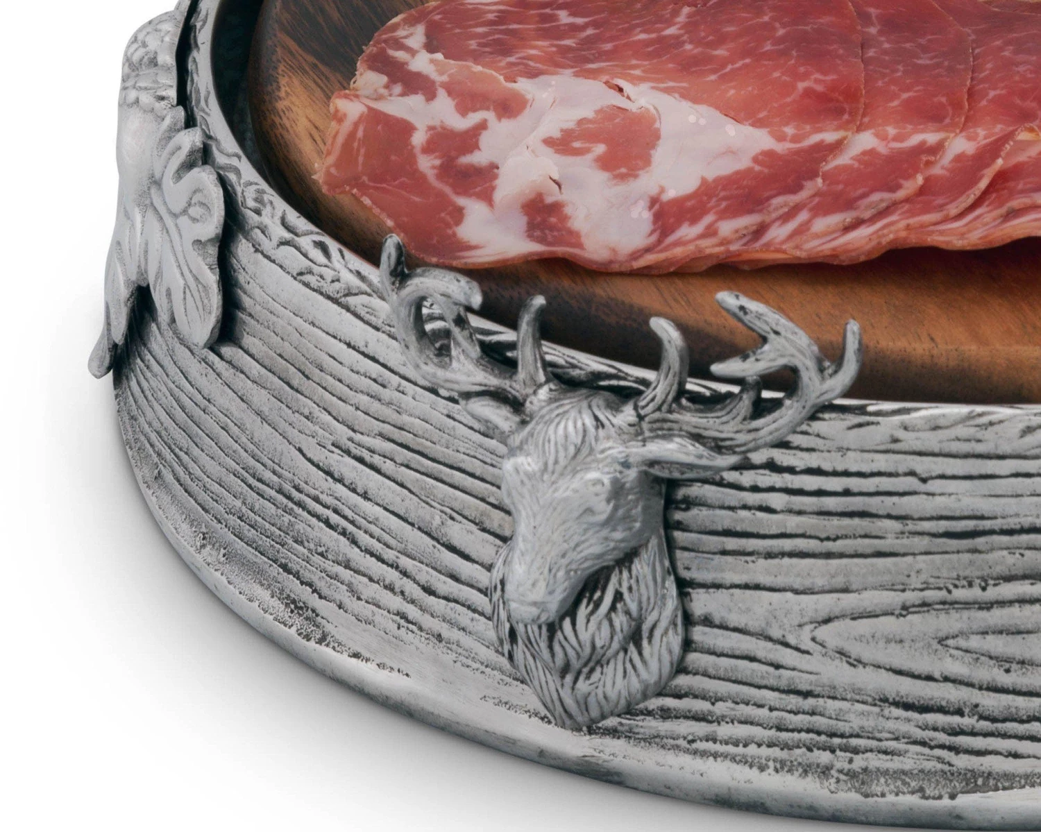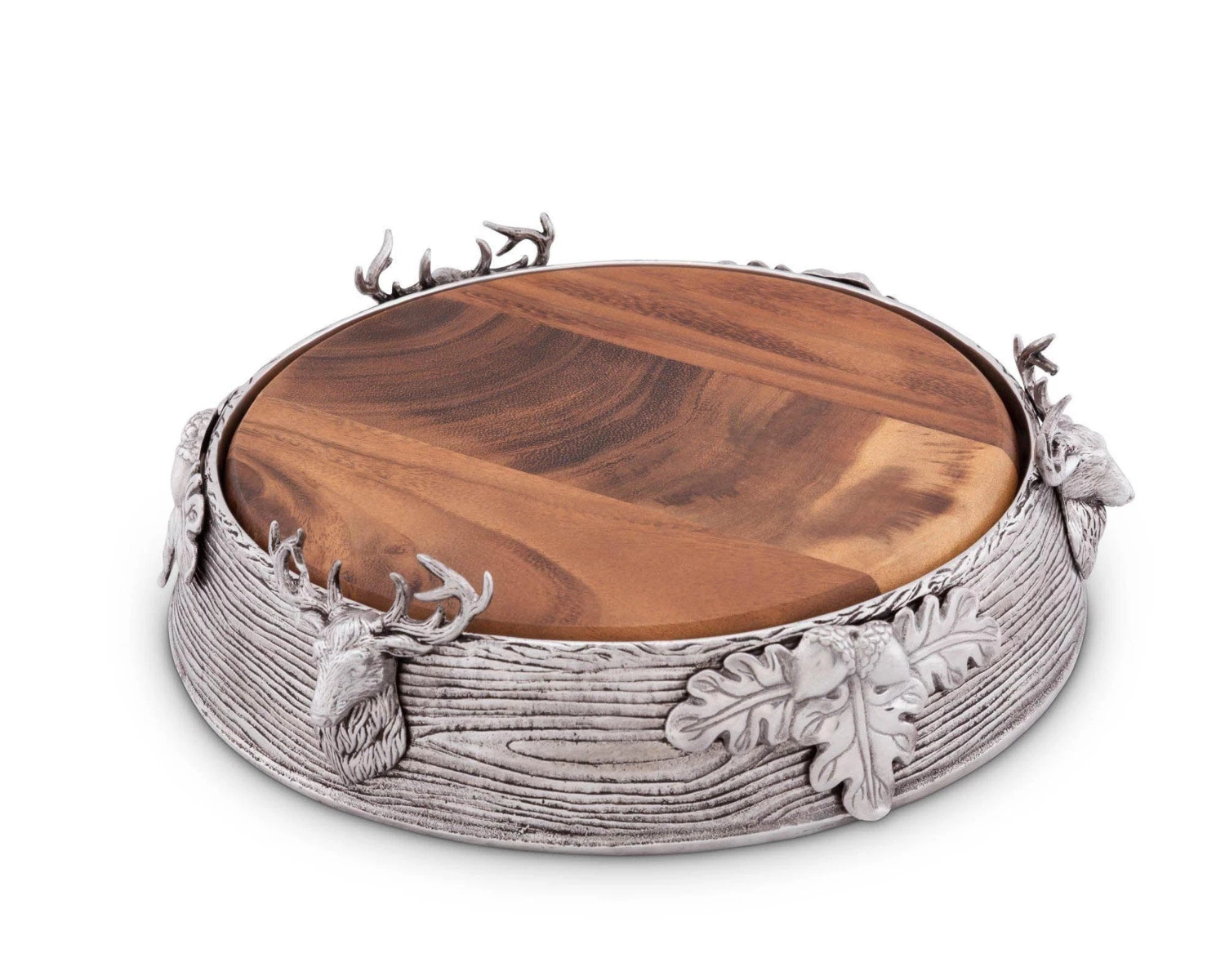 A truly unique serving piece, you will not find another remotely like Arthur Court’s Elk Motif Cheese Pedestal. This stand is a conversation piece with the bonus of providing beautiful service for cheese or desserts. Figural elk heads with full racks of antler are spaced with acorn and oak leaf raised medallions around the bark like rendition of our signature aluminum alloy stand. A round, 10-inch diameter, chatoyant Acacia board fits well into the ring and removes for easy cleaning.