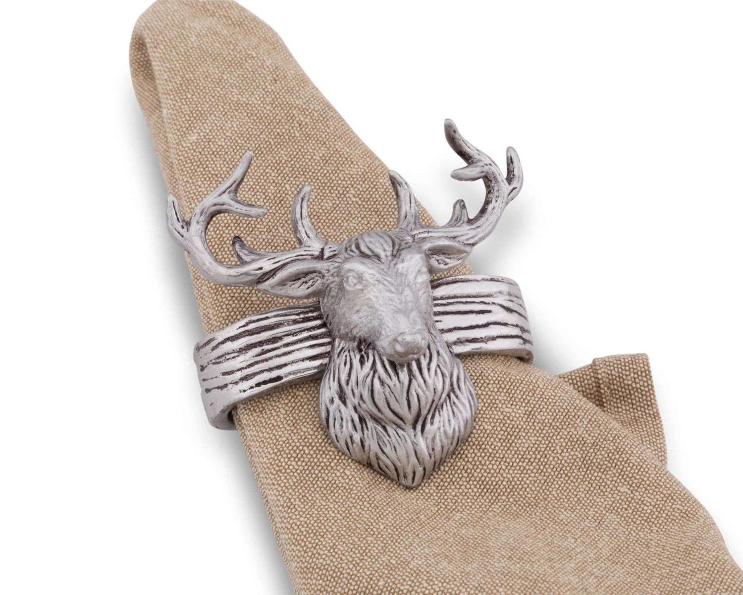 Arthur Court’s signature sand-cast aluminum alloy is cast to recall the markings of a tree trunk for the actual ring, a detailed figural Elk head embellishes each ring in this unique four piece set. Lightly antiqued to define details, these napkin rings will become a family favorite table accent.