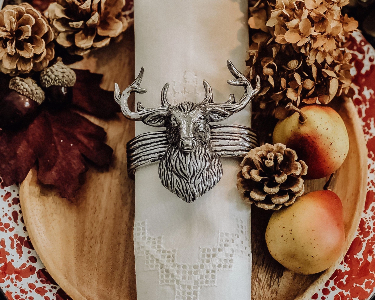 There is something about Elk that makes them seem the most noble of the deer family. The soulful eyes, the magnificent racks of antler. Arthur Court’s Designers have captured that noble style in this set of 4 aluminum napkin rings with a figural Elk head