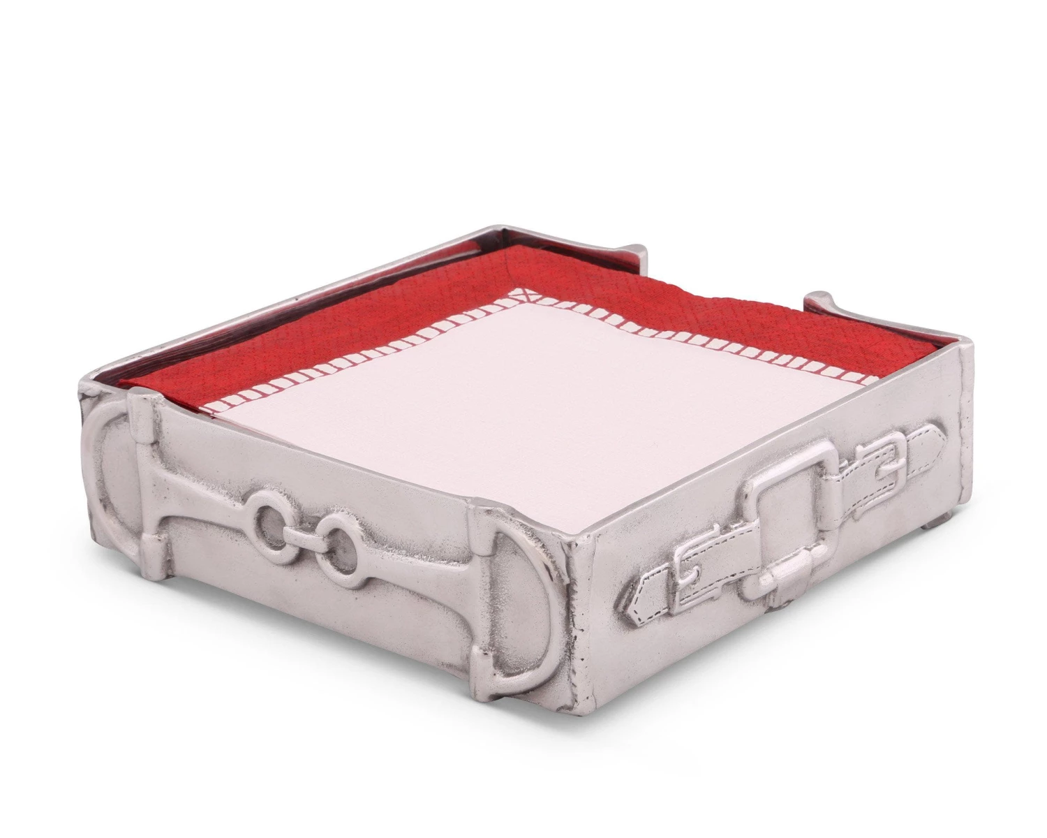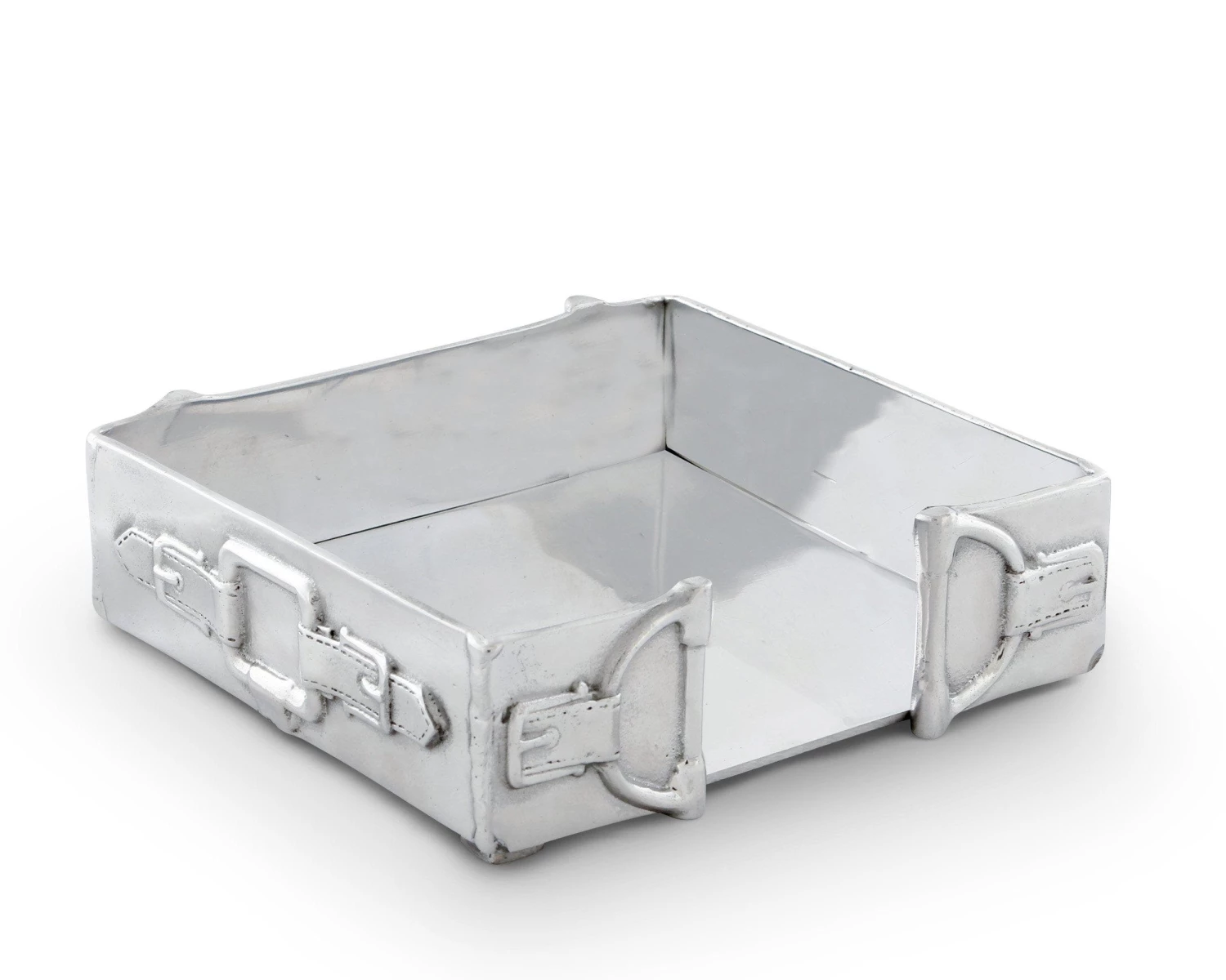 Present your paper napkins with Western flair in this Equestrian-themed luncheon napkin box from Arthur Court. Thick sand-cast aluminum is worked on each side with a detailed tooled leather strap, stirrup, and spur design to appeal to horse lovers. Each seam of the strap and hook of the buckle is finely wrought, crafted from designer aluminum alloy metal. The small half-bit pieces border each edge of the gap for filling and removing napkins. This napkin holder can be washed with gentle soap and water, then dried. The Equestrian napkin holder arrives in a gift box, ready to present to the horseback rider in your life.