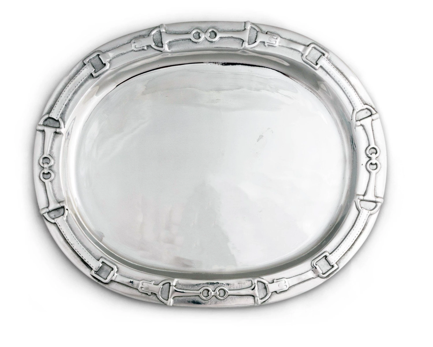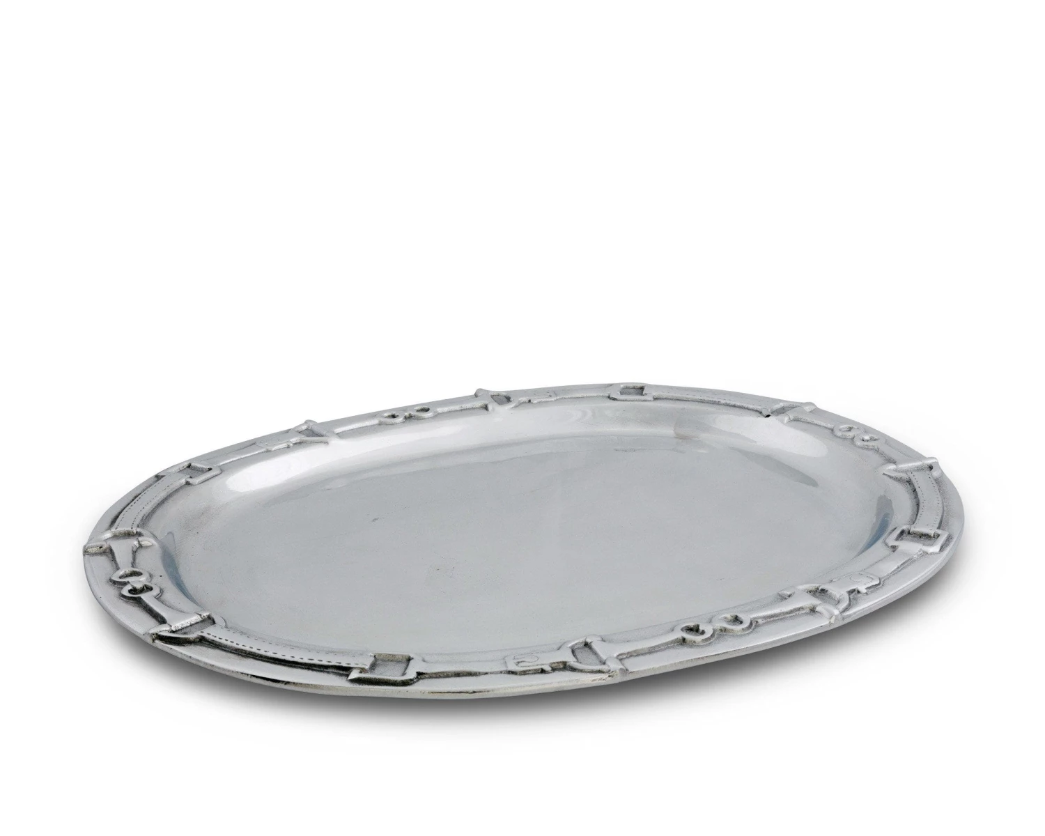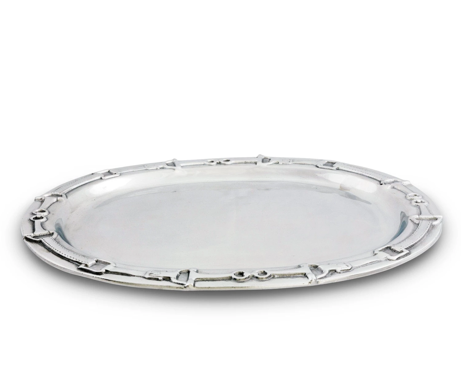 Pay tribute to the track with this Equestrian Oval Platter from Arthur Court. Bits race around the edge of this dish like the horses that wear them. Leathery straps wrap around the rein rings before fastening the riding instruments together in a continuous lap of movement.