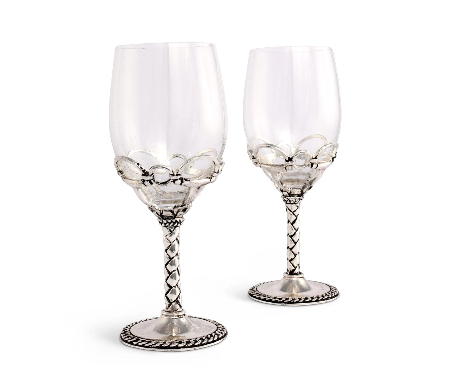 The wine glasses feature enchanting details that any horse lover will encounter fascinating, the base is rounded by a beautiful curb chain, the stem depicts a fine horsewhip and the bowl details a delicate rein rings pattern.