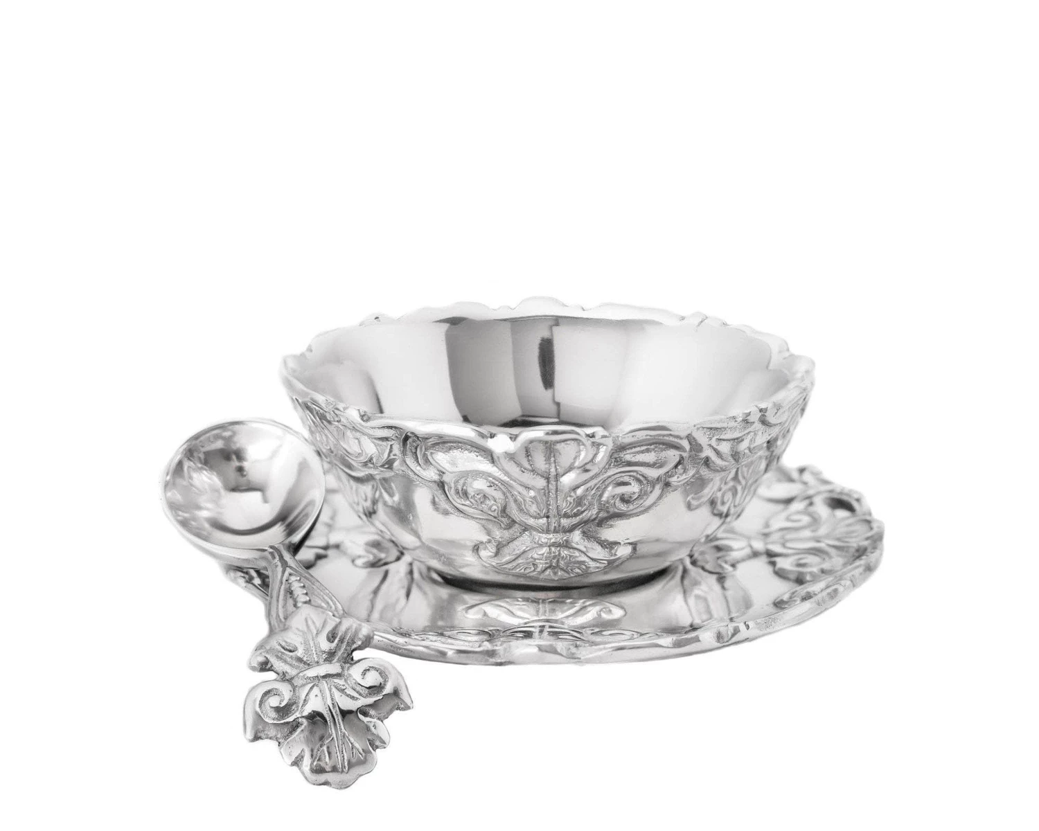 Size: Plate is 7″ dia., bowl is 5-1/4″ dia. Spoon is 5″