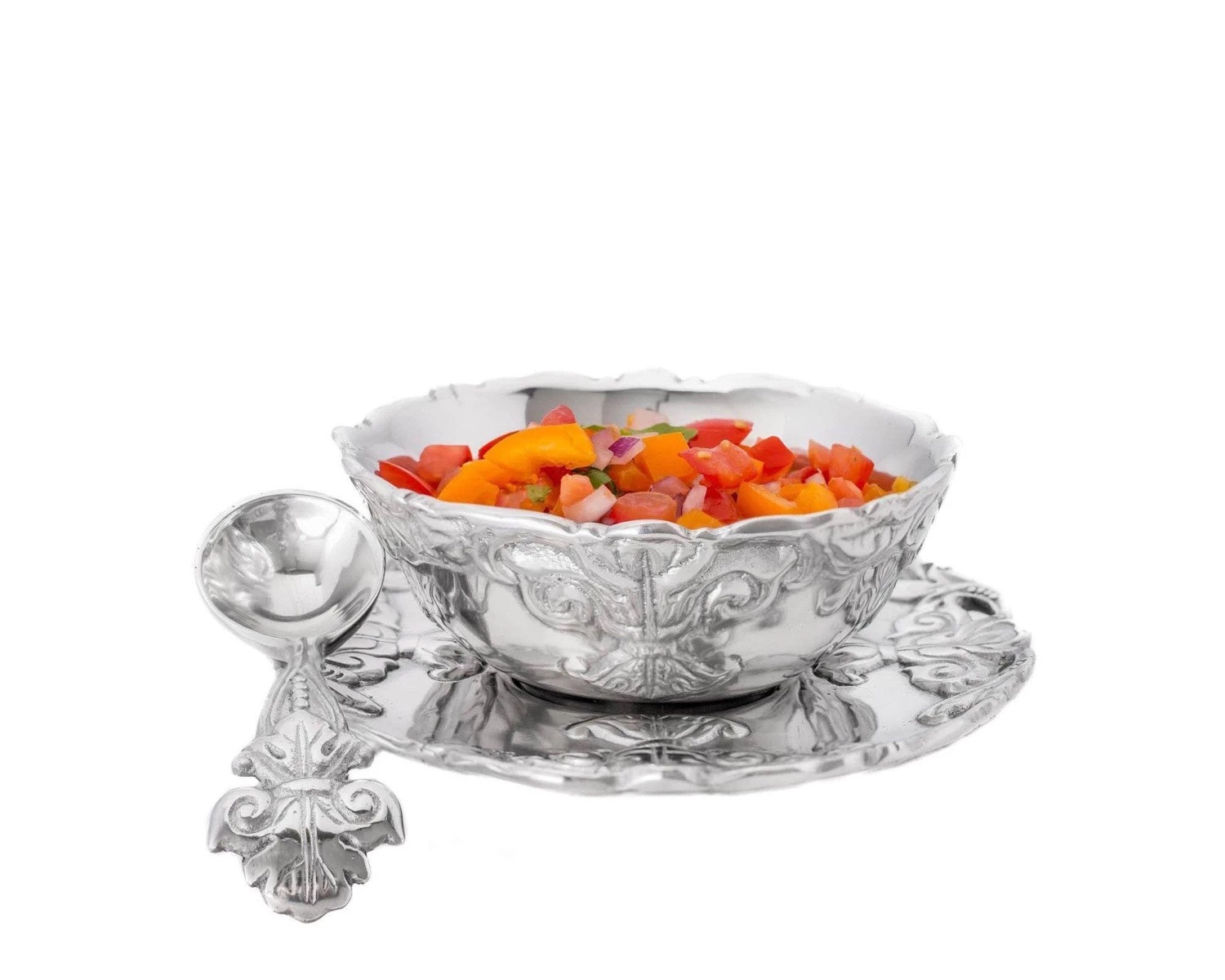 Feel each heavy line and swirl of the fleur-de-lis symbols as you grip the spoon, bowl and dish. Their incredible detail reflects in the rough texture of these pieces. The handmade, aluminum design of this three-piece set is the perfect backdrop for colorful garnishes and sauces.