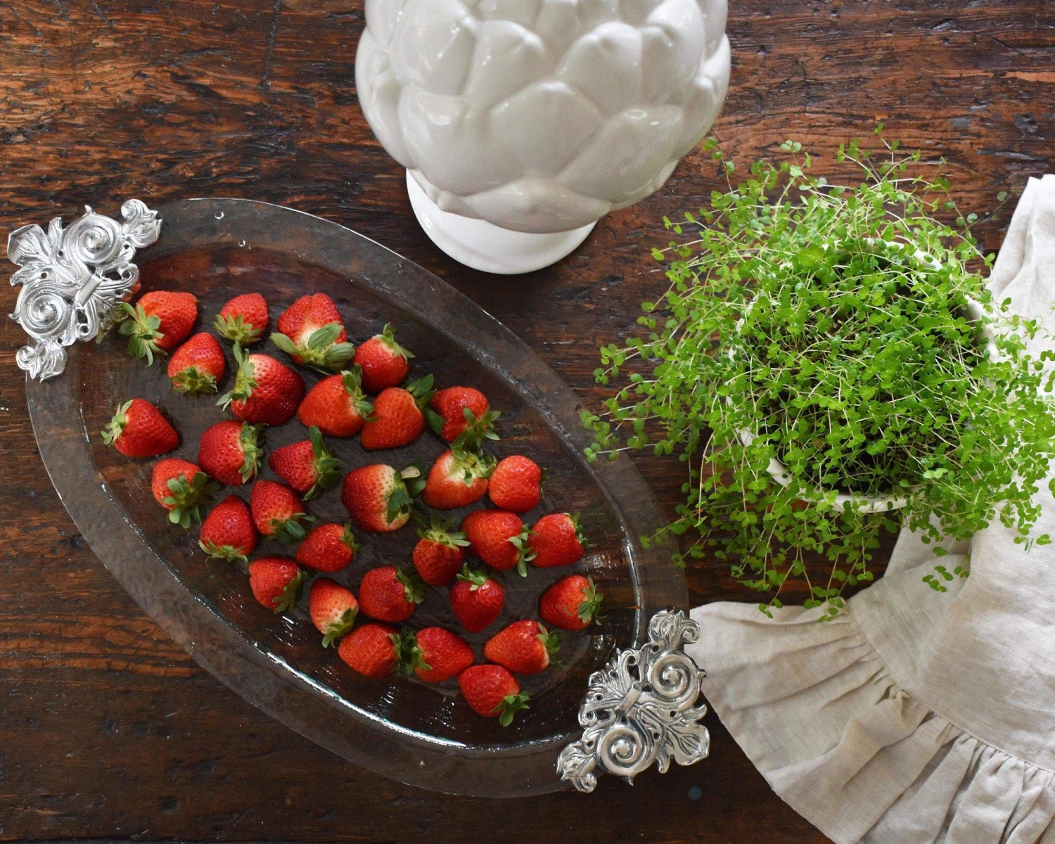 Symbolic of French royalty, fleur-de-lis emblems rest on each end of this piece and act as handles. Each swirl and line in these handmade, aluminum designs gleams brillinatly against the clear platter.