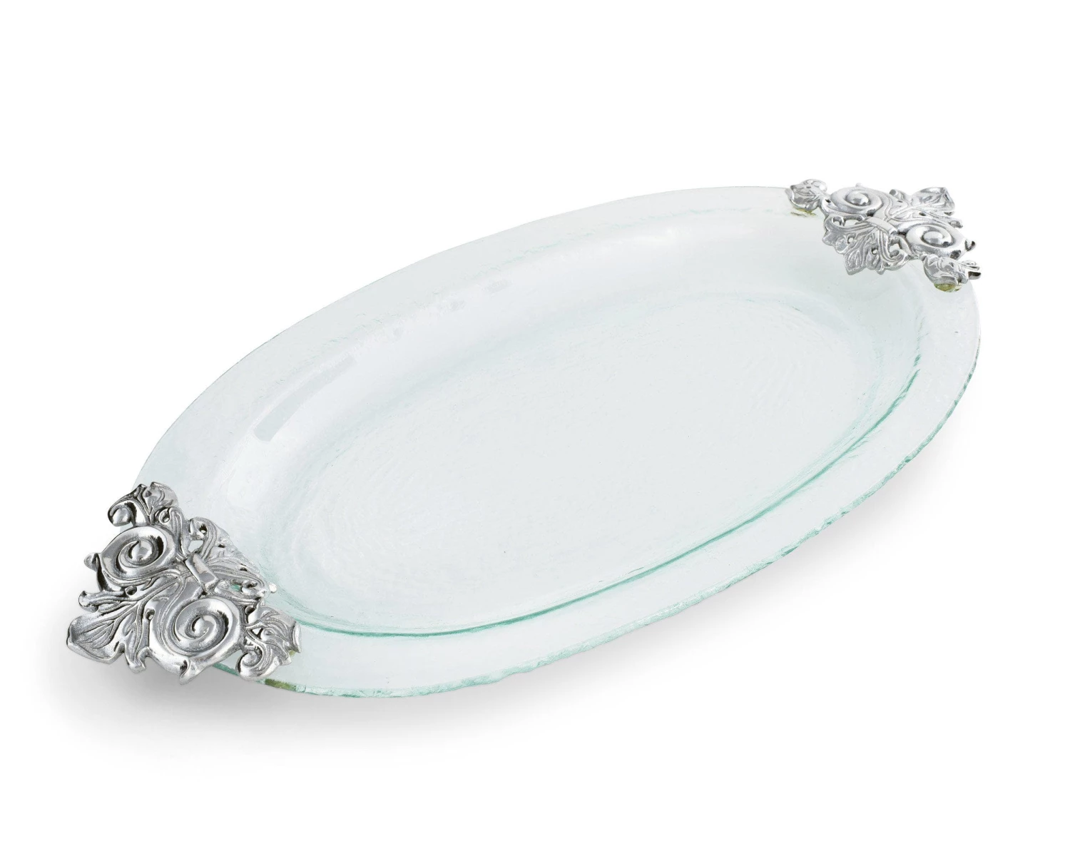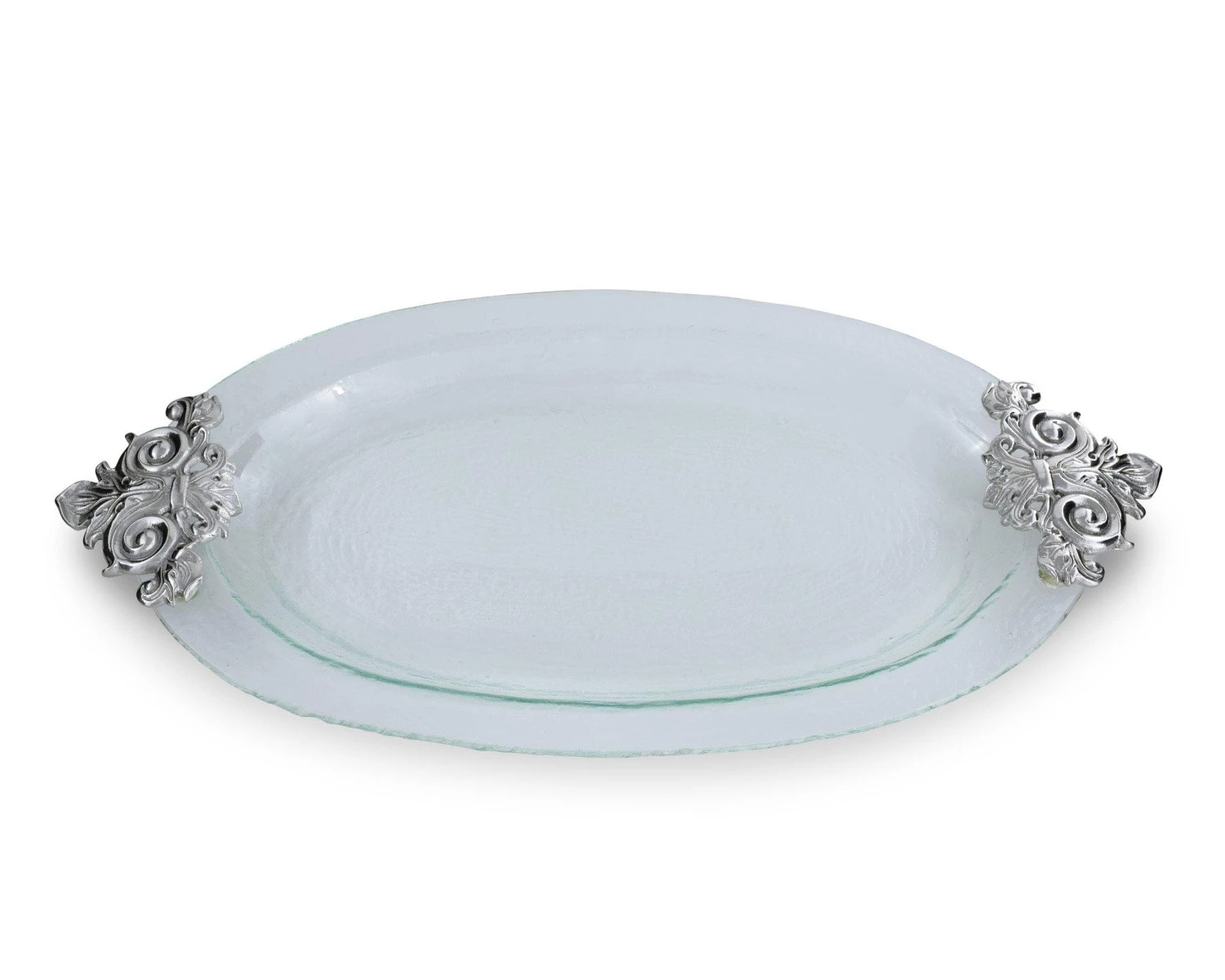 Make gatherings a regal affair with this fleur-de-lis glass platter by Arthur Court. The swirled texture of the clear glass base lends a sense of dimension to this 11 x 21.5-inch server, while the elevated edging helps secure food in transit from your kitchen to your table. Rely on the sturdy sand-cast aluminum handles to assist transport of your culinary creations, and enjoy how the elegant silver-tone finish melds effortlessly with numerous decor styles and palettes. The stylized lilies that form the classic French fleur-de-lis symbol on the handles evoke a sense of royalty and luxury, adding an upscale feel to everything from family gatherings and holiday get-togethers to professional dinner parties and intimate one-on-one meals. Maintenance after use requires only handwashing with mild soap and immediate drying, making after-event cleanup fast and easy. Boxed for gifting, this beautiful fleur-de-lis platter makes an excellent present for newlyweds, new homeowners and anniversary celebrants.