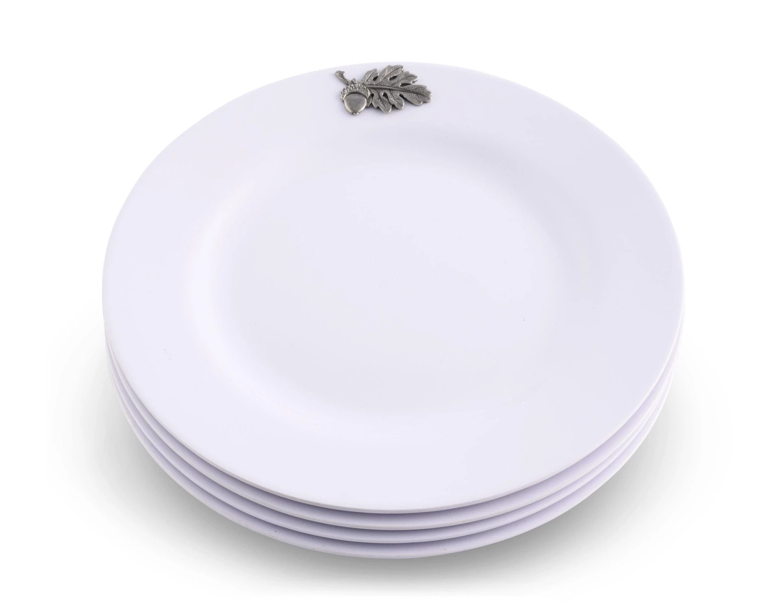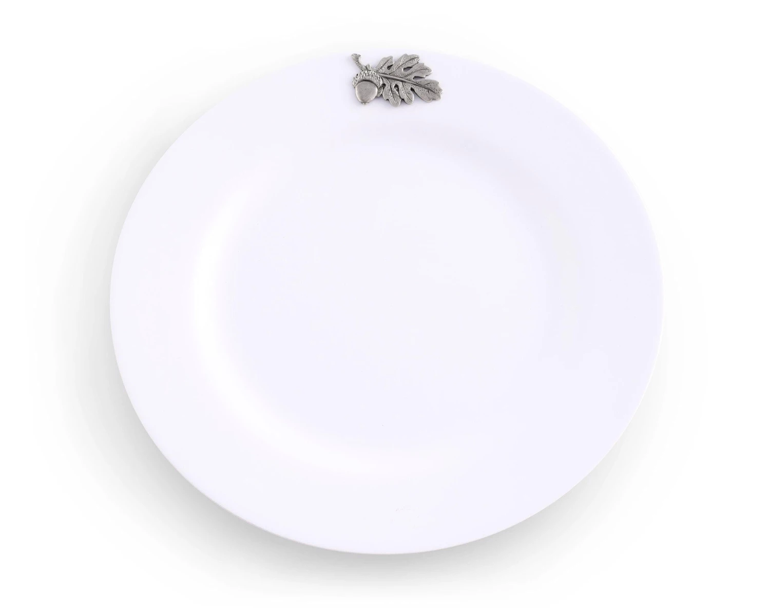 It is said that the best color for presenting food is white – and Arthur Court agree! White dishes make food look more elegant and appetizing. Our pure white Melamine resin is durable, fire and heat resistant and virtually unbreakable the perfect plate for outdoor dining. In true Arthur Court style, a detailed pewter metal Acorn and Oak Leaf is attached to rim to create classic dinnerware that will stand up to outdoor use but formal enough for indoor dining.