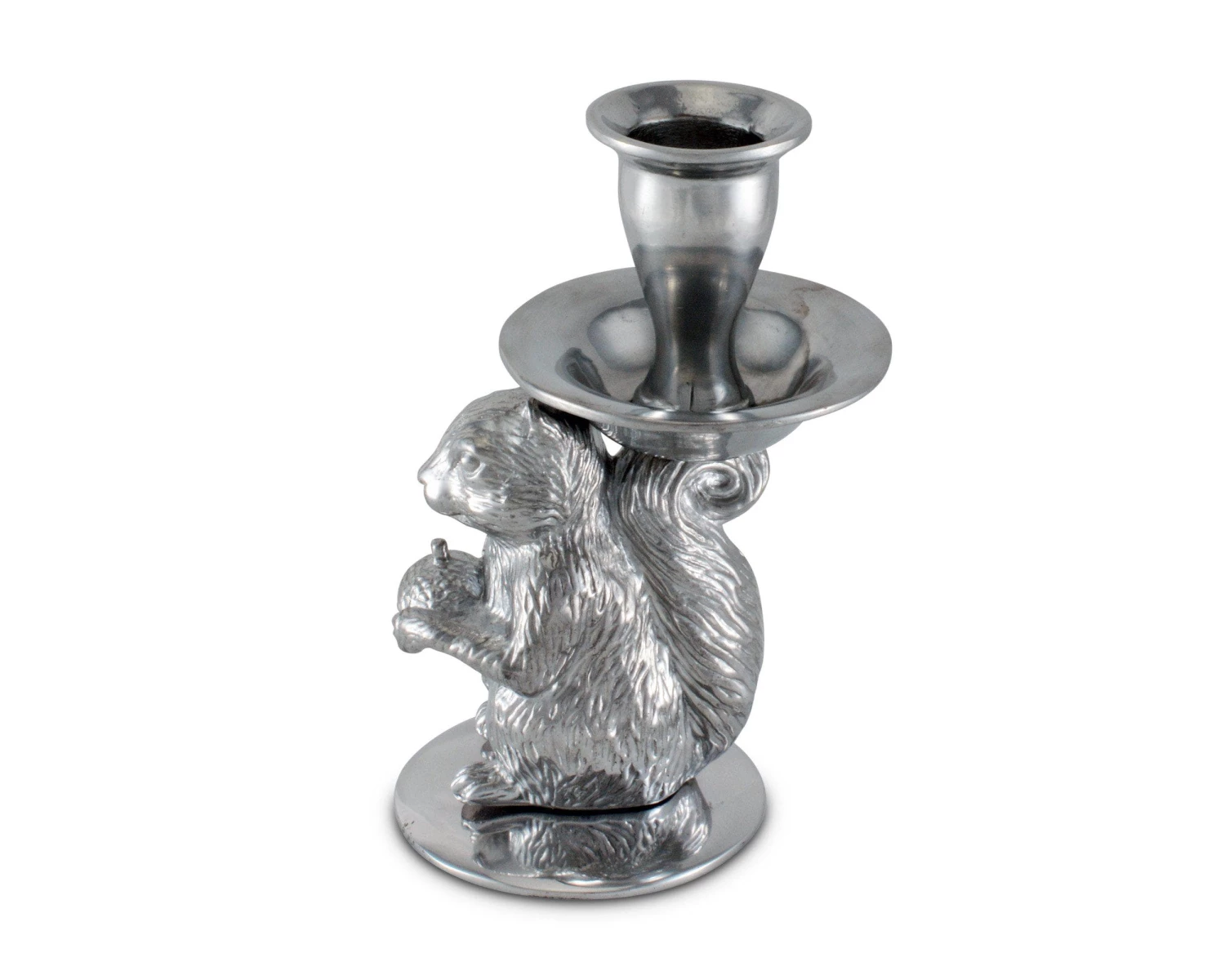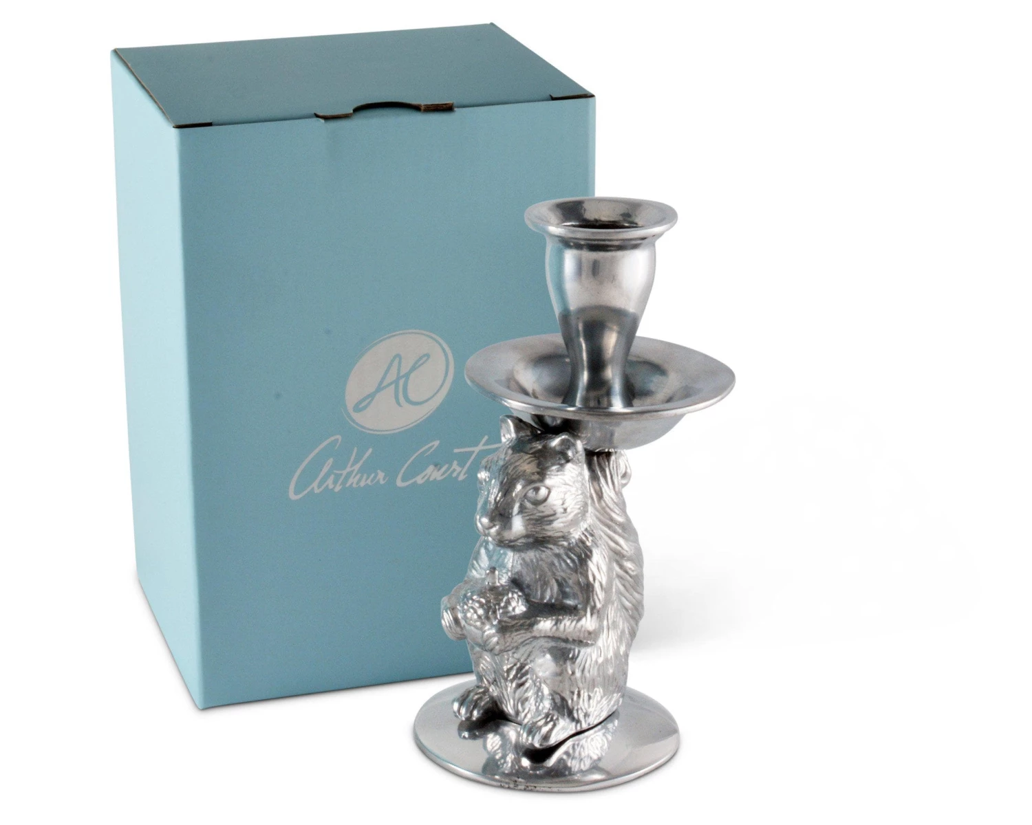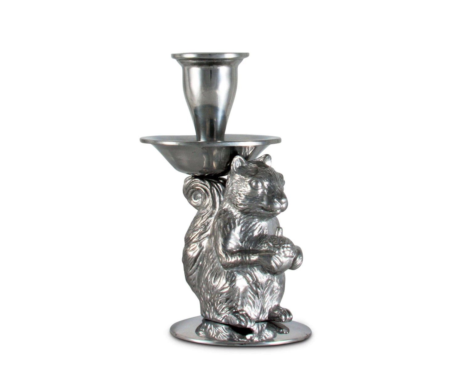 Arthur Court’s signature squirrel is ready to light up your home. Our whimsical and deftly detailed squirrel figure holds a precious acorn snack in his paws while balancing the taper candle cup on his head. A full circle drip tray surrounds the candle cup to protect your linens or furnishings from melting wax.