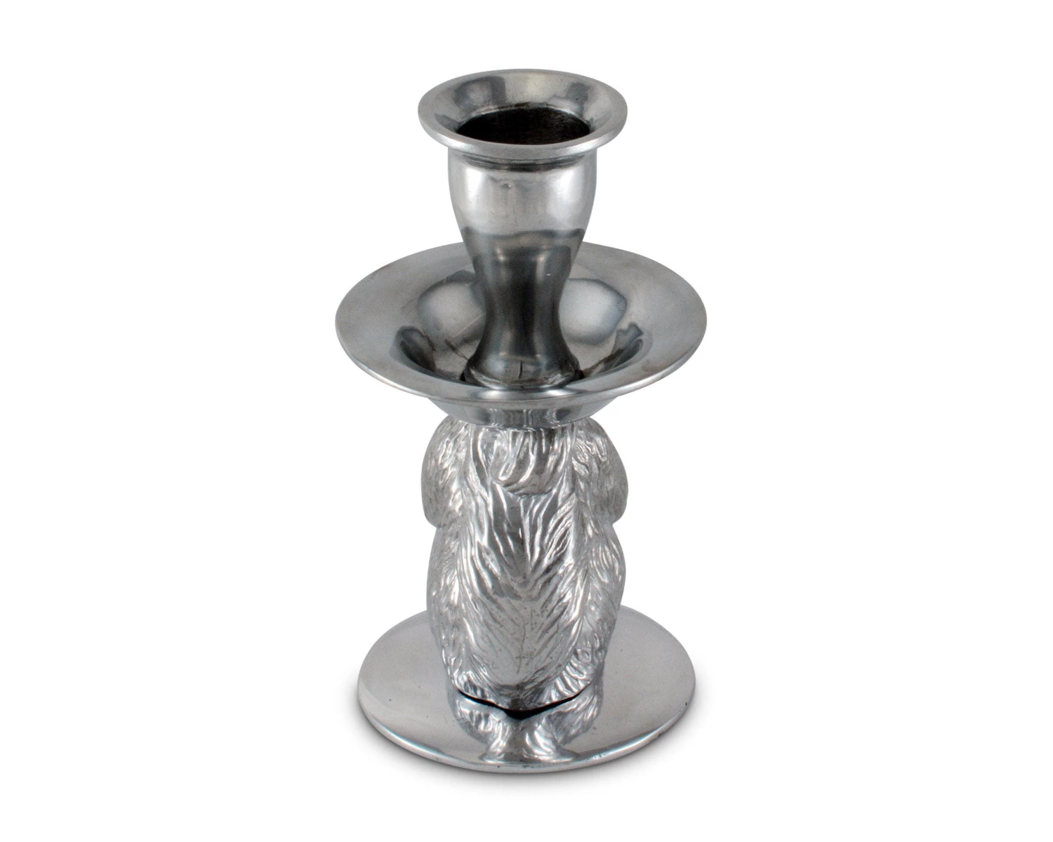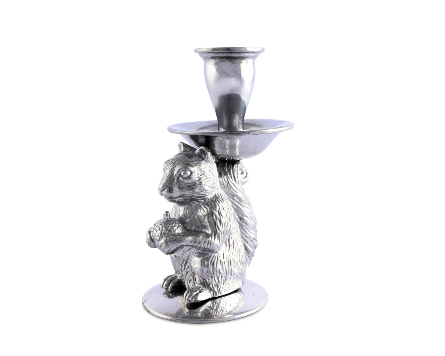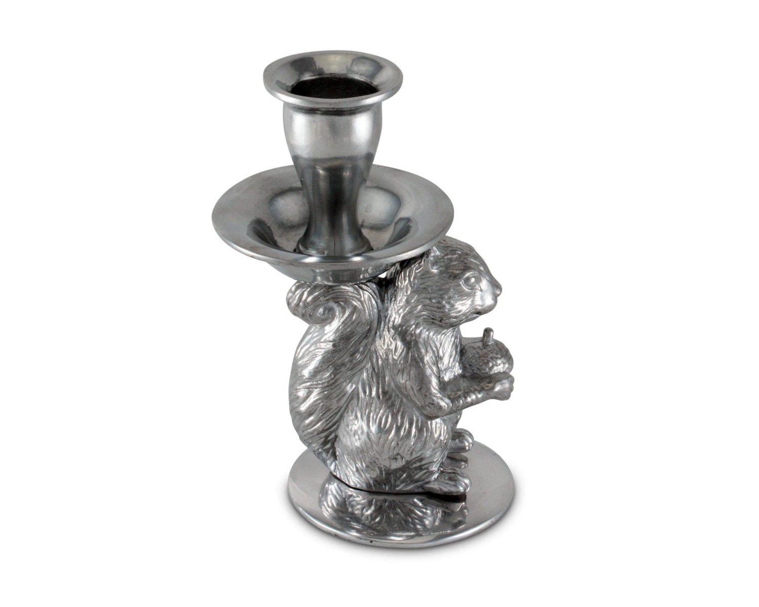 Arthur Court’s signature squirrel is ready to light up your home. Our whimsical and deftly detailed squirrel figure holds a precious acorn snack in his paws while balancing the taper candle cup on his head. A full circle drip tray surrounds the candle cup to protect your linens or furnishings from melting wax.