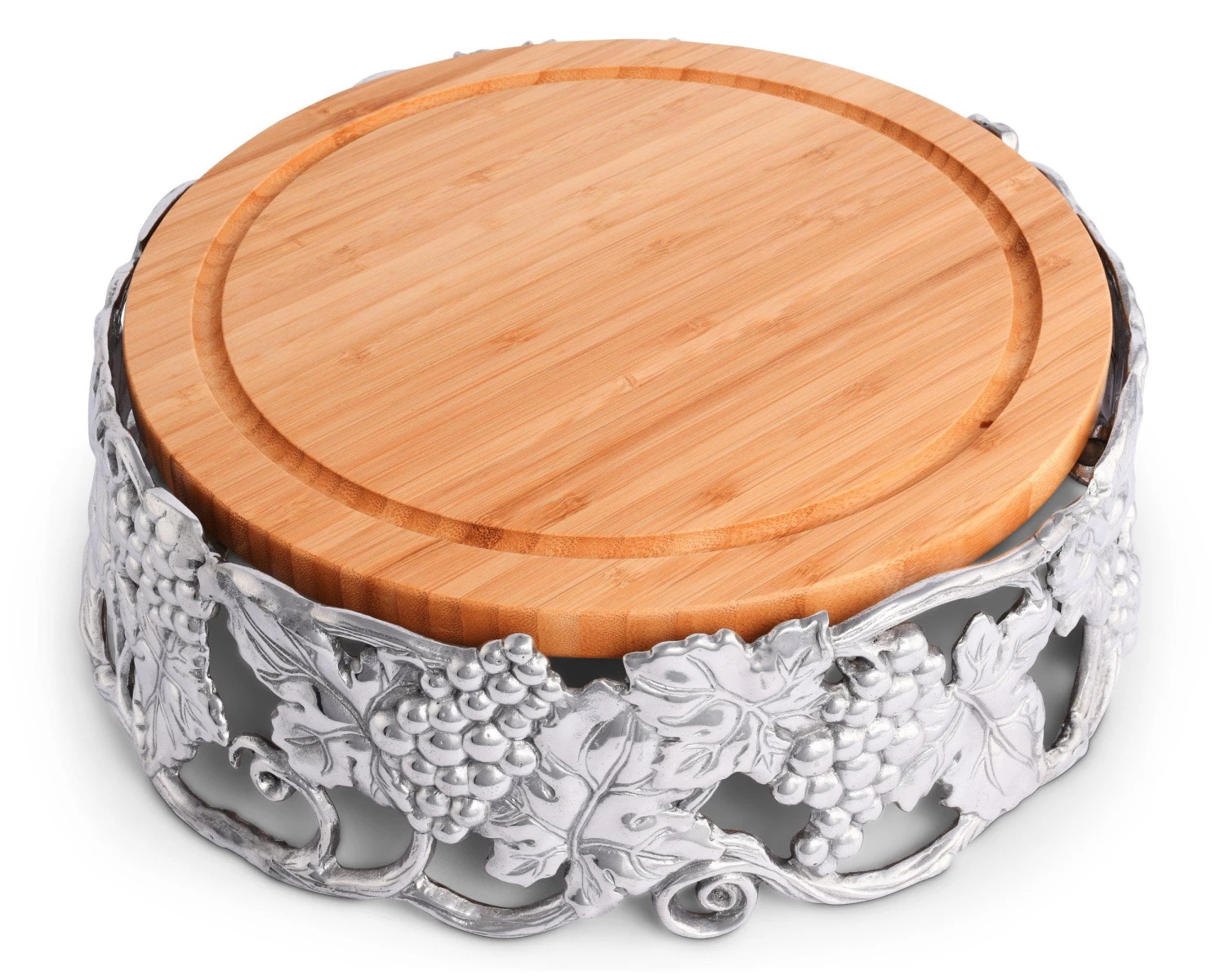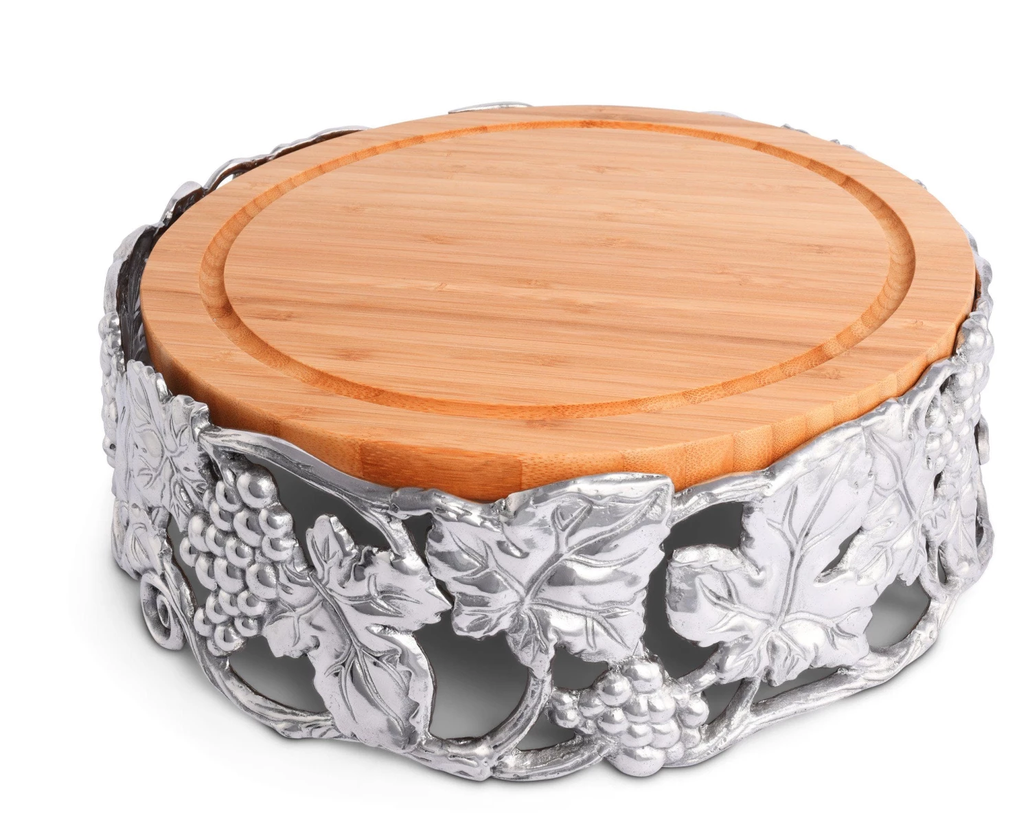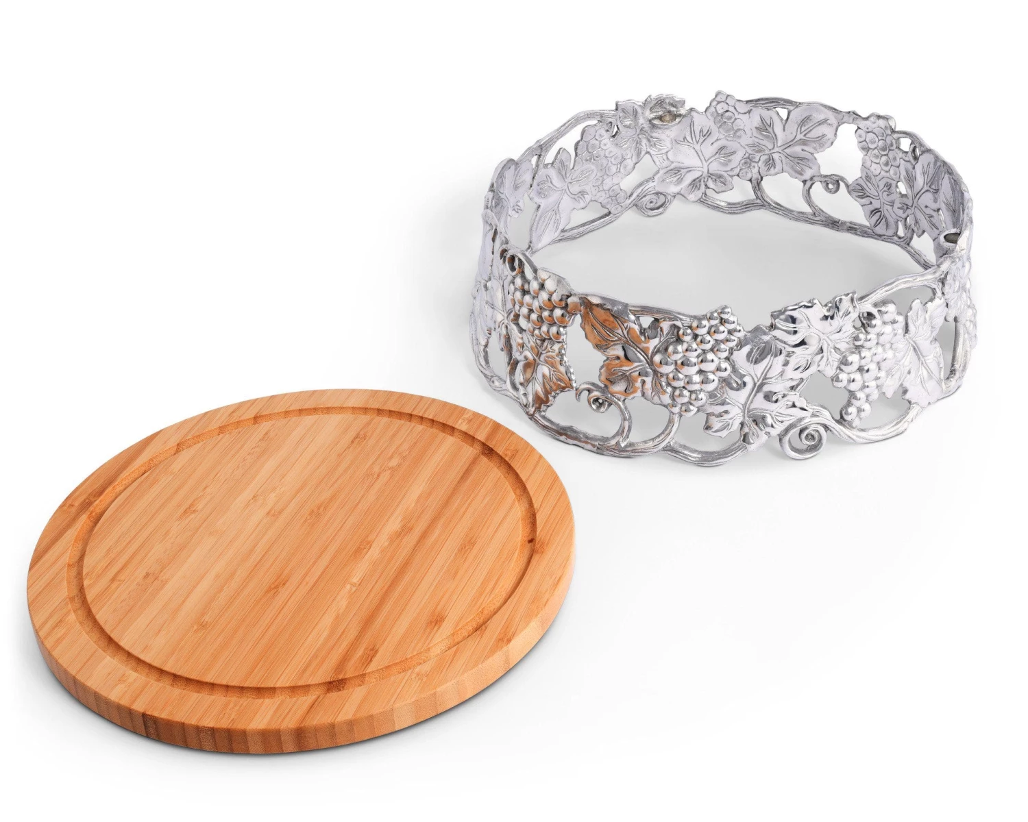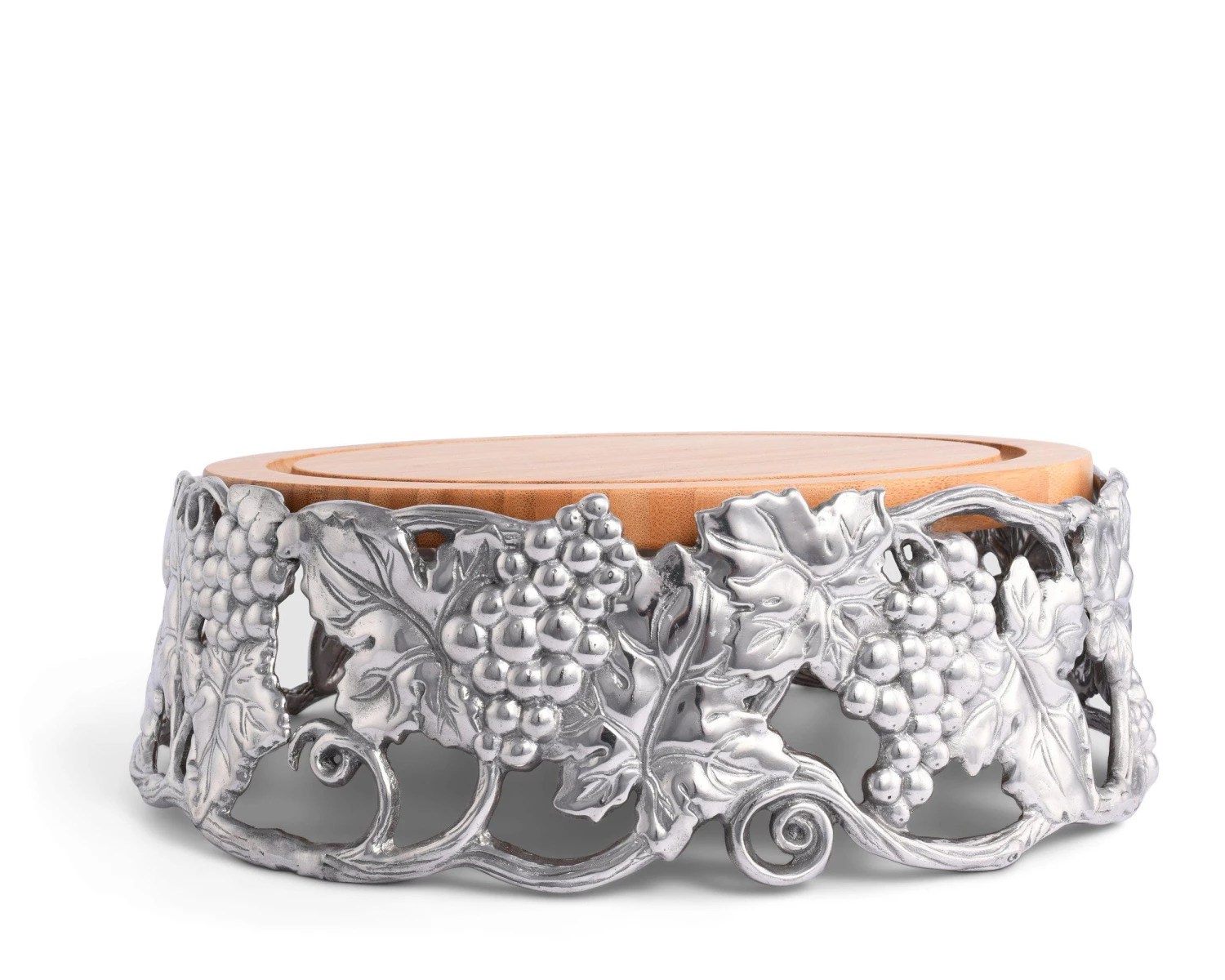 Bundles of grapes and veiny leaves extend off of vines that line each end of the openwork stand. The handmade, aluminum pedestal displays a brilliant luster against the removable, acacia insert.