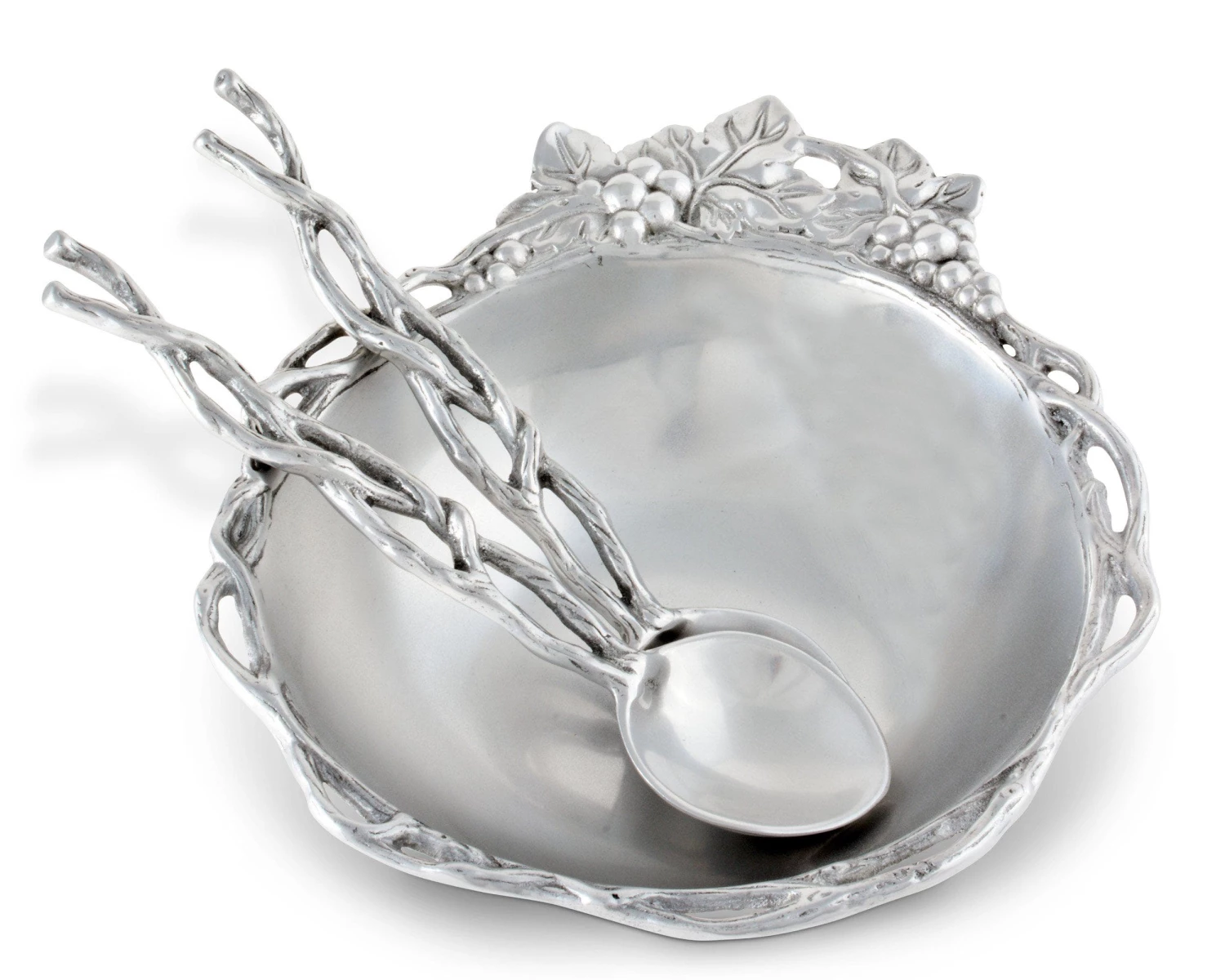 An openwork pattern displays in each of these handmade, aluminum pieces as vines form the bowl’s edge and the servers’ handles. Intricate bundles of grapes inject more realistic detail into the design as they briefly interrupt the dish’s twisting rim on one side.