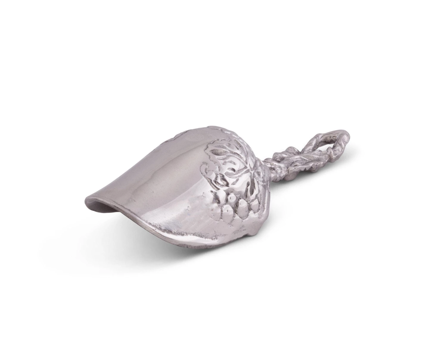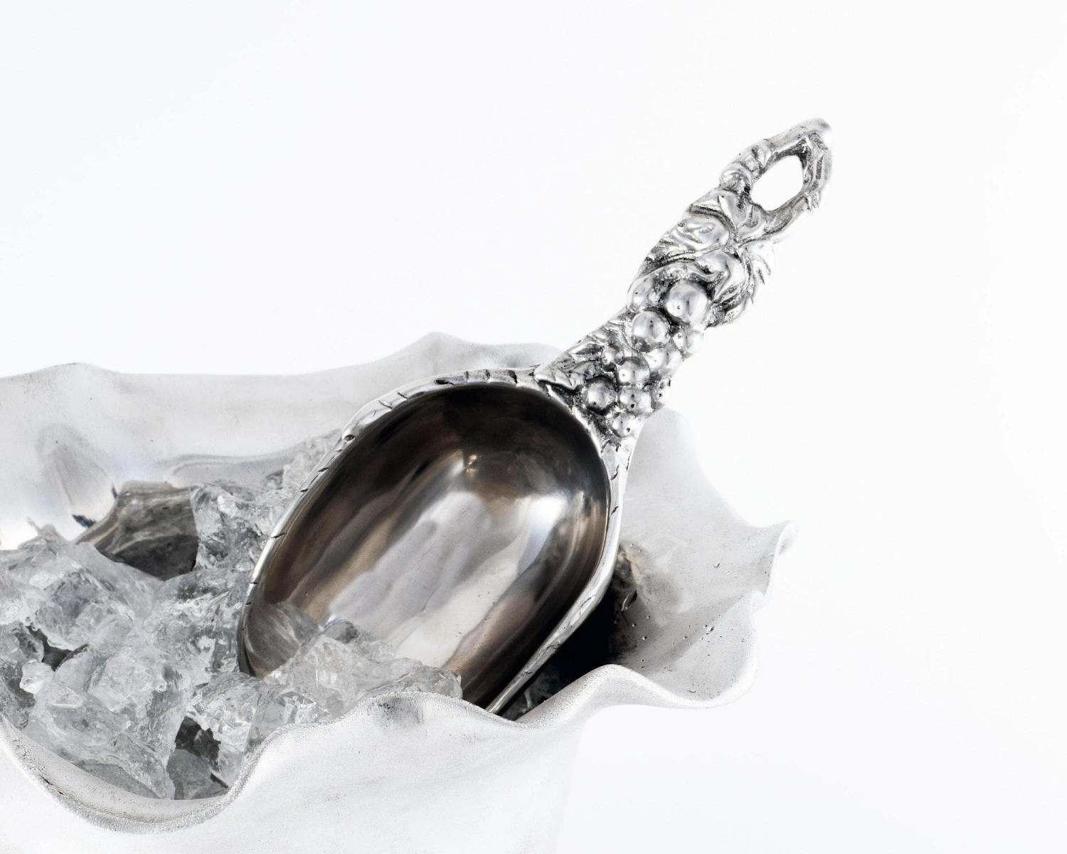 The grape motif of this practical ice scoop is signature of Arthur Court. Measuring 8 inches in length, the ice scoop is created in sand-cast aluminum. Functional and decorative, it makes serving drinks easy for the fastidious host or hostess. The handle is long enough to insure a firm grip.