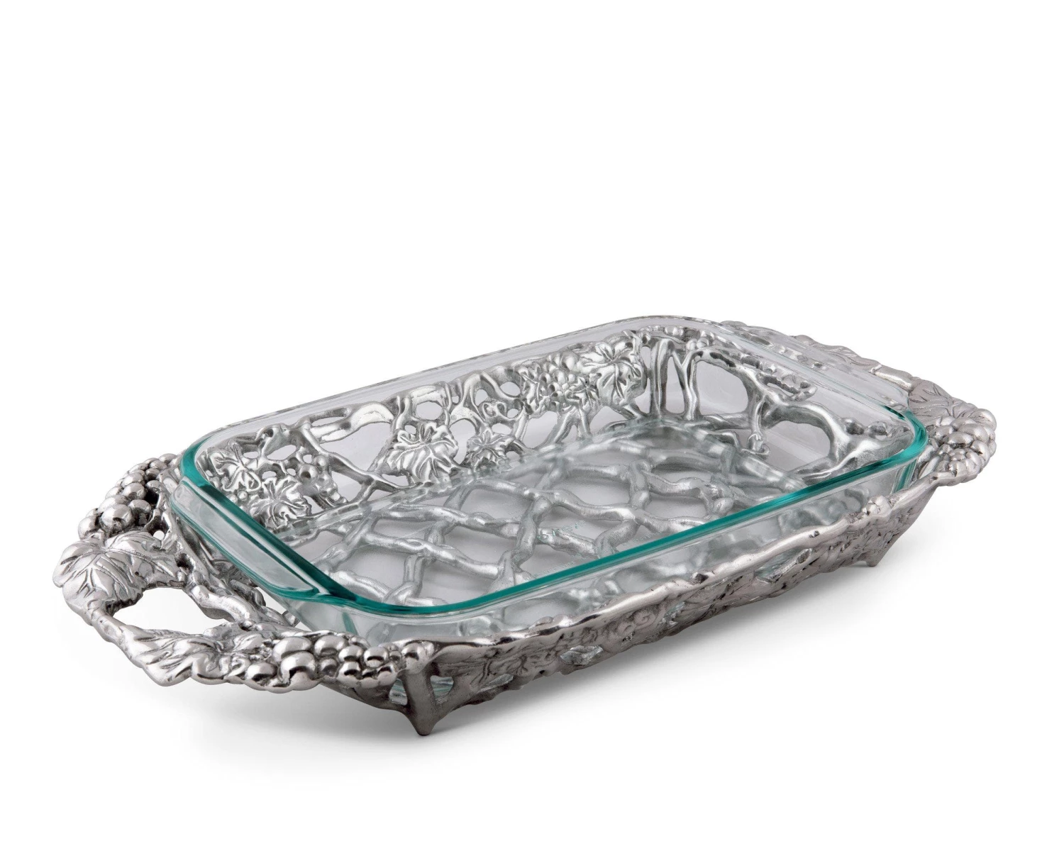 Vines form a chain-link pattern on the base before winding around the rest of this piece. Bundles of intricate grapes mix with veiny leaves to create gapped handles on opposite sides. This handmade, aluminum holder shelters the removable, dishwasher-safe Pyrex.