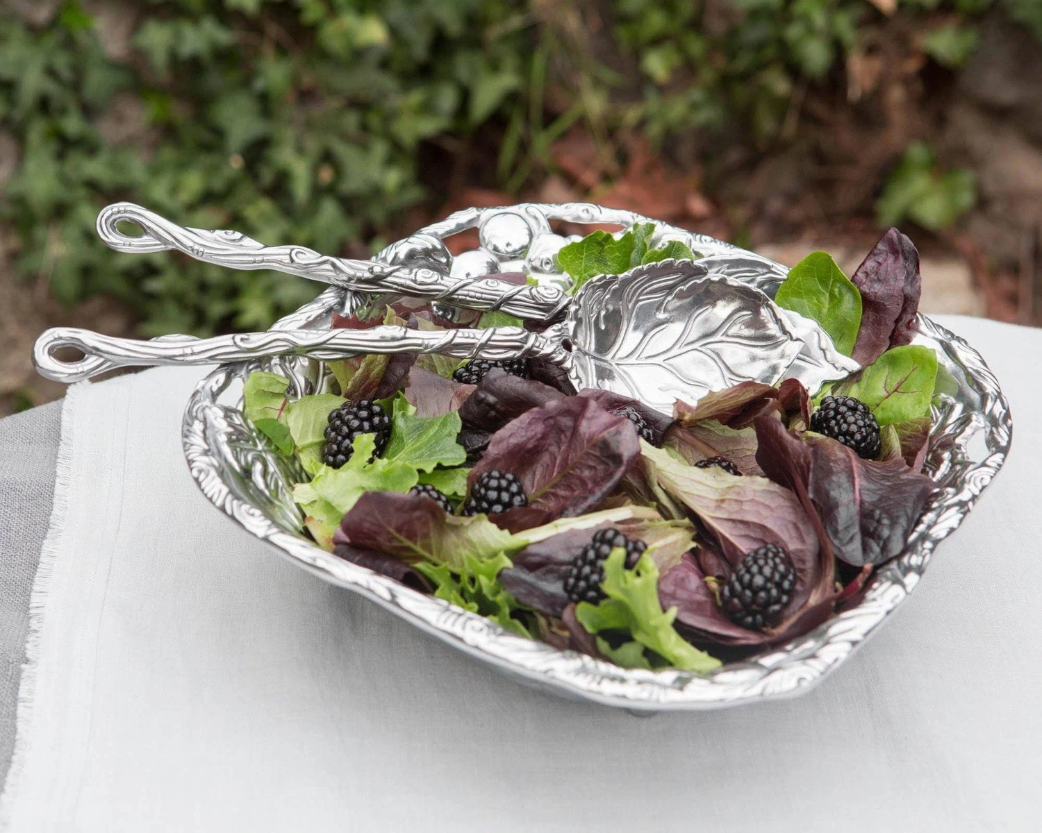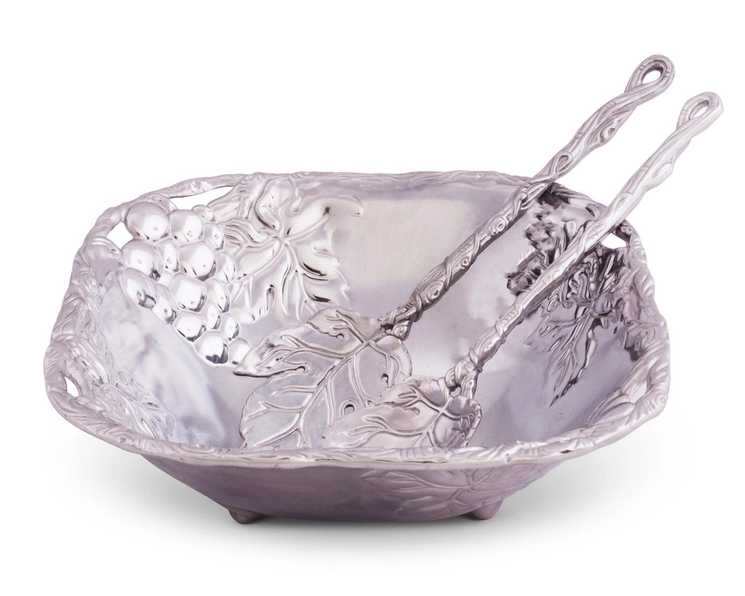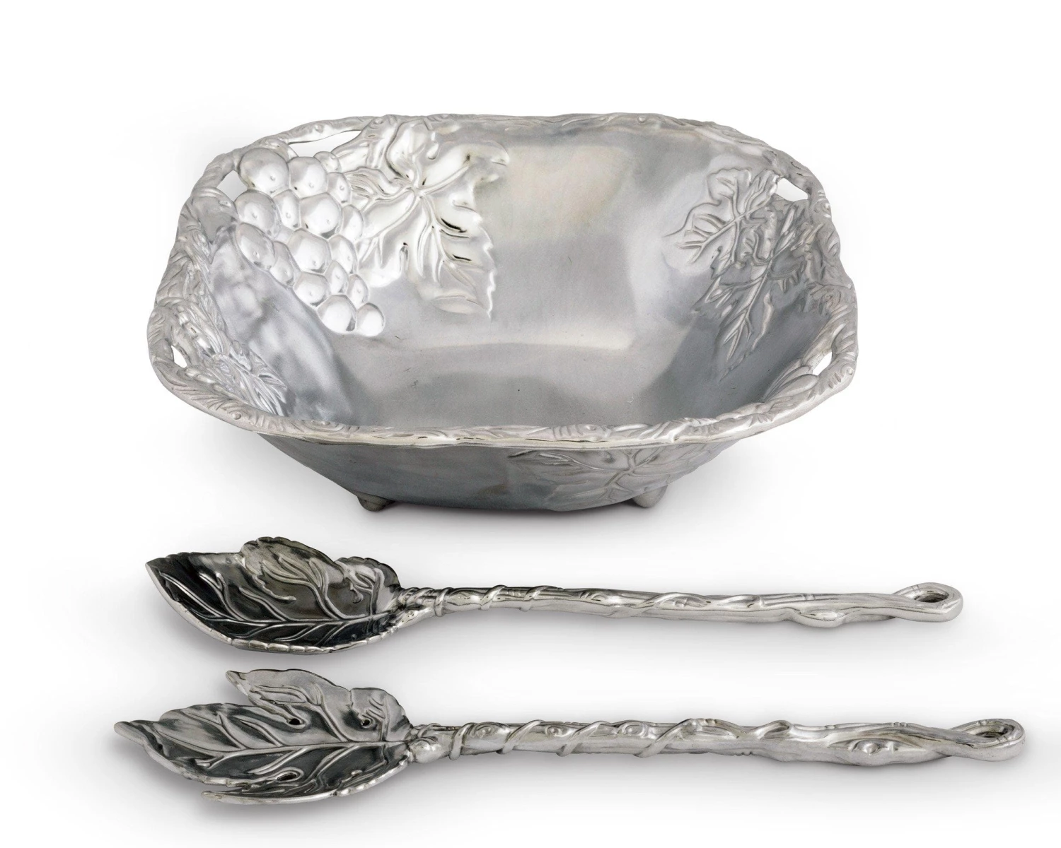 This Arthur Court 3-piece salad set is perfect for serving salad for two, or for a side dish. The bowl, with its medium capacity and square silhouette, has a mirror-like finish in the center, and beautifully detailed grapevine fretwork which graces the edge
