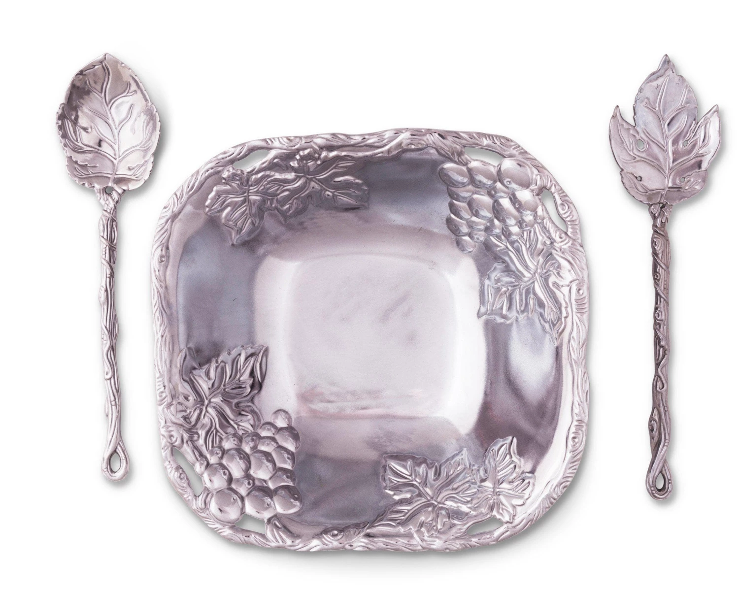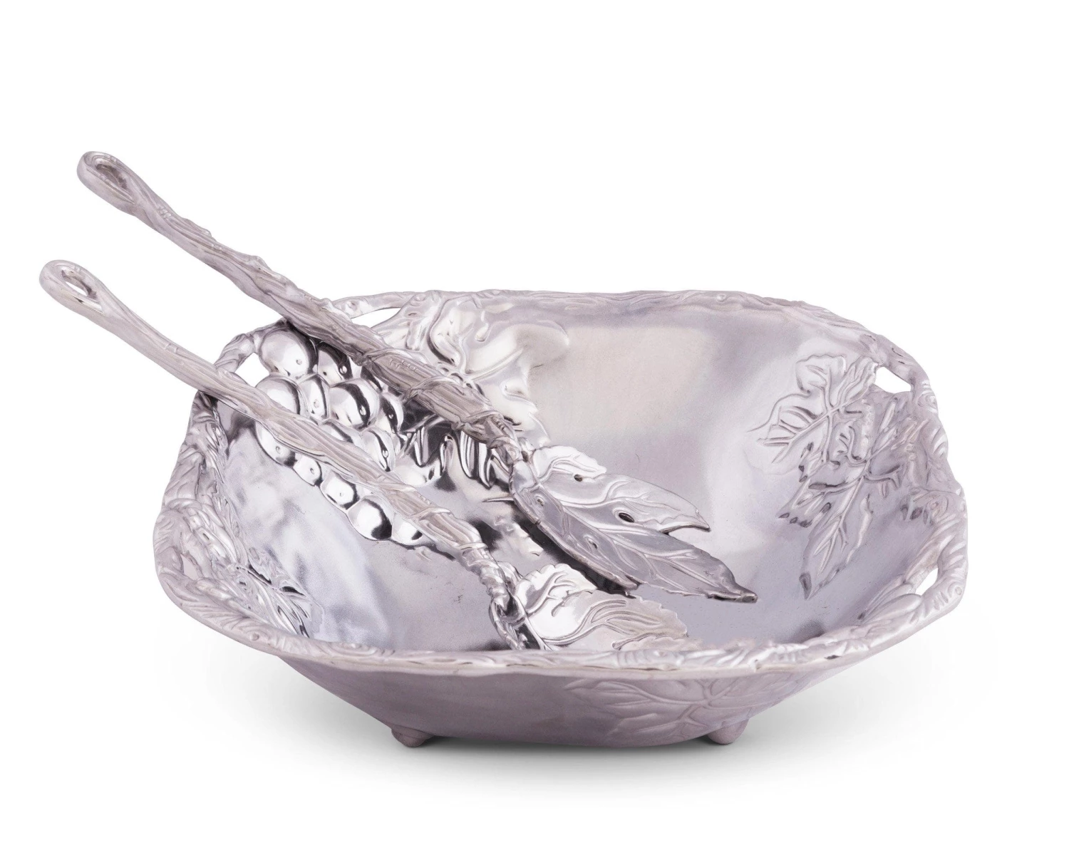 Bundles of grapes and foliage line the interior of the handmade, aluminum bowl, while vines create an openwork edge. A veiny, detailed leaf forms the head of each server as vines twist and overlap into unique handles.